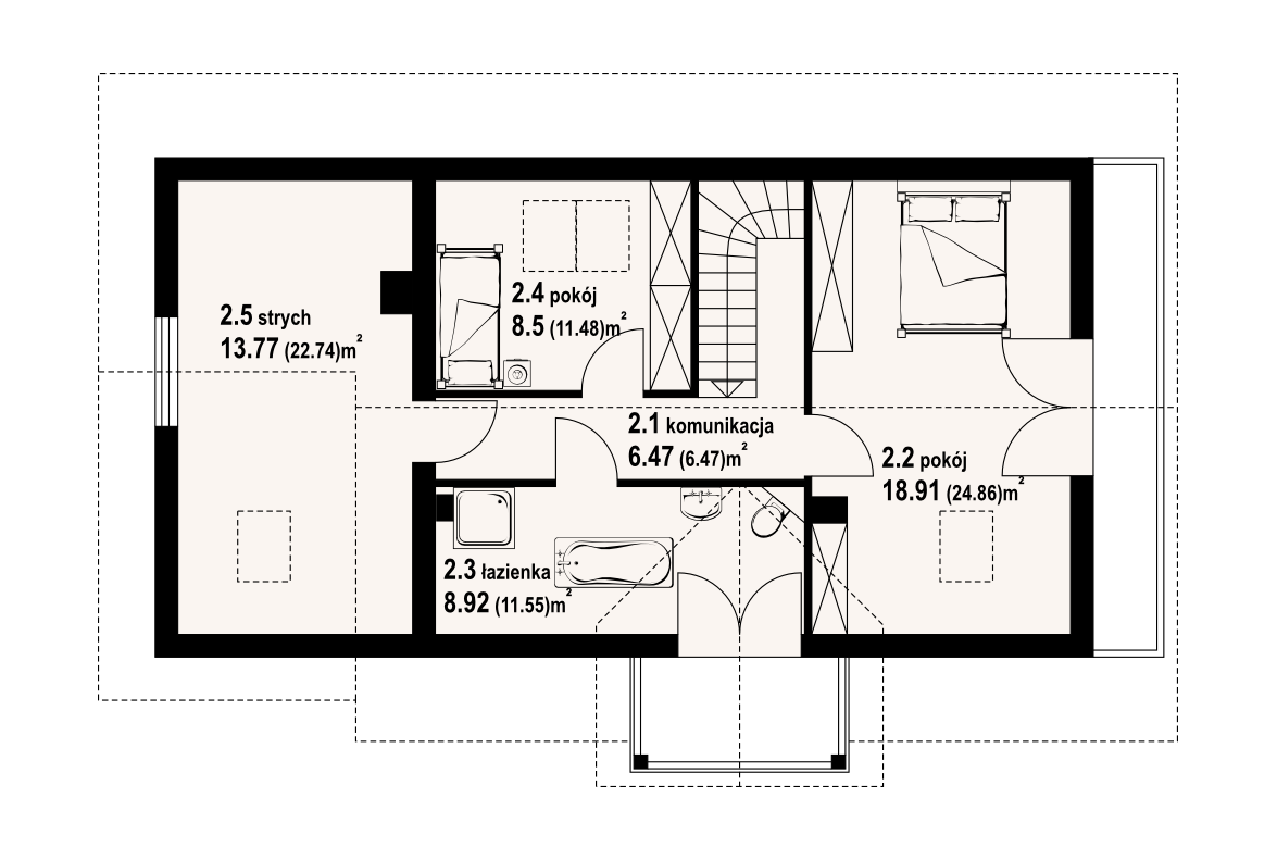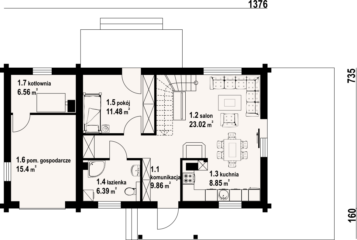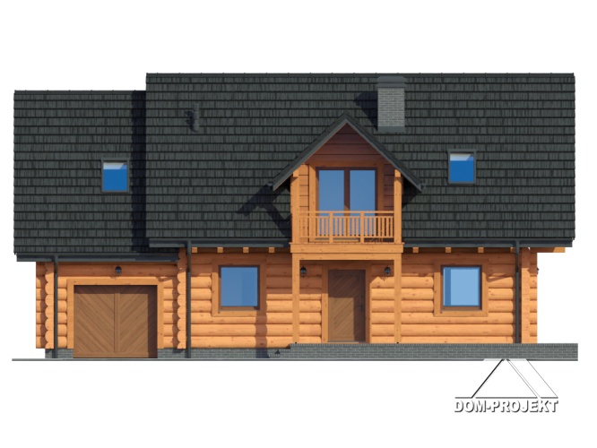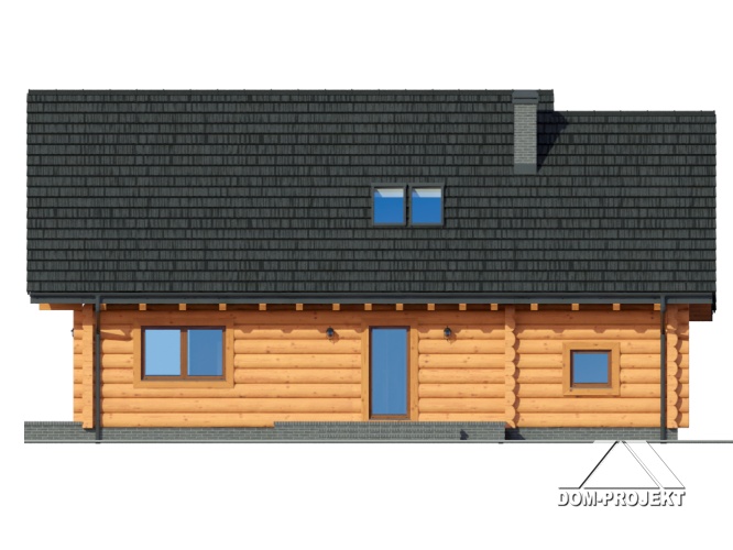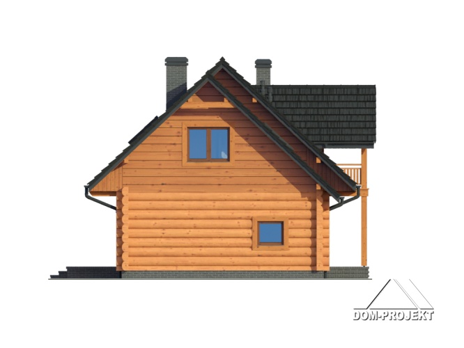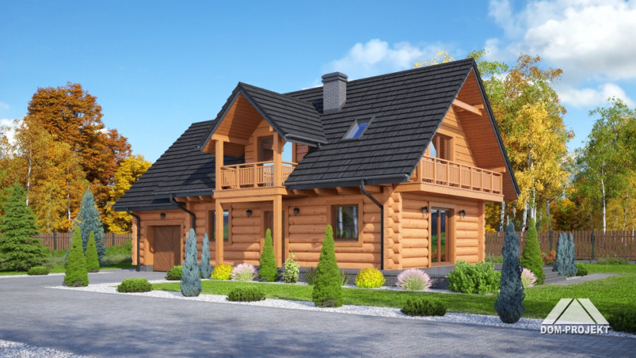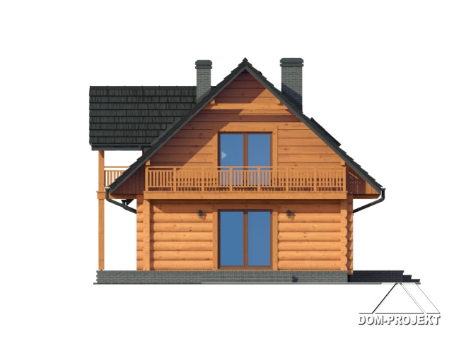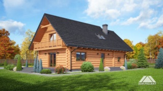 Dom z bali drewnianych. Duży salon z aneksem kuchennym, kominkiem, wyjściem na taras i schodami na poddasze. Pokój, łazienka, komunikacja, łazienka, pomieszczenie gospodarcze i kotłownia. Na poddaszu dwa pokoje, łazienka, strych i komunikacja. Zwarte bryła budynku i dach dwuspadowy sprzyjają szybkiej i taniej budowie oraz niskim kosztom eksploatacji.