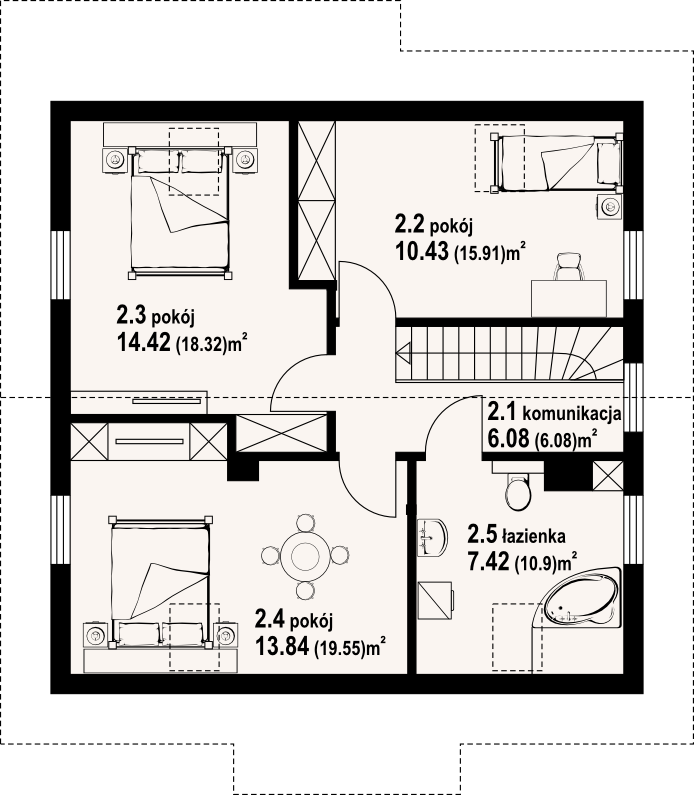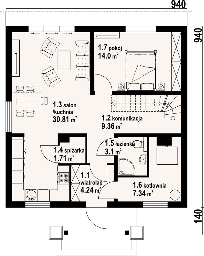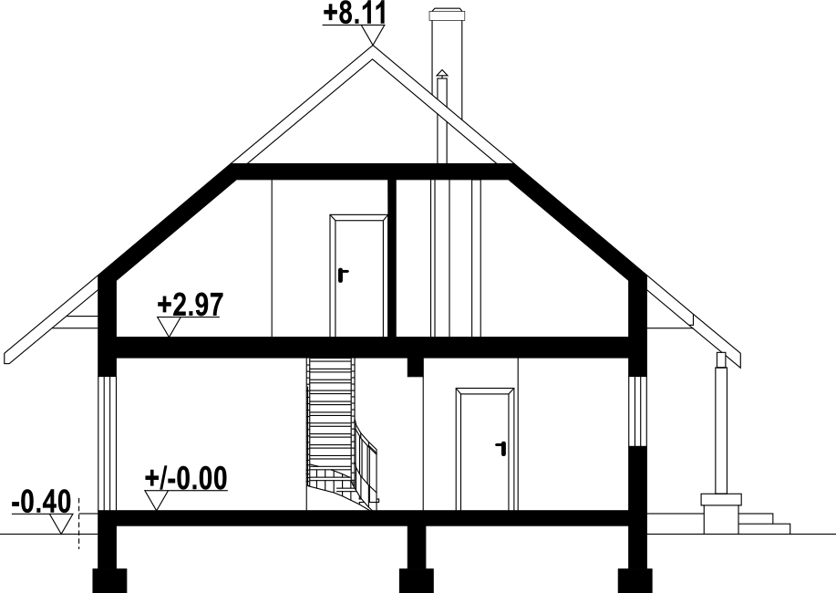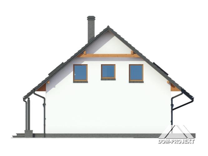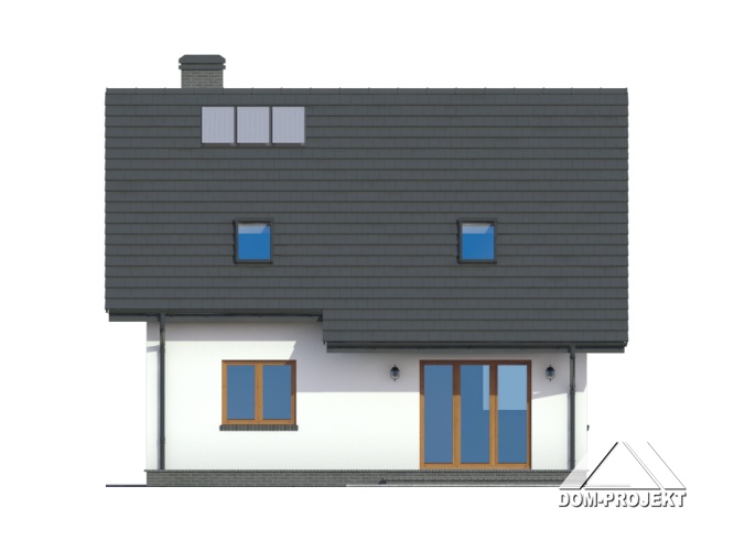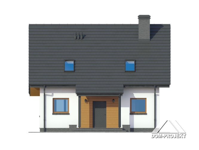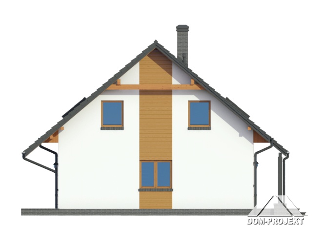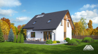 Dom w konstrukcji szkieletu drewnianego. Duży salon z aneksem kuchennym i wyjściem na taras. Pokój, łazienka, spiżarka, kotłownia i wiatrołap. Na poddaszu trzy pokoje, łazienka i komunikacja. Zwarte bryła budynku i dach dwuspadowy sprzyjają szybkiej i taniej budowie oraz niskim kosztom eksploatacji.