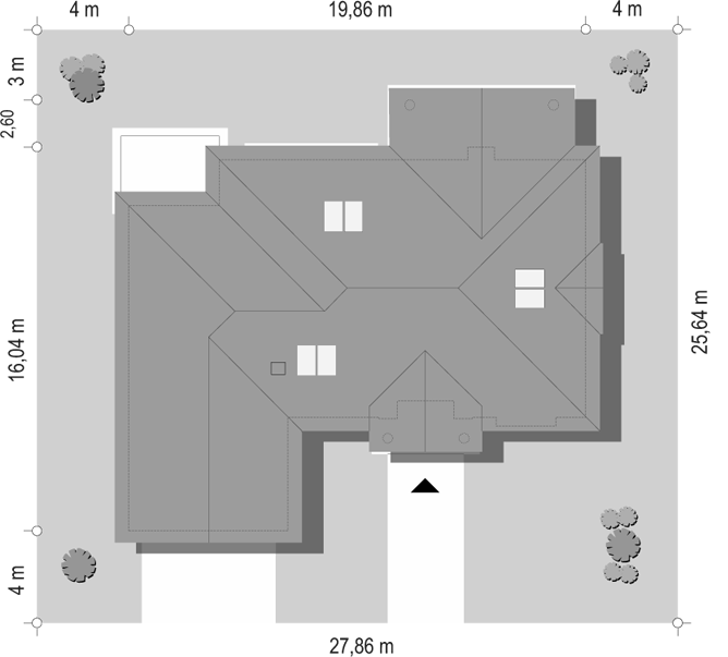 Dom w konstrukcji szkieletu drewnianego. Duży salon z aneksem kuchennym, wyjściem na zadaszony taras i schodami na poddasze, pokój, łazienka, kotłownia i komunikacja. Na poddaszu trzy pokoje, łazienka, komunikacja i balkon.Zwarta bryła budynku i dach dwuspadowy sprzyjają szybkiej i taniej budowie i niskim kosztom eksploatacji.