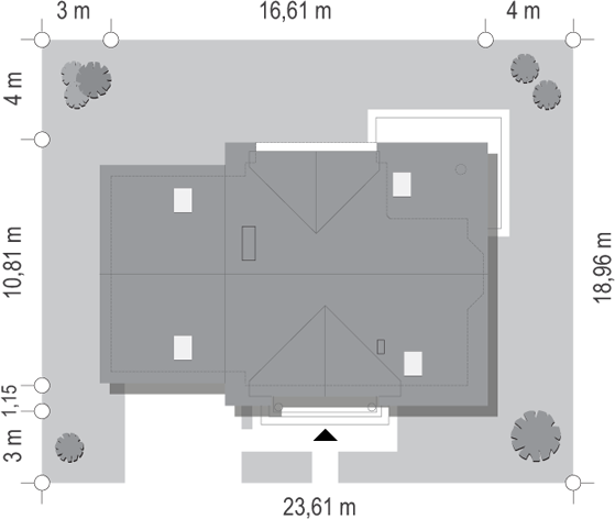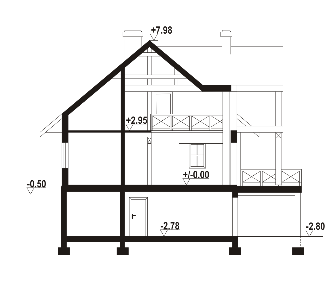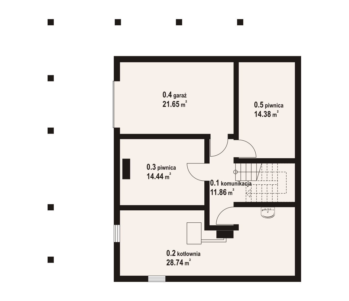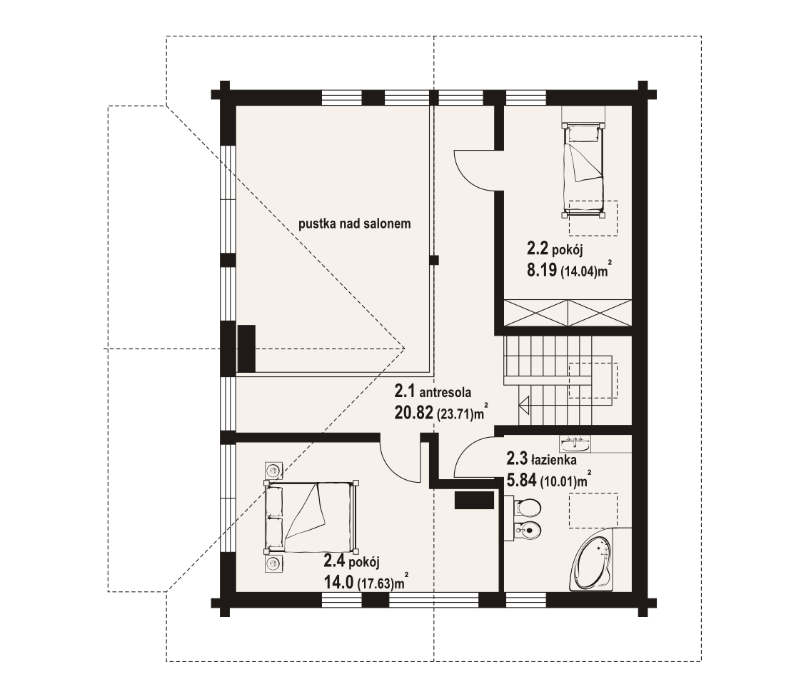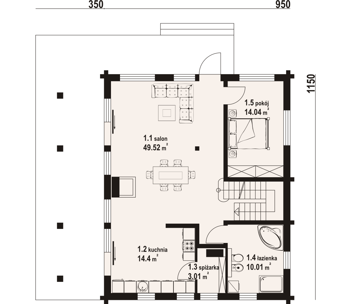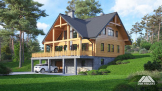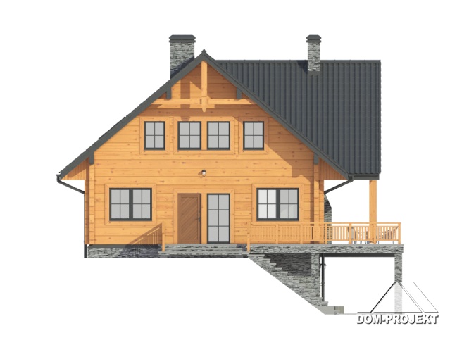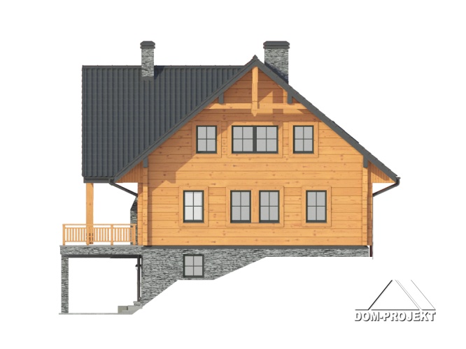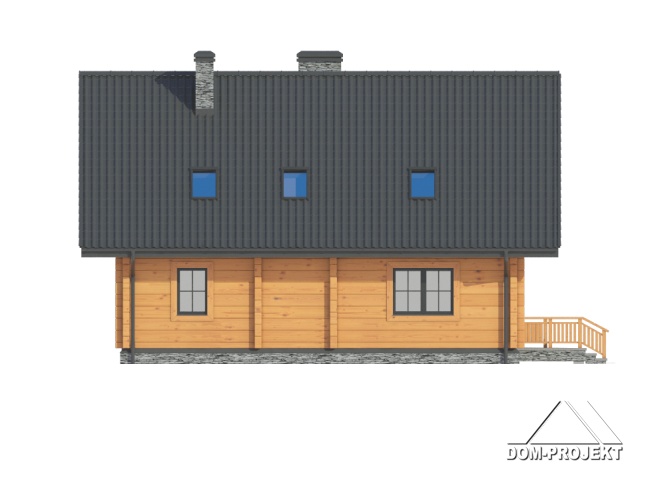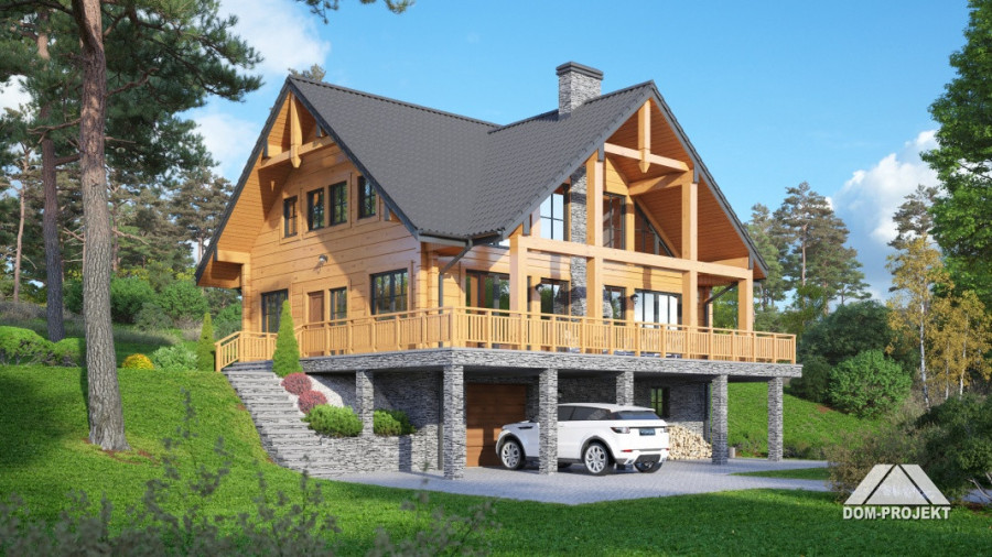 Dom z bali drewnianych. Podpiwniczony. Duży salon z aneksem kuchennym, kominkiem i wyjściami na zadaszony taras. Pokój, łazienka i spiżarka. Na poddaszu dwa pokoje, łazienka, komunikacja i antresola. W piwnicach garaż, kotłownia , piwnice i komunikacja.