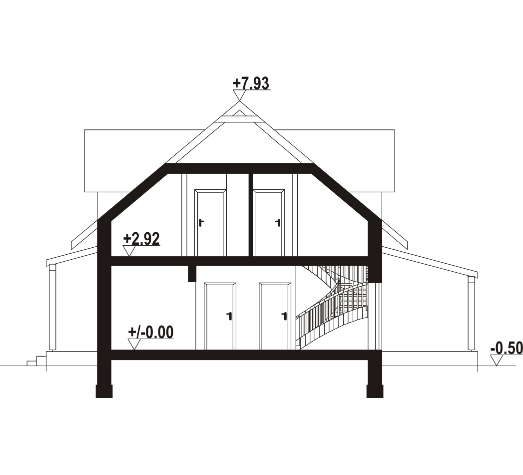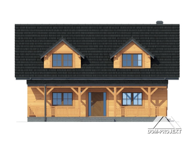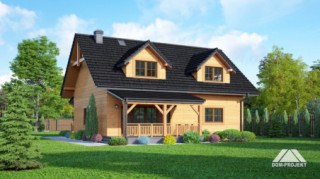 Dom murowany wykończony z zewnątrz drewnem. Duży salon z aneksem kuchennym ,wyjściem na zadaszony taras i schodami na poddasze. Pokój, łazienka, wiatrołap i pomieszczenie gospodarcze. Na poddaszu trzy pokoje, łazienka i garderoba. Zwarta bryła budynku i dach dwuspadowy sprzyjają szybkiej i taniej budowie i niskim kosztom eksploatacji.