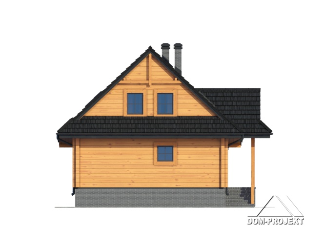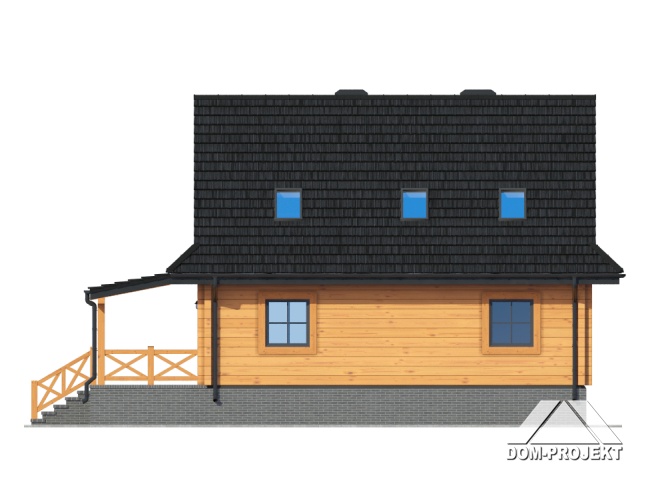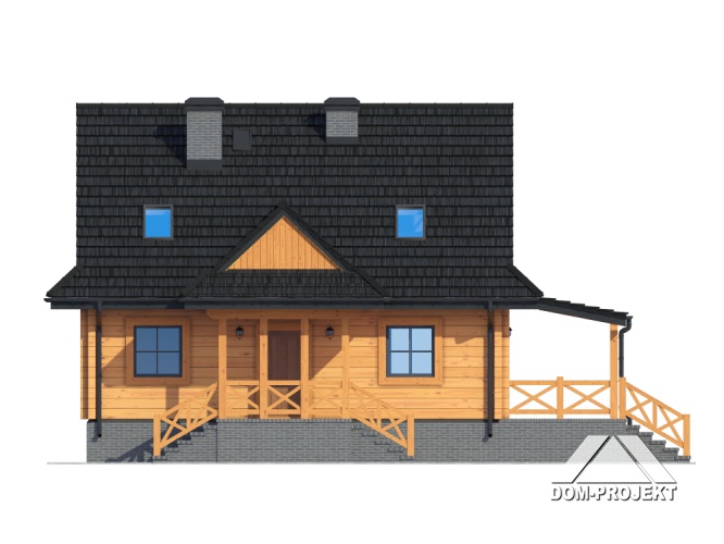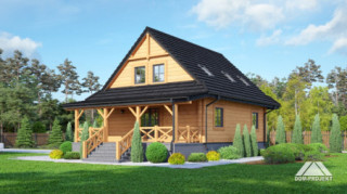 Dom z bali drewnianych. Podpiwniczony. Duży salon z aneksem kuchennym, kominkiem, wyjściem na zadaszony taras i schodami. Pokój, wiatrołap, łazienka, garderoba. Na poddaszu trzy pokoje, łazienka i komunikacja. Zwarta bryła budynku i dach dwuspadowy sprzyjają szybkiej i taniej budowie i niskim kosztom eksploatacji.