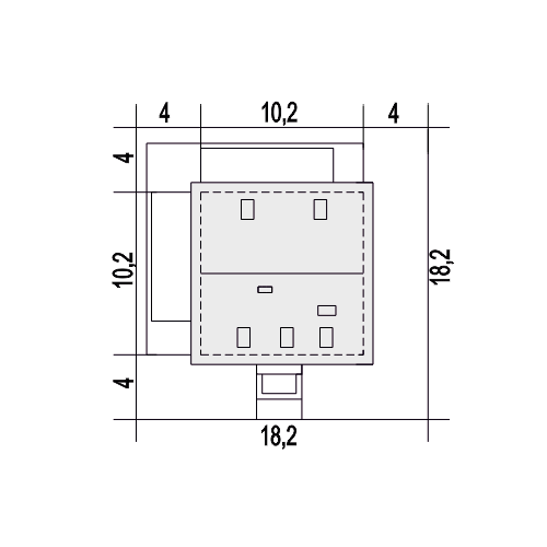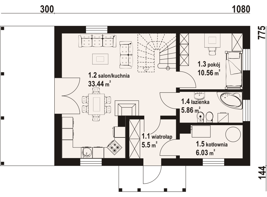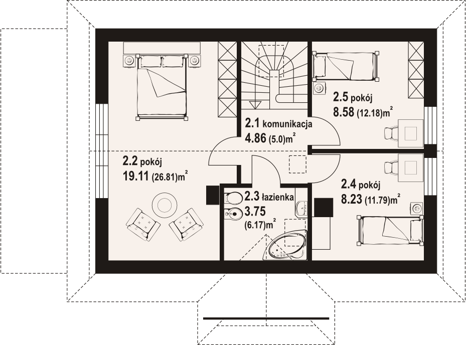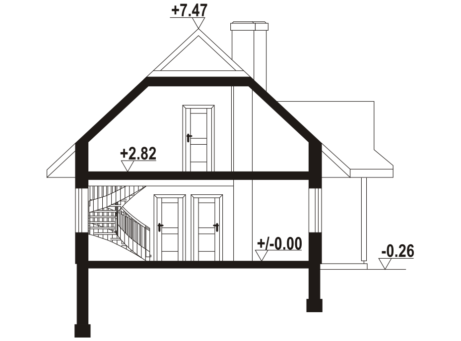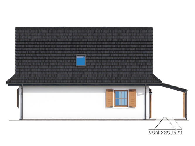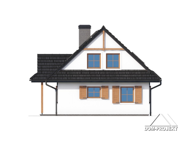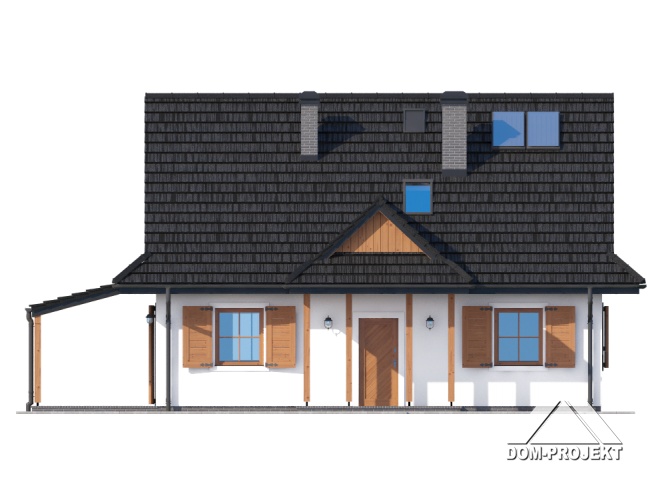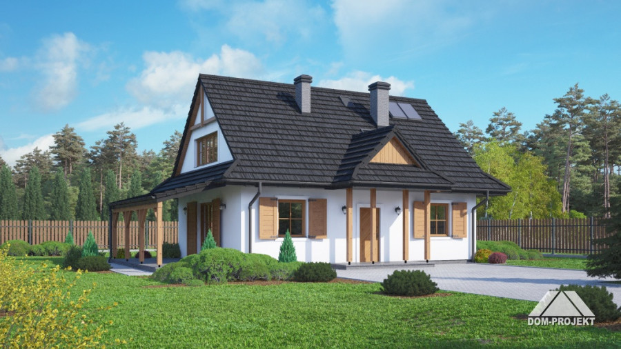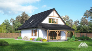 Dom z poddaszem. Duży salon z aneksem kuchennym, kominkiem, schodami na poddasze i wyjściem na zadaszony taras. Pokój, łazienka, wiatrołap i kotłownia. Na poddaszu trzy pokoje, łazienka i komunikacja. Zwarta bryła budynku i dach dwuspadowy sprzyjają szybkiej i taniej budowie i niskim kosztom eksploatacji.