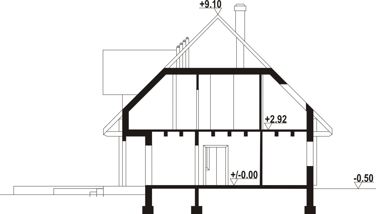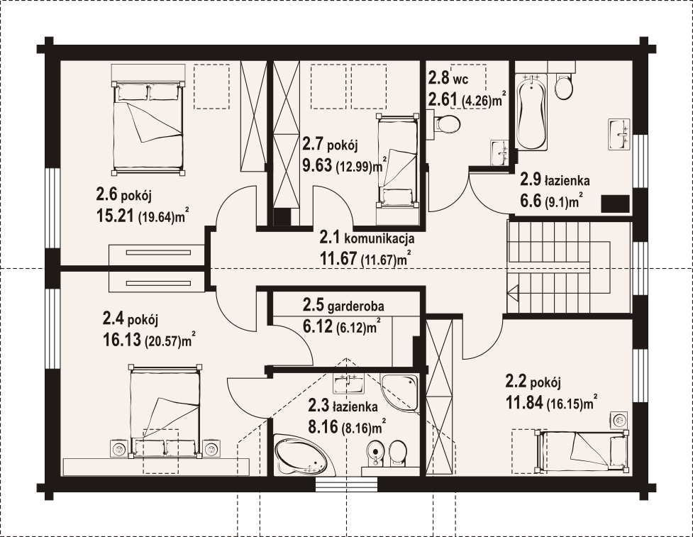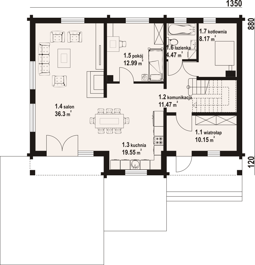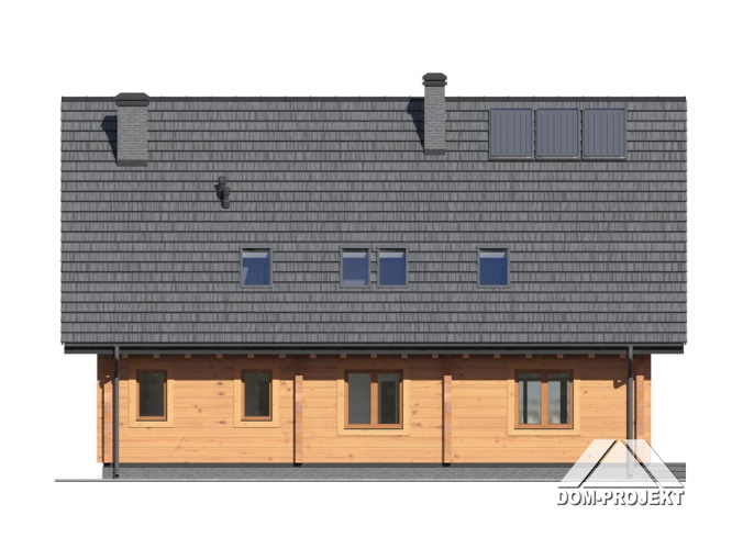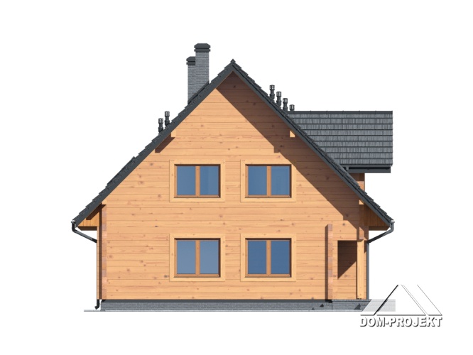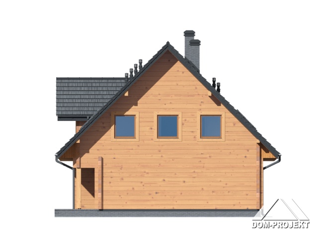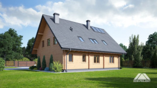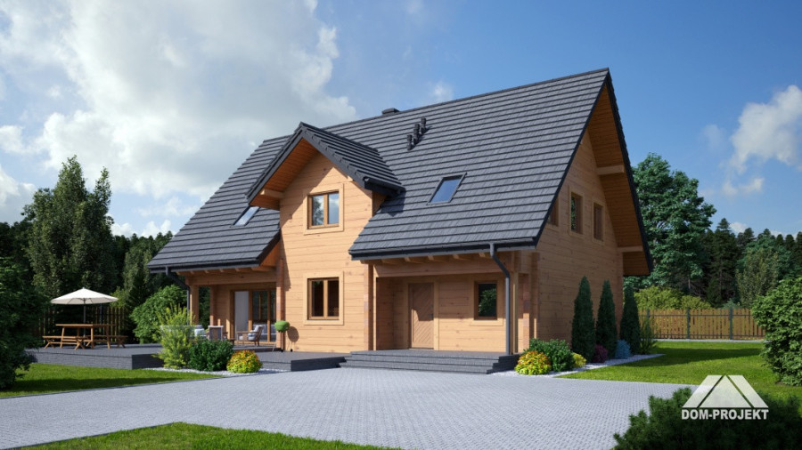 Dom z bali. Duży salon z aneksem kuchennym, kominkiem i wyjściem na taras. Pokój łazienka, komunikacja, wiatrołap i kotłownia. Na poddaszu trzy pokoje, dwie łazienki, wc, garderoba i komunikacja. Zwarta bryła budynku i dach dwuspadowy sprzyjają szybkiej i taniej budowie oraz niskim kosztom eksploatacji.