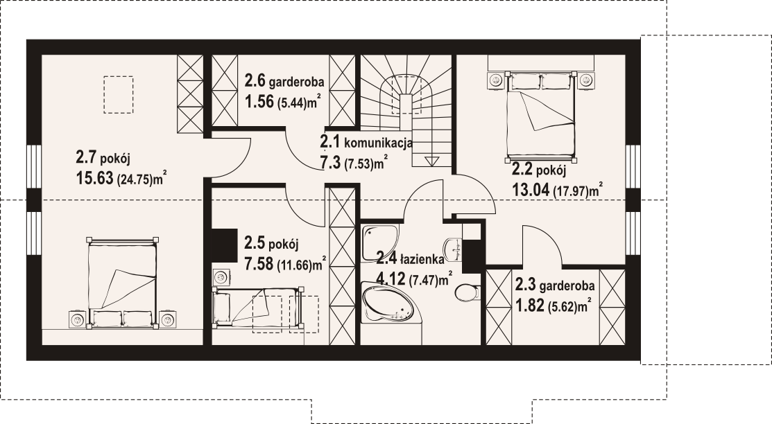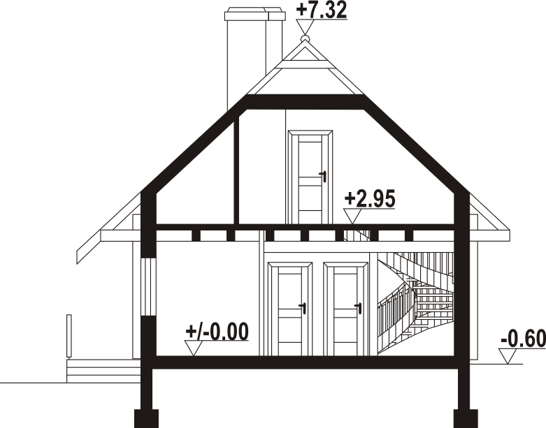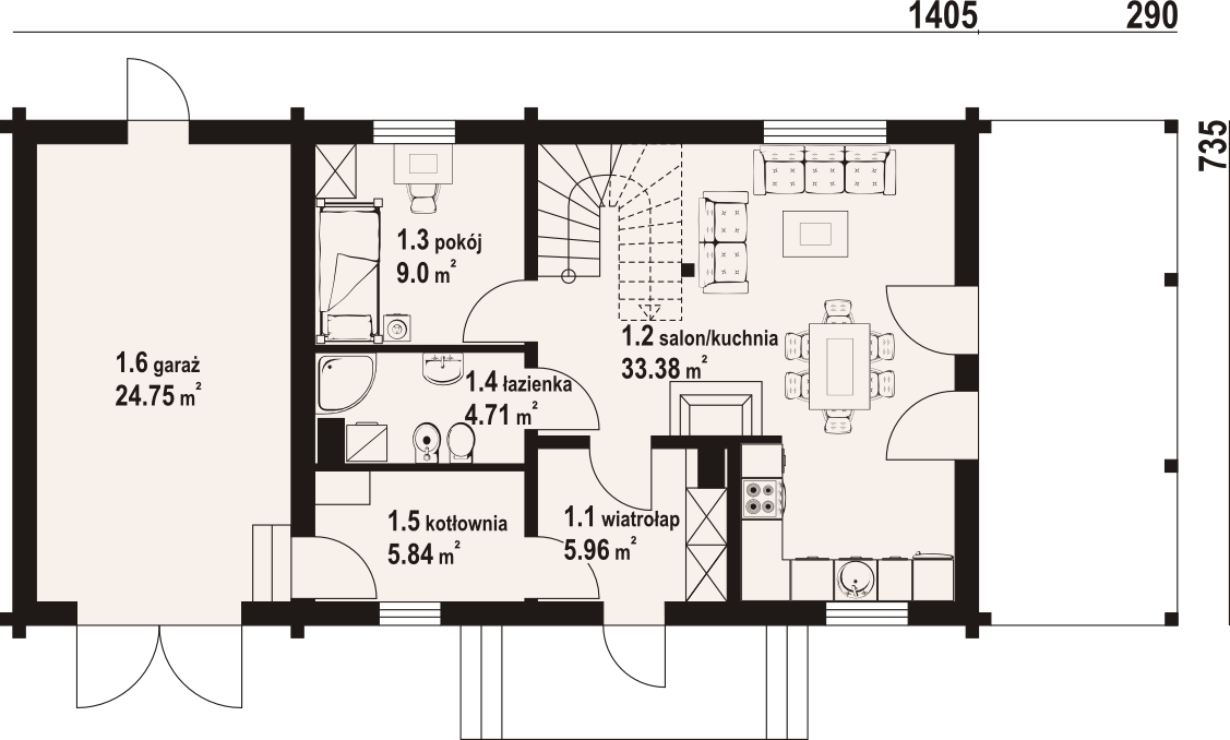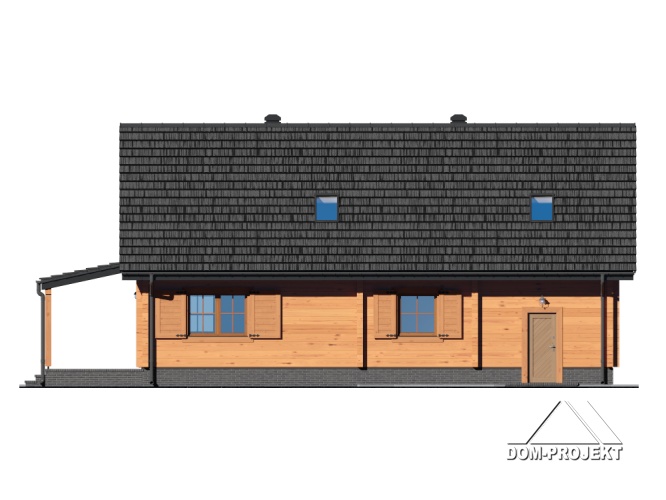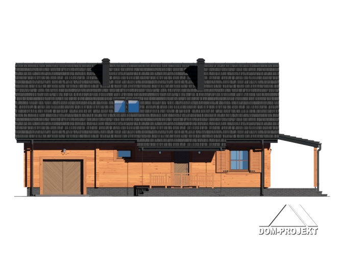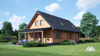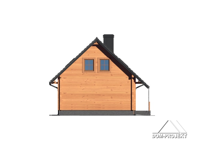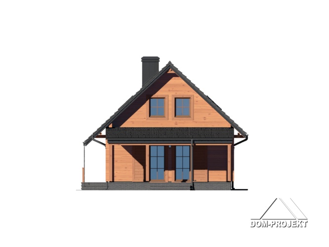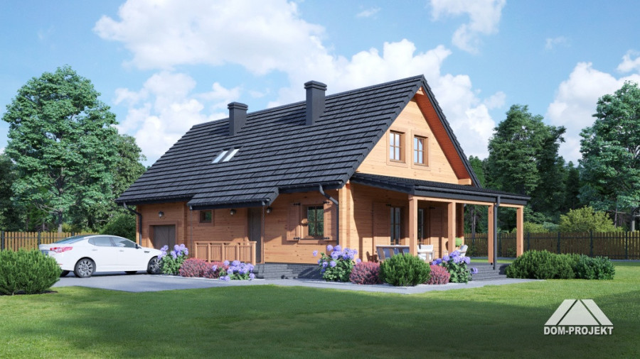 Dom z bali. Duży salon z aneksem kuchennym, kominkiem, wyjściem na zadaszony taras i schodami na poddasze. Pokój, łazienka, wiatrołap, kotłownia i garaż. Na poddaszu trzy pokoje, dwie garderoby łazienka i komunikacja. Zwarta bryła budynku i dach dwuspadowy sprzyjają szybkiej i taniej budowie i niskim kosztom eksploatacji.
