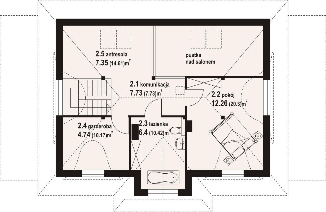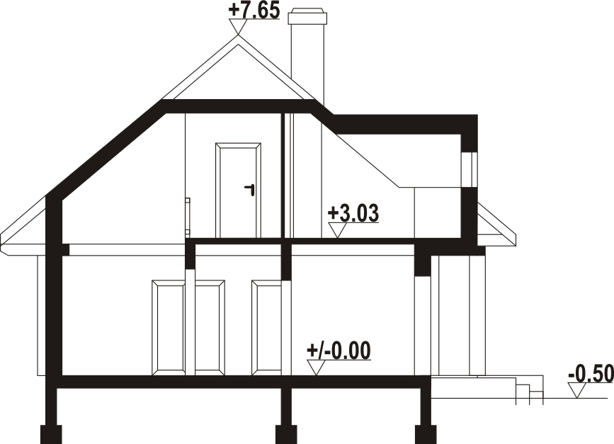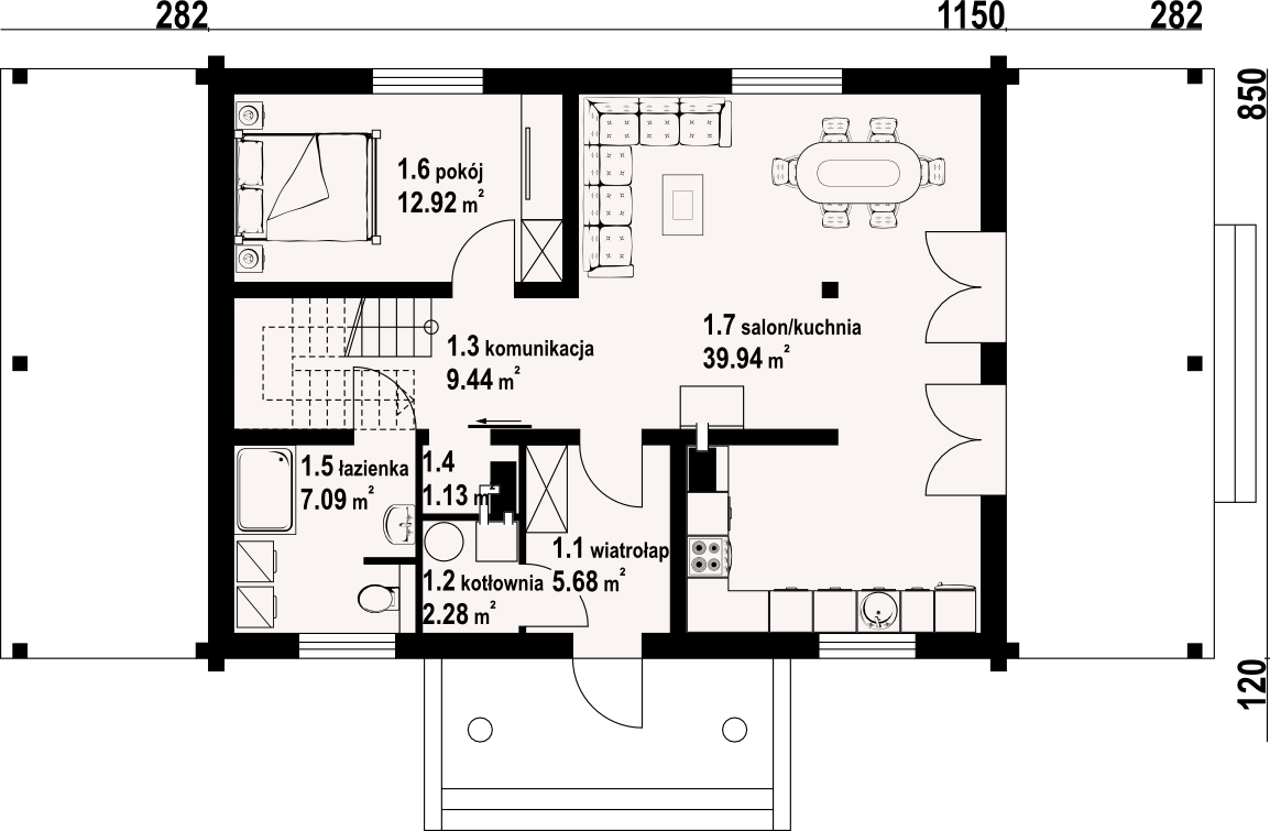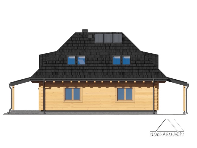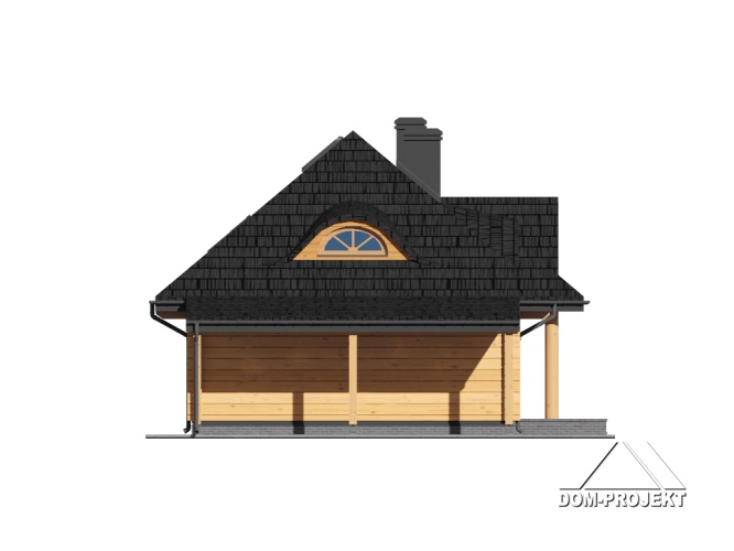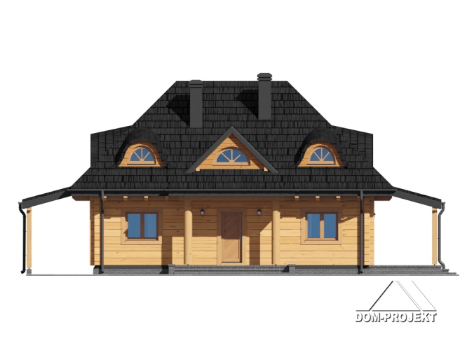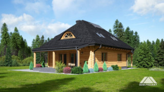 Dom z bali. Duży salon z aneksem kuchennym, kominkiem i wyjściami na zadaszony taras. Pokój, łazienka, pomieszczenie gospodarcze i kotłownia (gaz). Na poddaszu pokój, łazienka, garderoba, antresola i komunikacja.