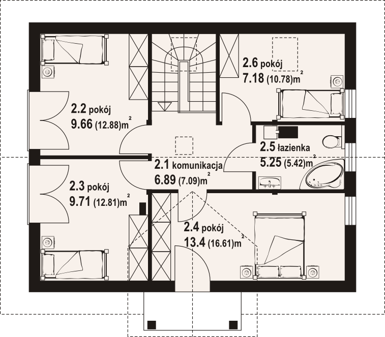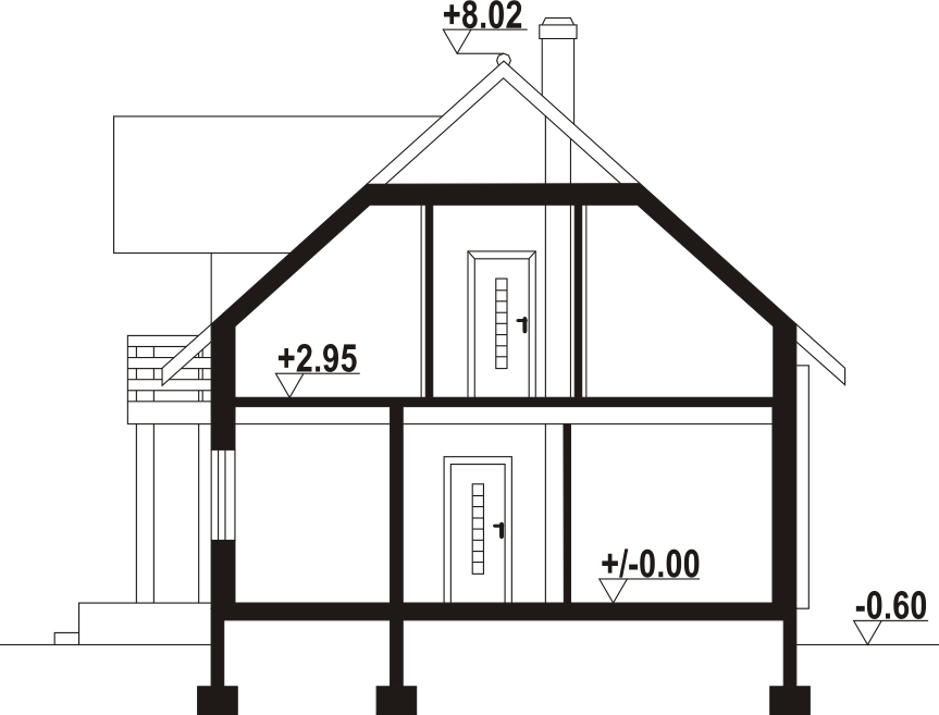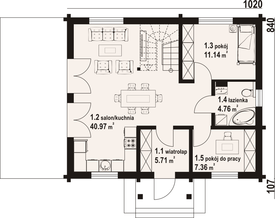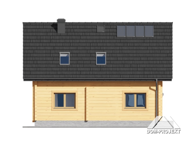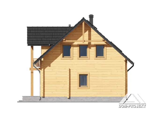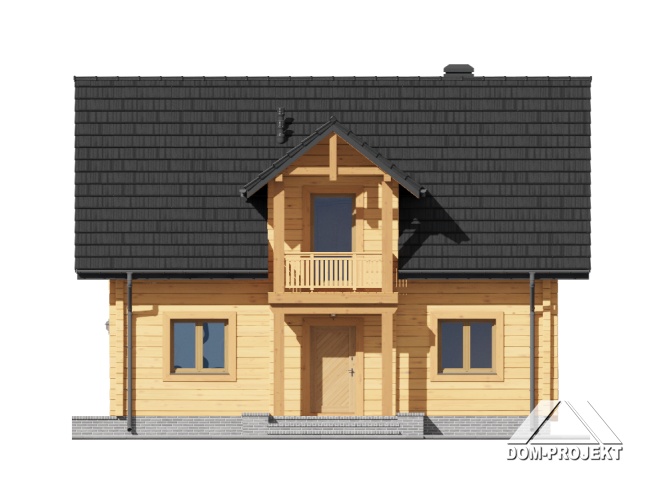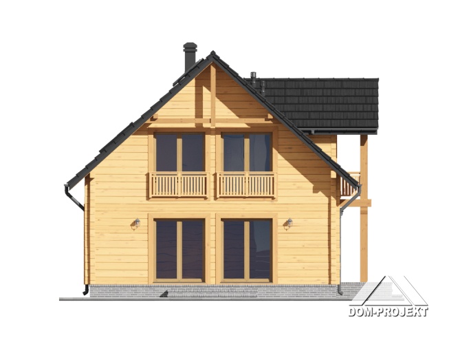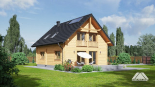 Dom z bali. Duży salon z aneksem kuchennym, wyjściami na taras i schodami na poddasze. Dwa pokoje, łazienka i wiatrołap. Na poddaszu cztery pokoje, łazienka, komunikacja i balkon. Zwarta bryła budynku i dach dwuspadowy sprzyjają szybkiej i taniej budowie i niskim kosztom eksploatacji.
