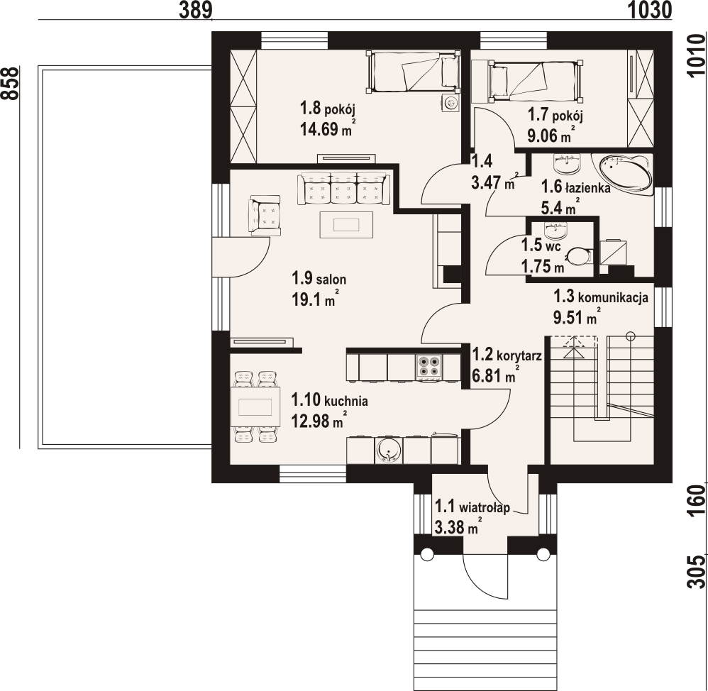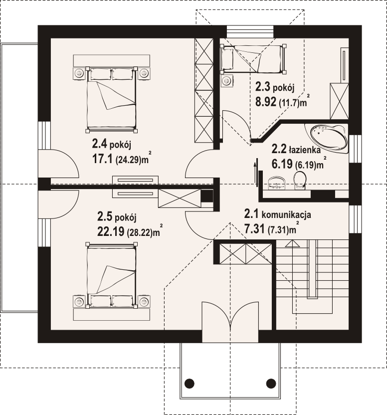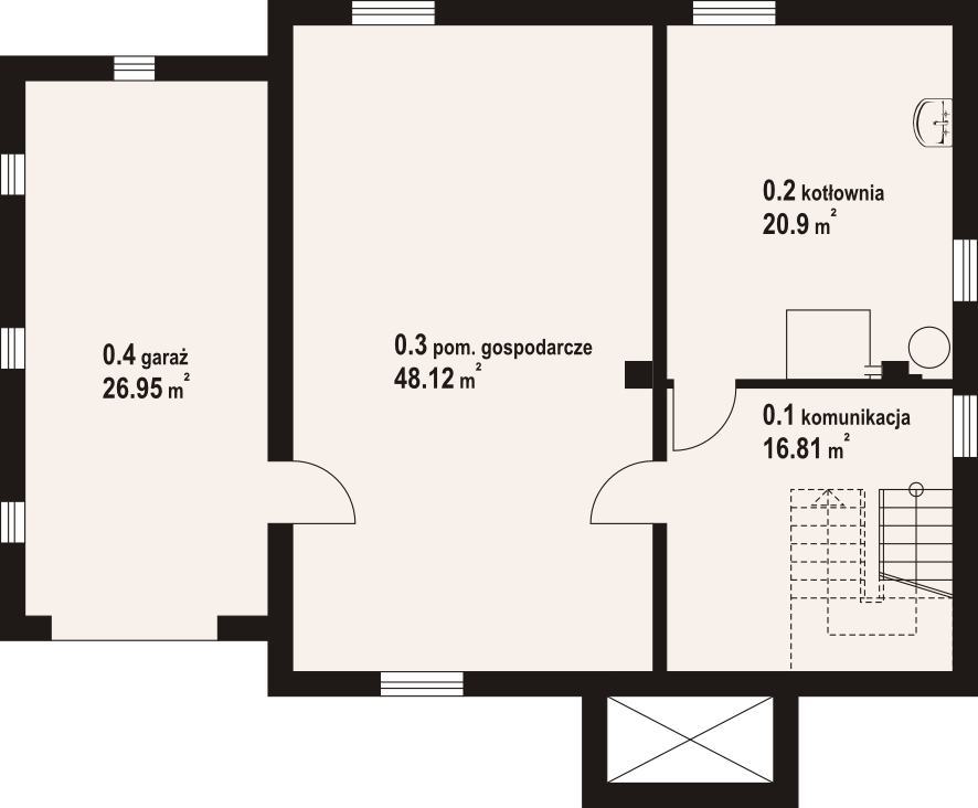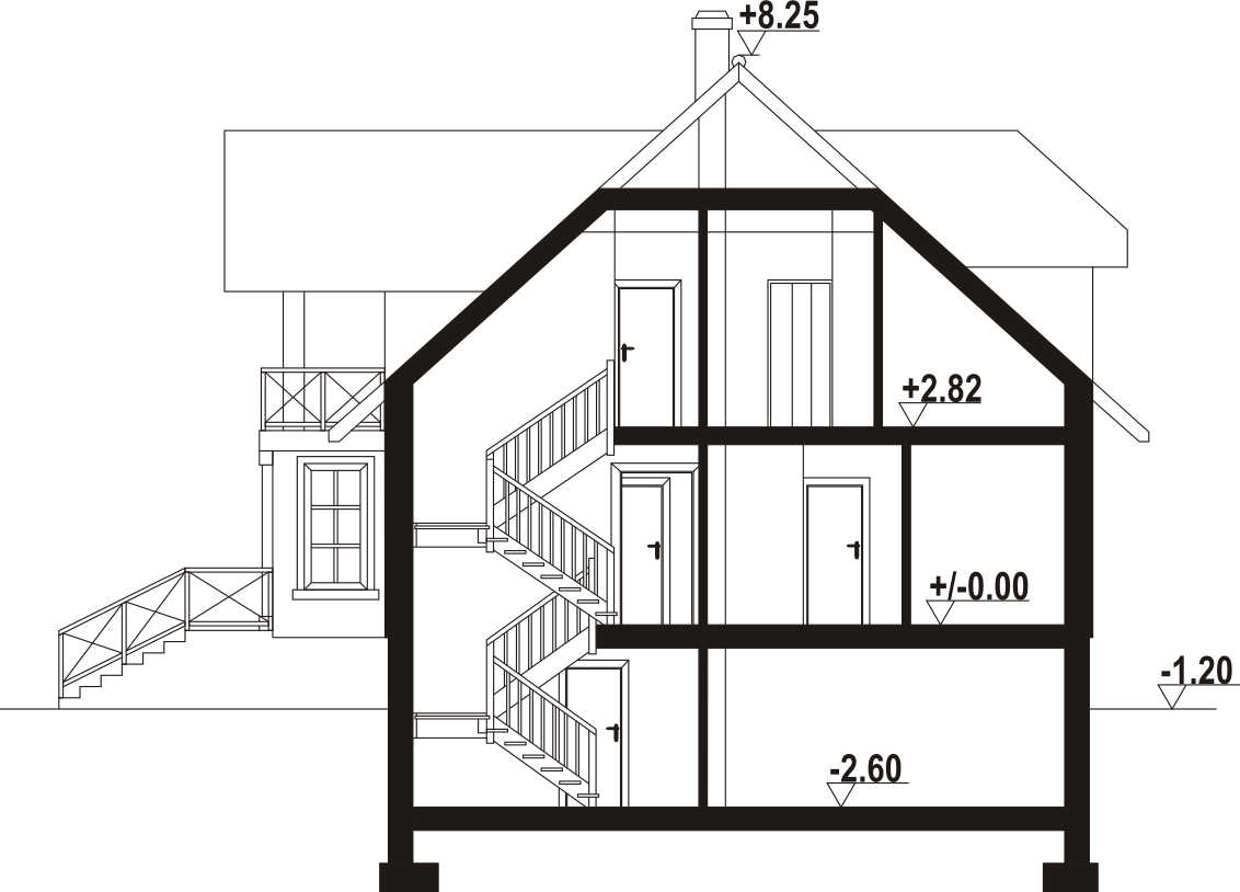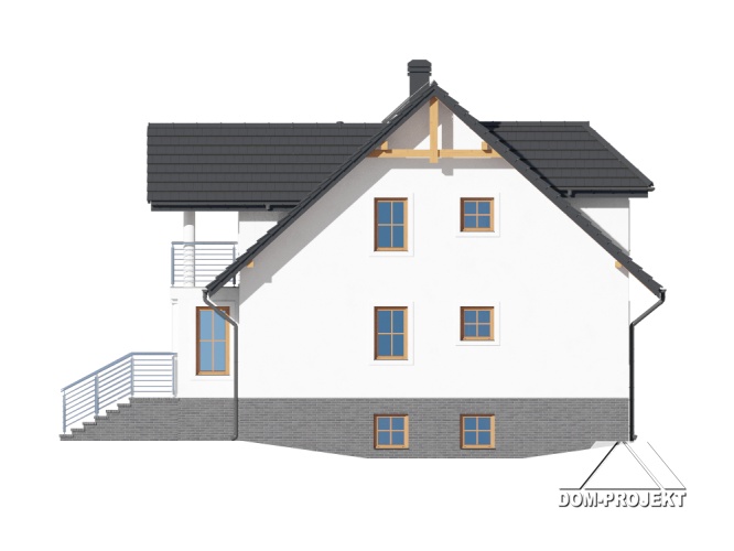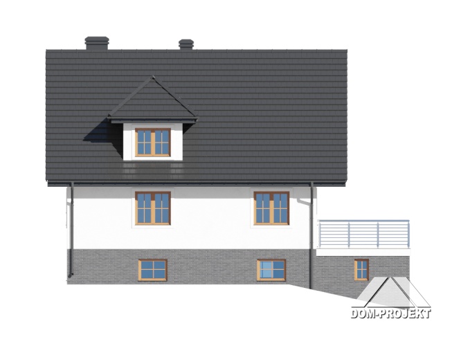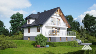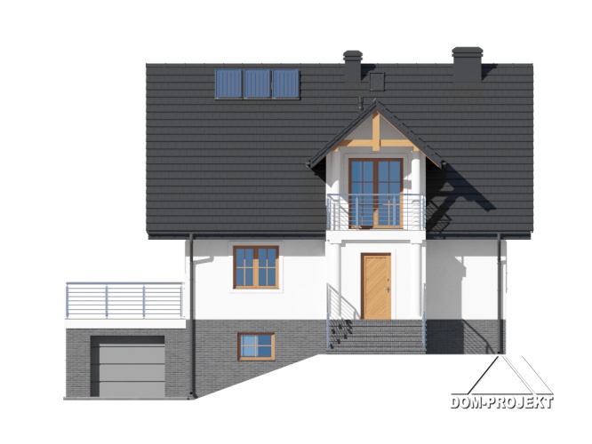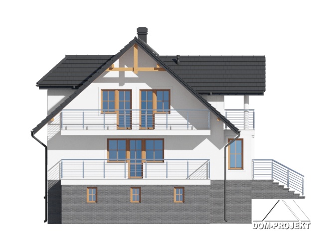 Dom z piwnicami. Salon z wyjściem na duży taras, kominkiem i przejściem do kuchni. Dwa pokoje, łazienka, wc, korytarz, komunikacja, wiatrołap. Na poddaszu trzy pokoje, łazienka, komunikacja i dwa balkony. W piwnicach kotłownia, pomieszczenie gospodarczy i garaż. Instalacja solarna.