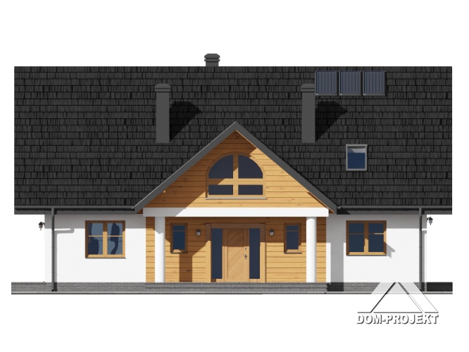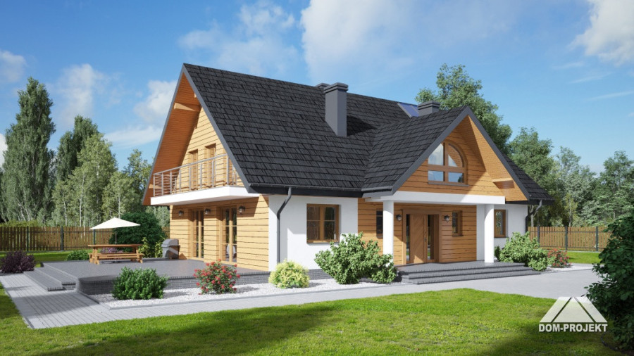 Dom z poddaszem. Duży salon z aneksem kuchennym, kominkiem i wyjściem na taras. Pokój do pracy, łazienka, komunikacja, wiatrołap i kotłownia. Na poddaszu pokój z własną łazienką i garderobą, dwa inne pokoje, łazienka, komunikacja i balkon. Instalacja solarna.