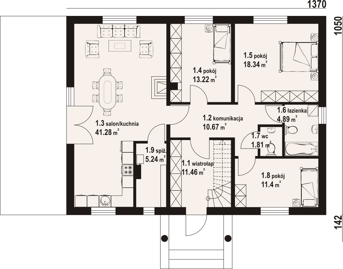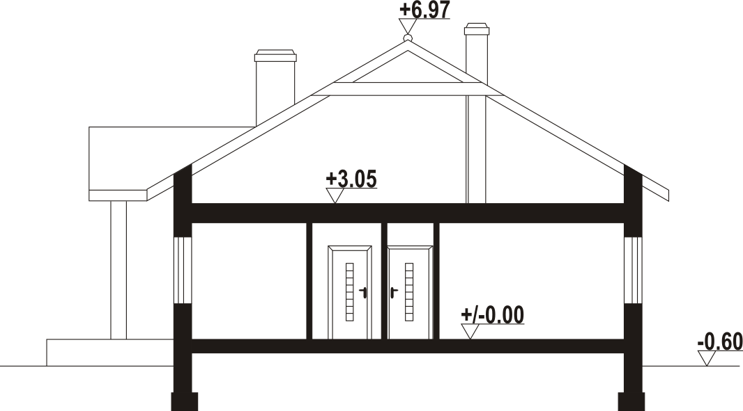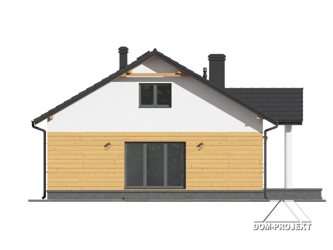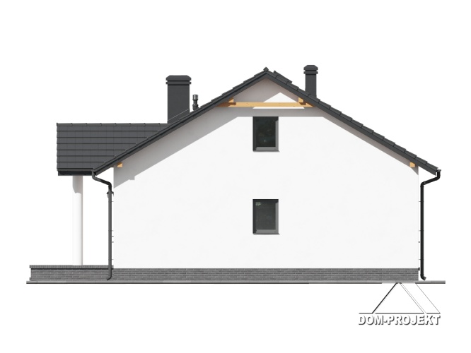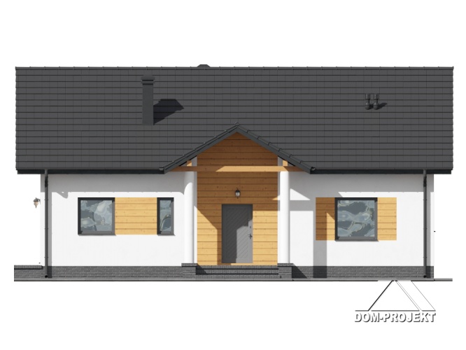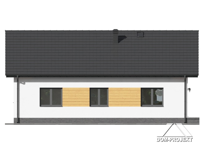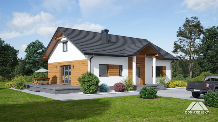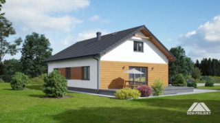 Dom parterowy. Duży salon z aneksem kuchennym, kominkiem i wyjściem na taras. Trzy pokoje, łazienka, wc, spiżarka i wiatrołap. Z wiatrołapy schody na poddasze. Na poddaszu strych. Zwarta bryła budynku i dach dwuspadowy sprzyjają szybkiej i taniej budowie i niskim kosztom eksploatacji.
