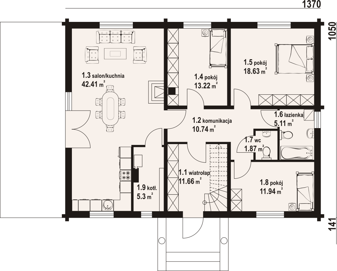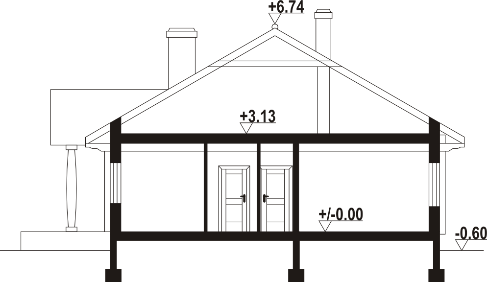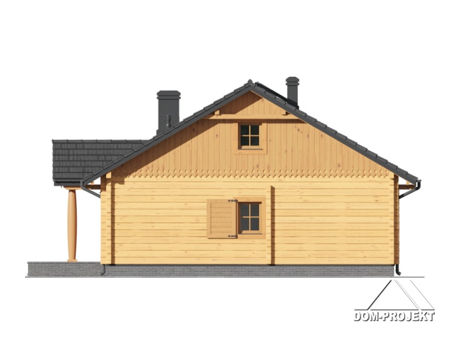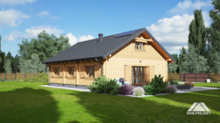 Dom z bali. Parterowy. Duży salon z aneksem kuchennym, kominkiem i wyjściem na taras. Trzy pokoje, łazienka, wc, spiżarka i wiatrołap. Z wiatrołapu schody na poddasze. Na poddaszu strych z możliwością adaptacji cele mieszkalne. Zwarta bryła budynku i dach dwuspadowy sprzyjają szybkiej i taniej budowie i niskim kosztom eksploatacji.