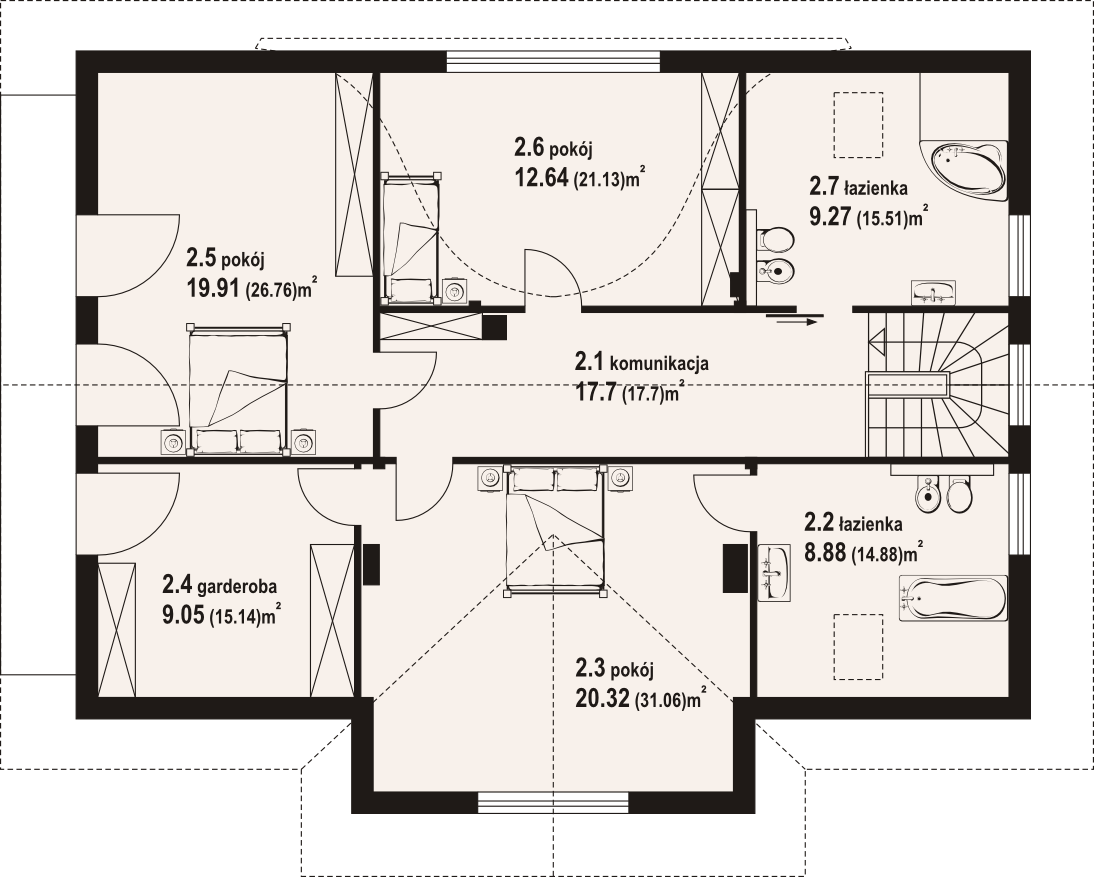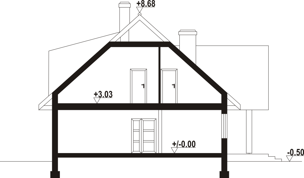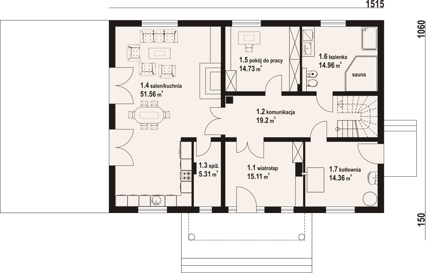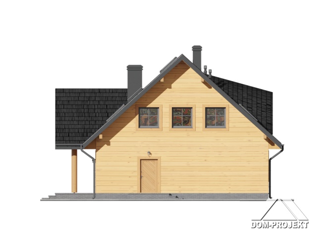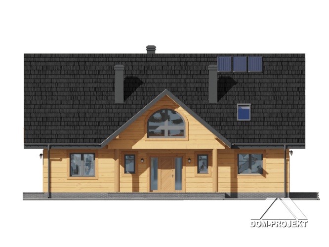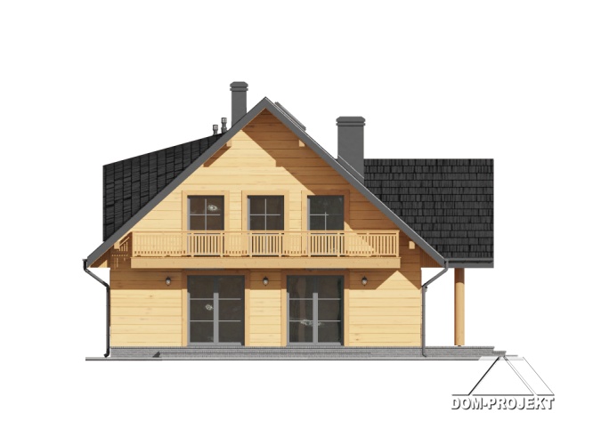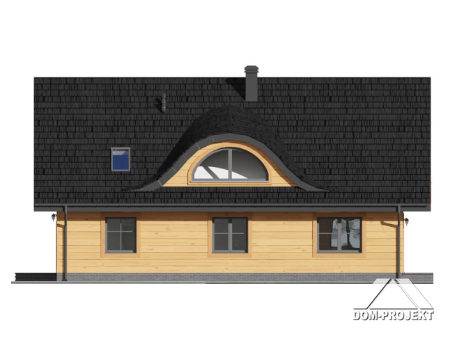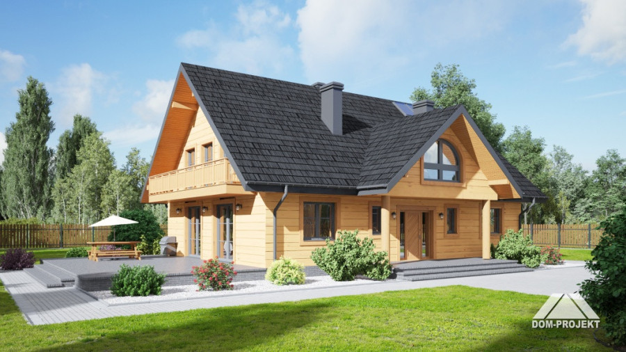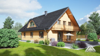Dom w konstrukcji szkieletu drewnianego. Duży salon z aneksem kuchennym, kominkiem i wyjściami na taras. Pokój do pracy, łazienka z sauną, kotłownia, komunikacja, wiatrołap i spiżarka. Na poddaszu trzy pokoje, dwie łazienki, garderoba, komunikacja i balkon. Zwarta bryła budynku i dach dwuspadowy sprzyjają szybkiej i taniej budowie i niskim kosztom eksploatacji.