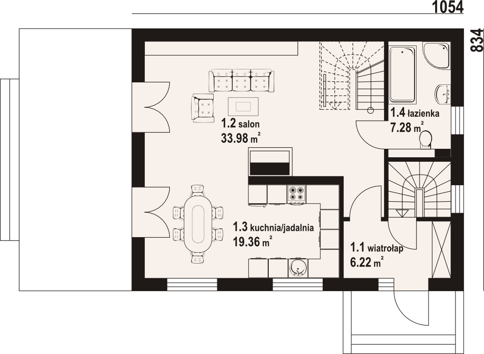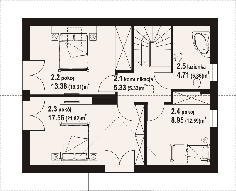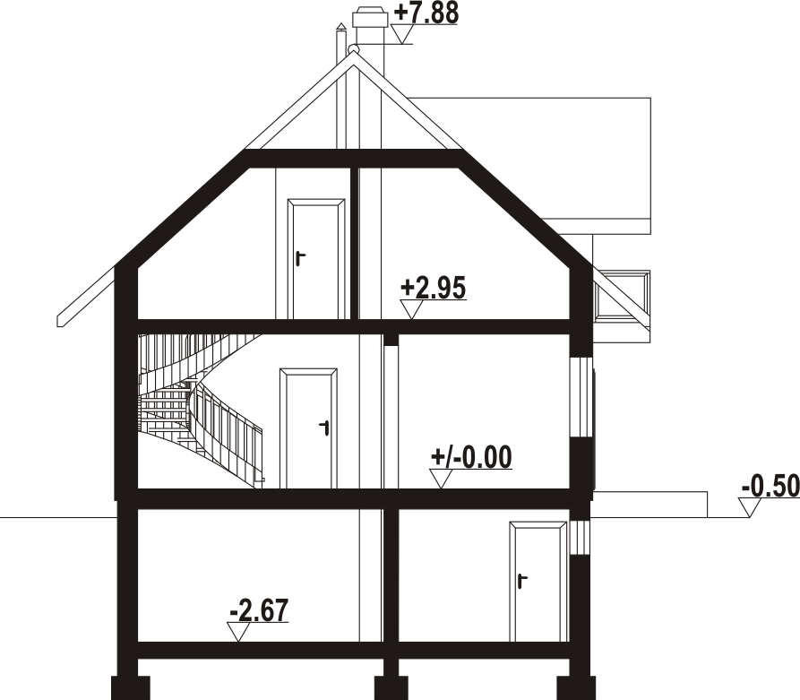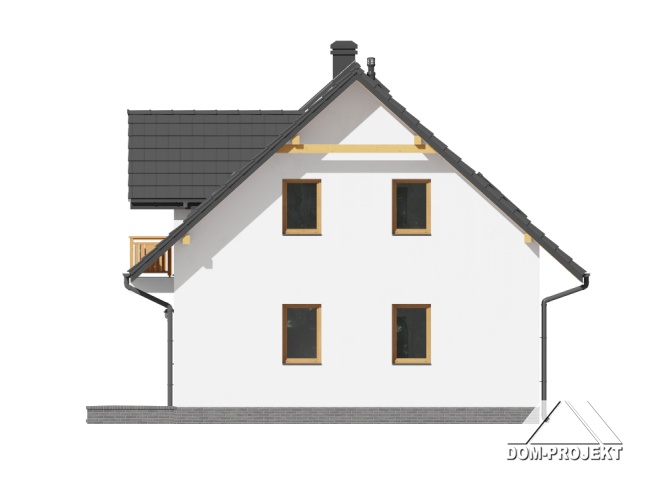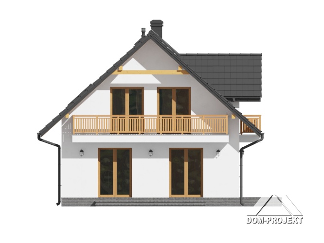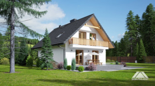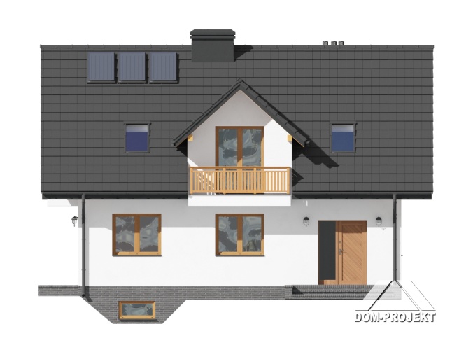 Dom z podpiwniczeniem. Duży salon z aneksem kuchennym, kominkiem, wyjściami na taras i schodami na poddasze. Łazienka, wiatrołap, schody do piwnicy. Na poddaszu trzy pokoje, łazienka, komunikacja i dwa balkony. W piwnicach kotłownia, pralnia i pomieszczenia gospodarcze. Zwarta bryła budynku i dach dwuspadowy sprzyjają szybkiej i taniej budowie i niskim kosztom eksploatacji.