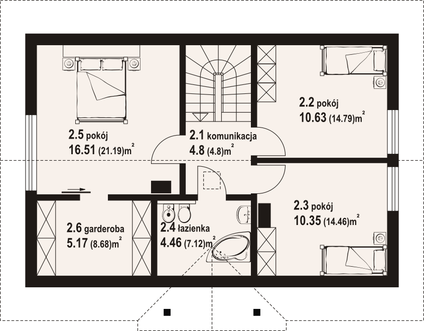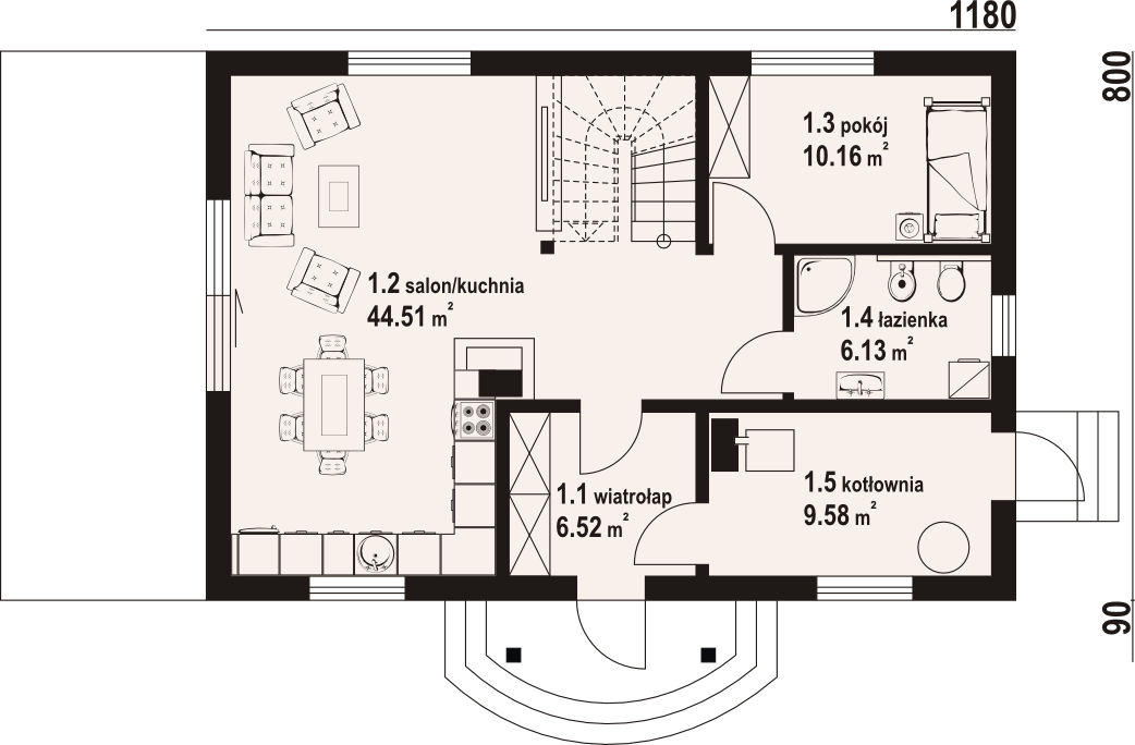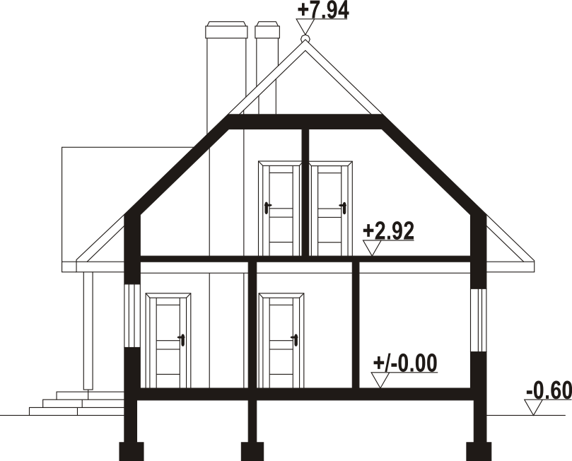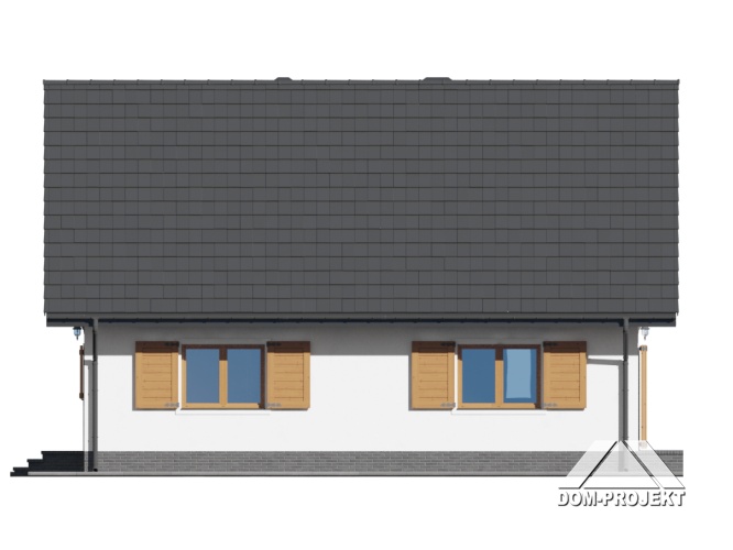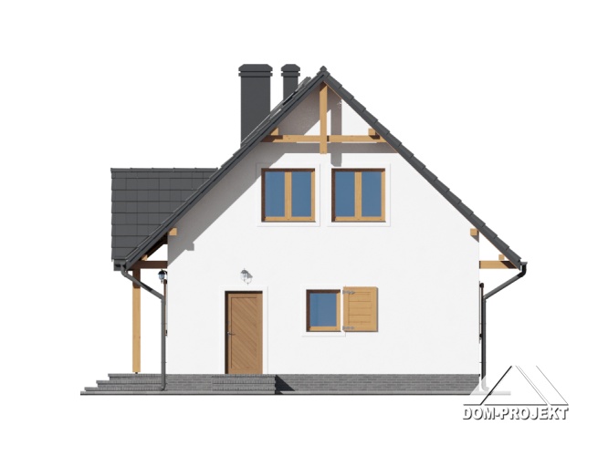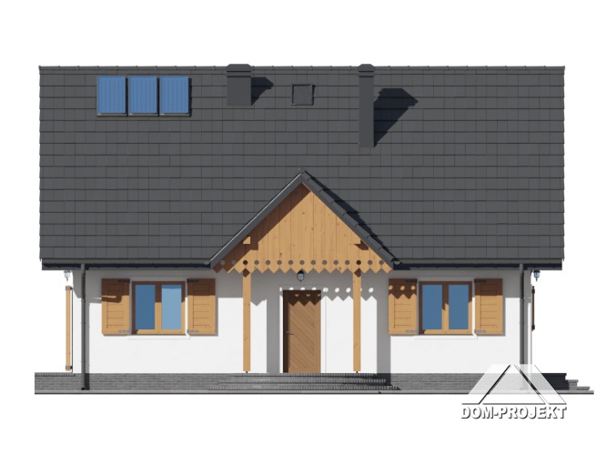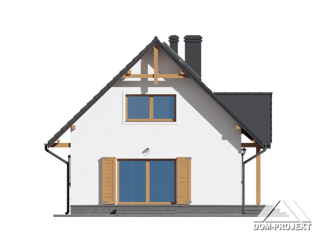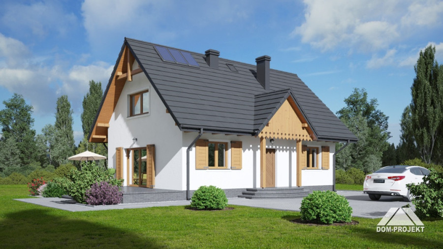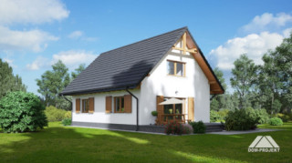 Dom w konstrukcji szkieletowej. Duży salon z aneksem kuchennym, kominkiem, wyjściem na taras i schodami na poddasze. Pokój, łazienka, kotłownia, wiatrołap i komunikacja. Na poddaszu trzy pokoje, łazienka, garderoba i komunikacja. Instalacja solarna. Zwarta bryła budynku i dach dwuspadowy sprzyjają szybkiej i taniej budowie i niskim kosztom eksploatacji.