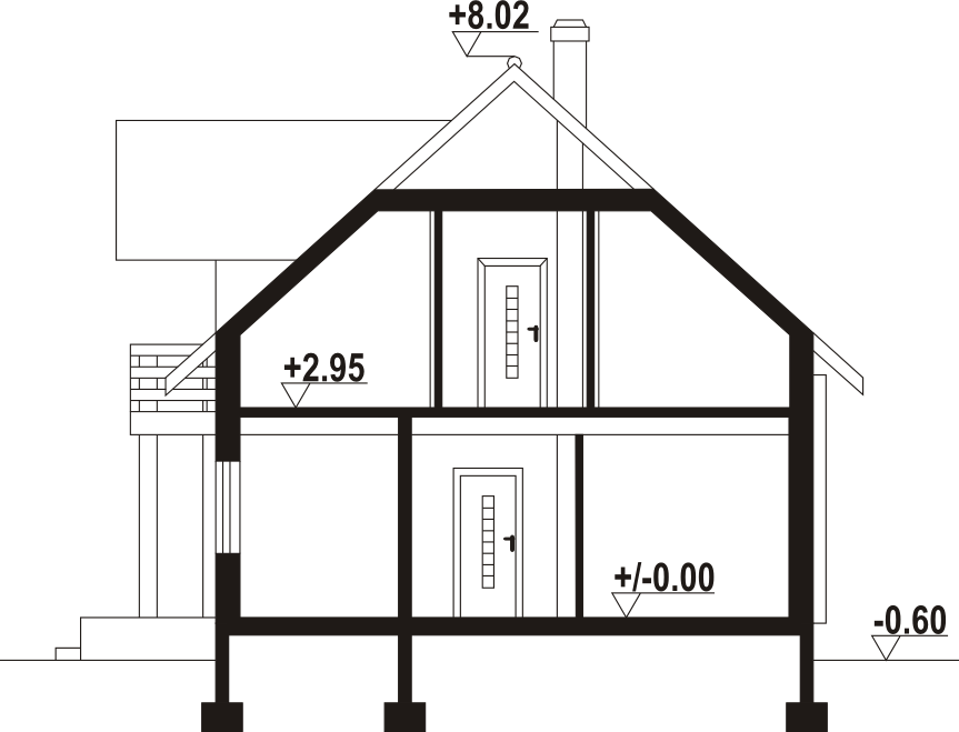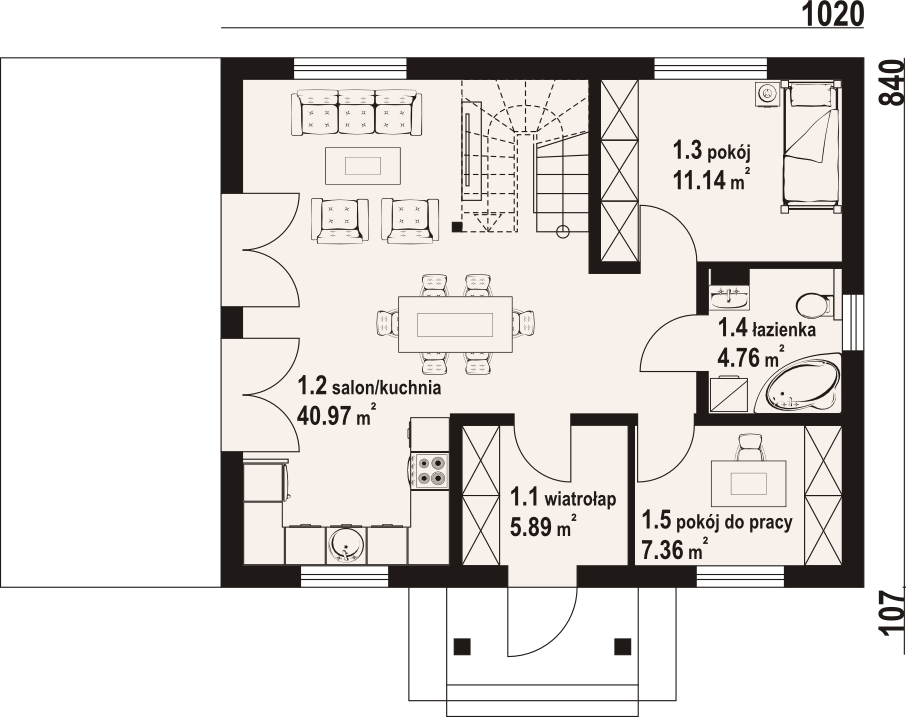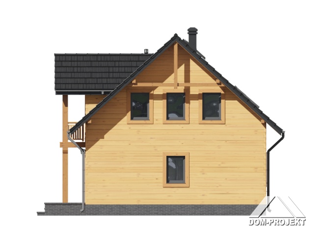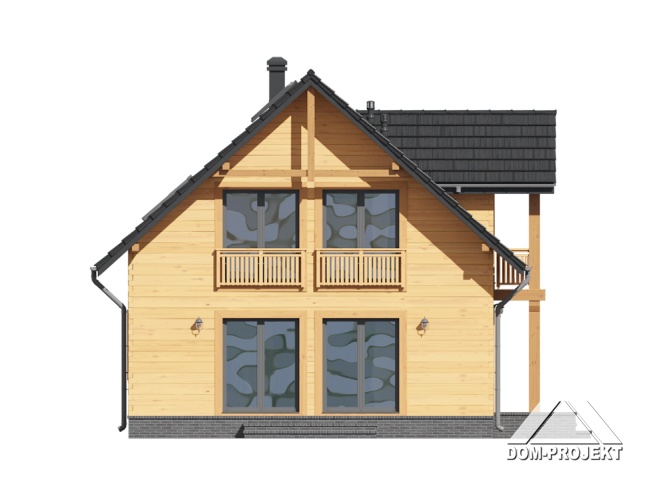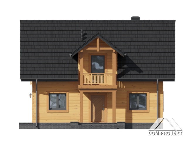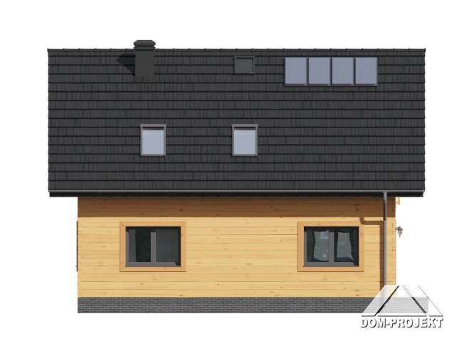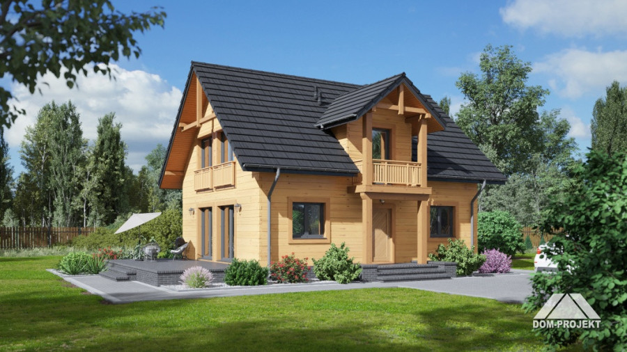 Dom w konstrukcji szkieletu drewnianego. Duży salon z aneksem kuchennym, wyjściami na taras i schodami na poddasze. Dwa pokoje, łazienka i wiatrołap. Na poddaszu cztery pokoje, łazienka, komunikacja i balkon. Zwarta bryła budynku sprzyja szybkiej i taniej budowie i niskim kosztom eksploatacji.