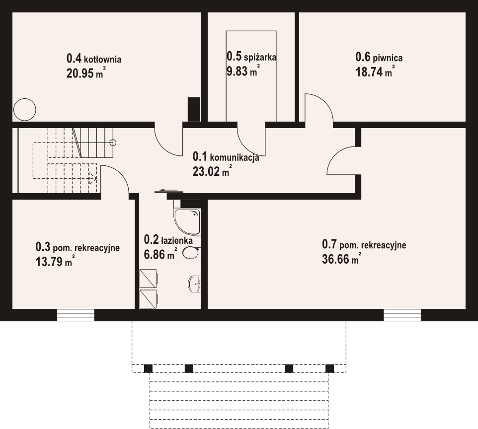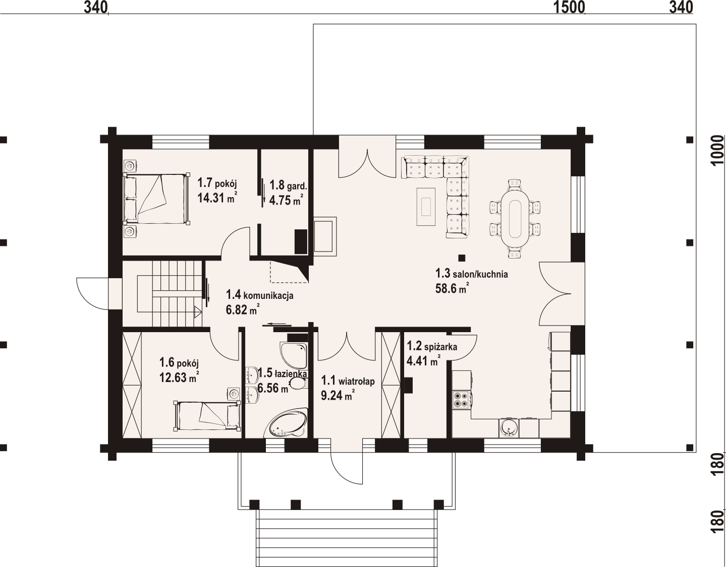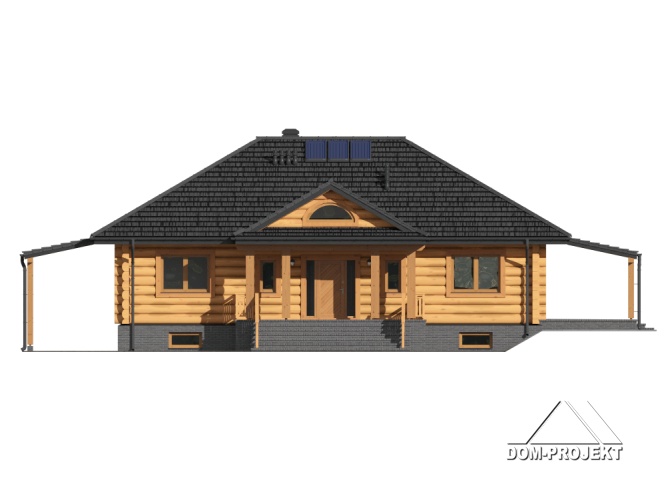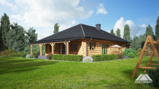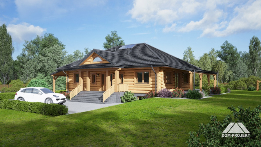Dom z bali. Podpiwniczony. Duży salon z aneksem kuchennym, kominkiem i wyjściem na zadaszony taras. dwa pokoje, łazienka, garderoba, komunikacja, spiżarka i wiatrołap. Poddasze nieużytkowe. W piwnicach kotłownia, łazienka, pomieszczenia rekreacyjne, piwnica, spiżarka i komunikacja. Instalacja solarna.