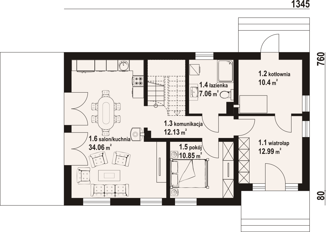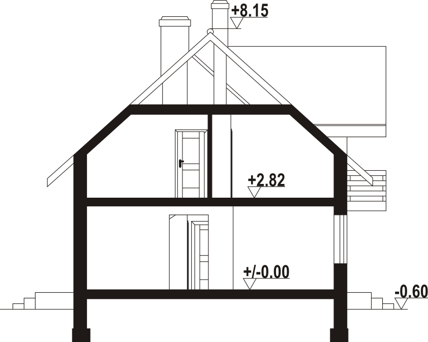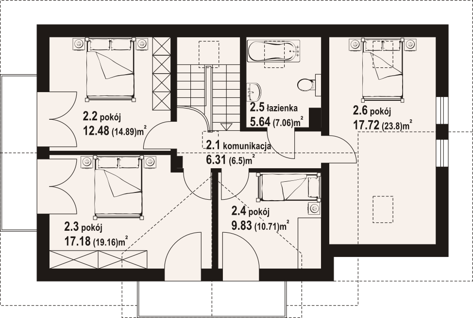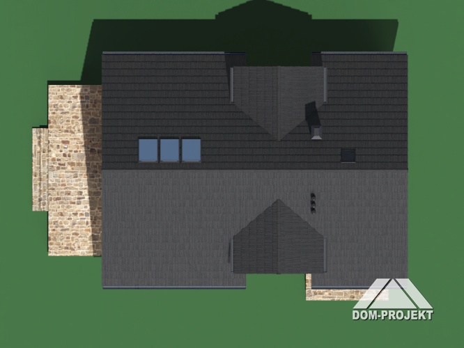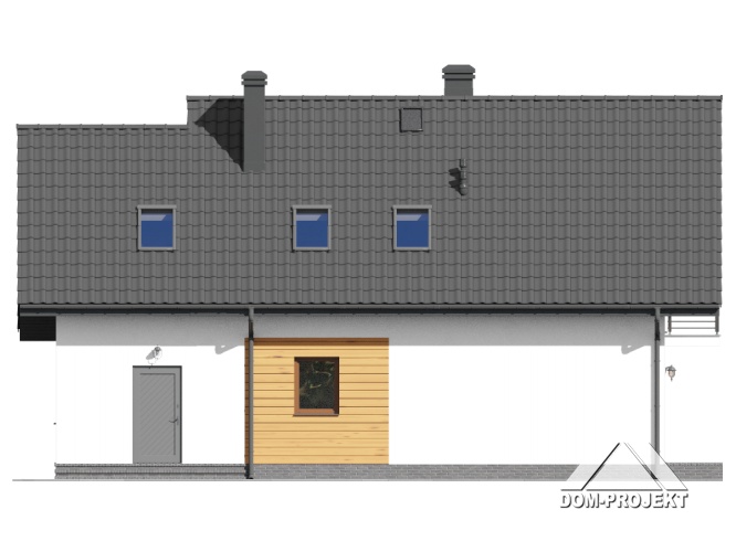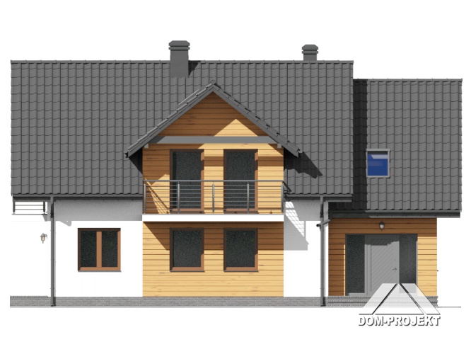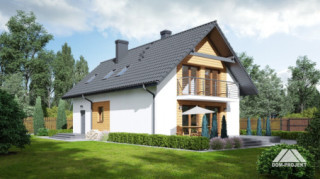 Dom z poddaszem. Duży salon z aneksem kuchennym, kominkiem i wyjściami na taras. Pokój, łazienka, komunikacja, wiatrołap i kotłownia. Na poddaszu cztery pokoje, łazienka, komunikacja i dwa balkony. Zwarta bryła budynku i dach dwuspadowy sprzyjają szybkiej i taniej budowie i niskim kosztom eksploatacji.