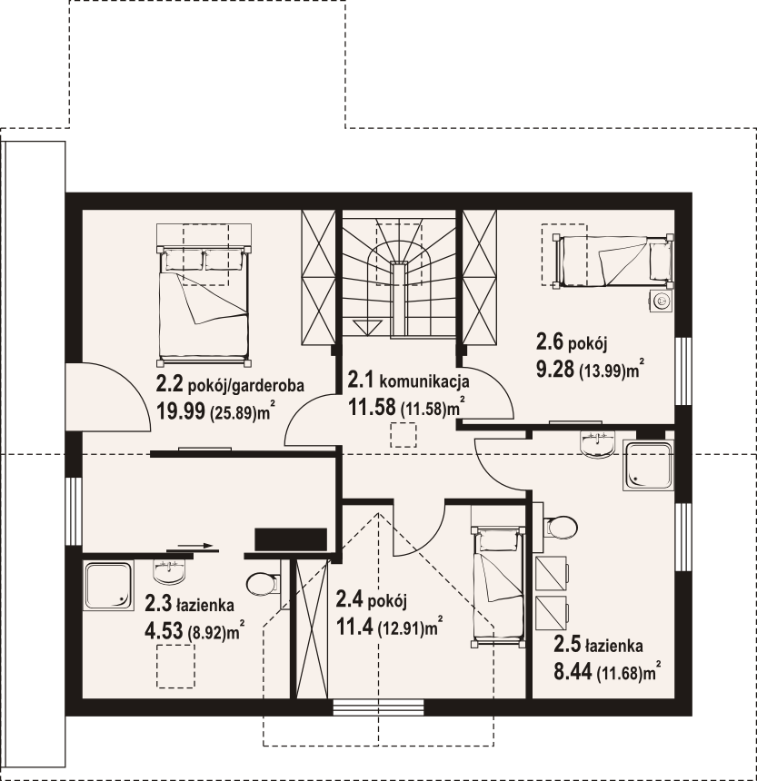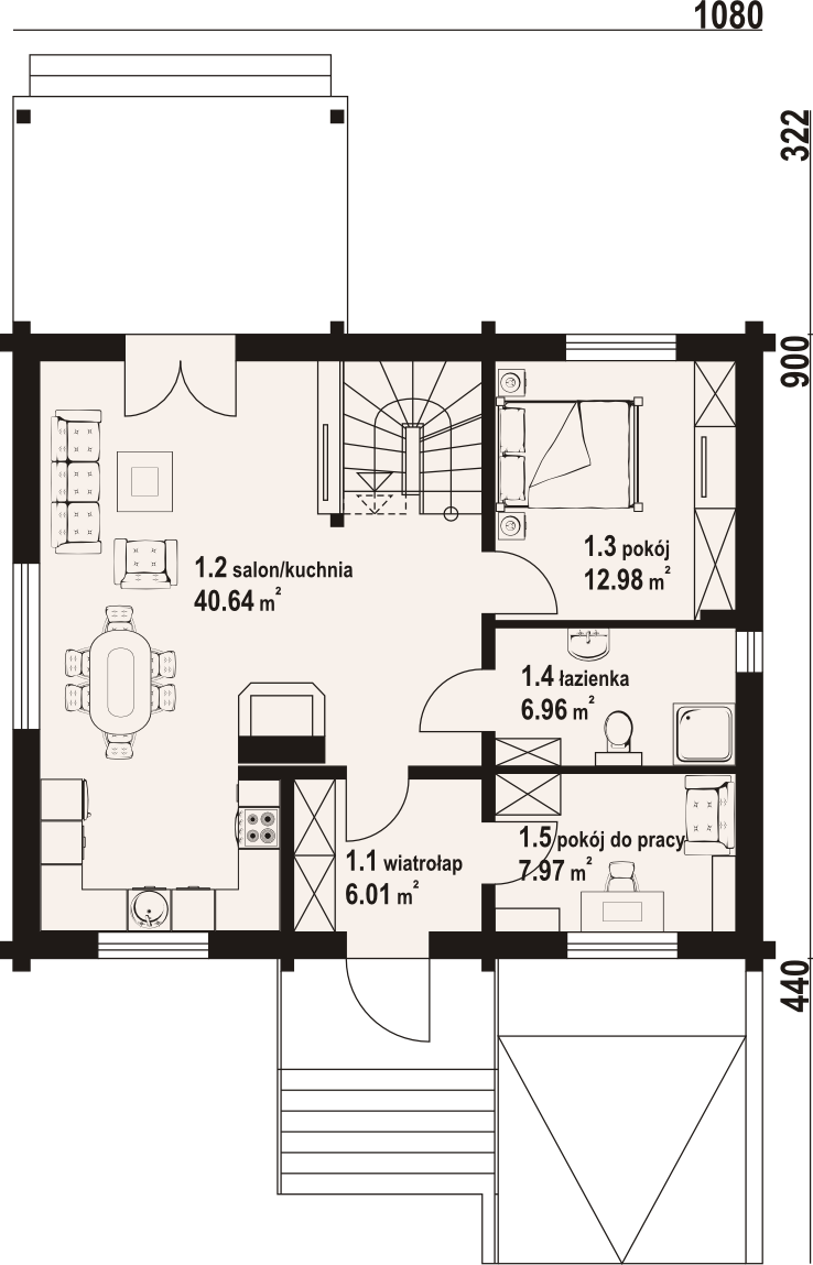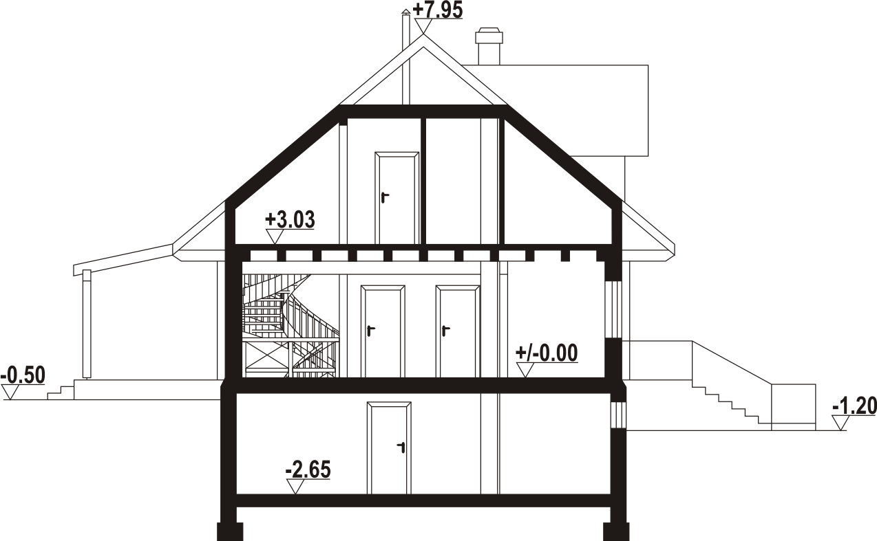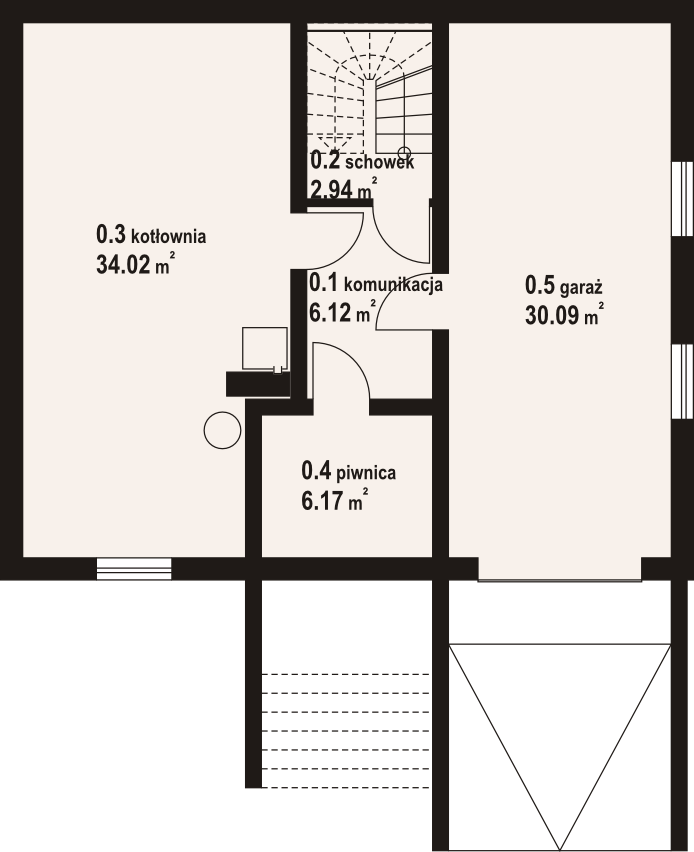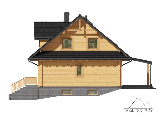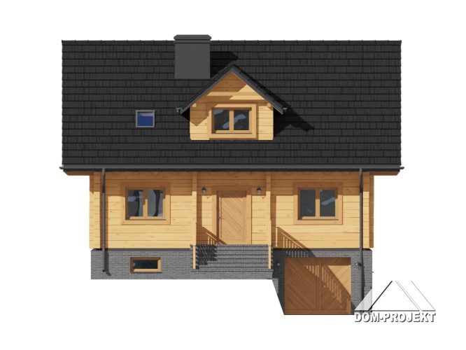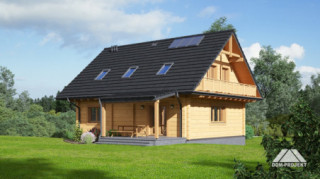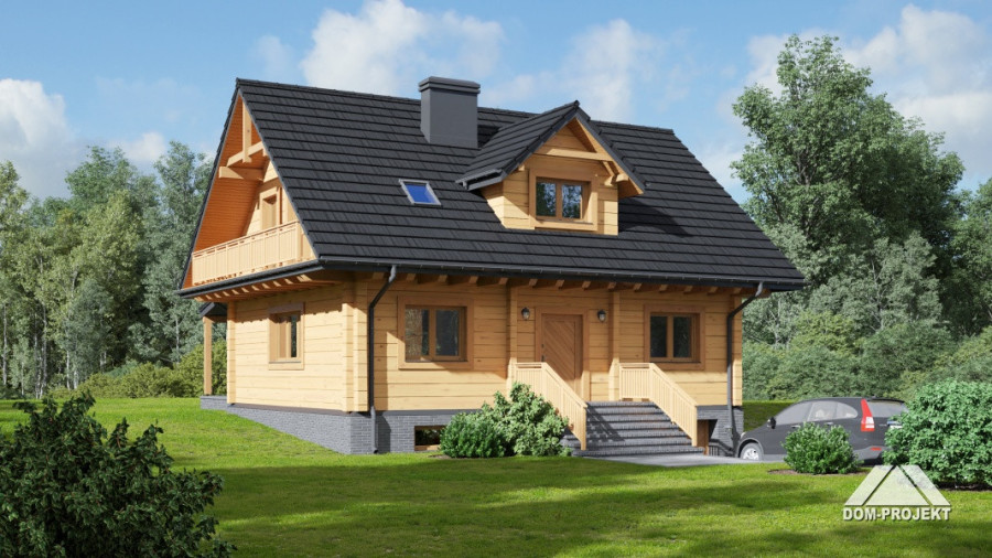 Dom z bali. Podpiwniczony. Duży salon z aneksem kuchennym, kominkiem, schodami na poddasze i wyjściem na zadaszony taras. Pokój, łazienka, pokój do pracy i wiatrołap. Na poddaszu trzy pokoje, dwie łazienki, garderoba, komunikacja i balkon. W piwnicach garaż, kotłownia, piwnica, komunikacja i schowek. Prosta bryła budynku i dach dwuspadowy sprzyjają szybkiej i taniej budowie i niskim kosztom eksploatacji.