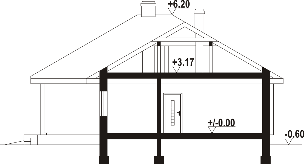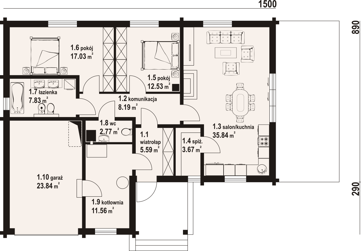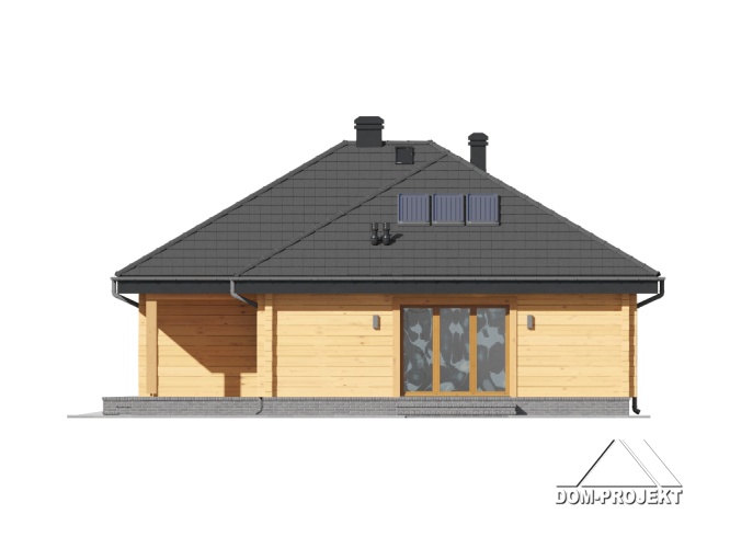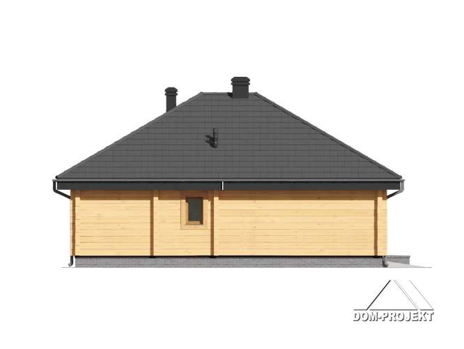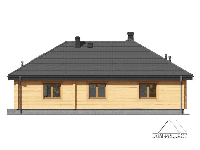 Parterowy dom z bali drewnianych. Duży salon z aneksem kuchennym, kominkiem i wyjściem na taras. Dwa pokoje, łazienka, wc, wiatrołap, komunikacja, spiżarka, kotłownia i garaż. W garażu schody rozkładane na strych. Strych nieużytkowy.