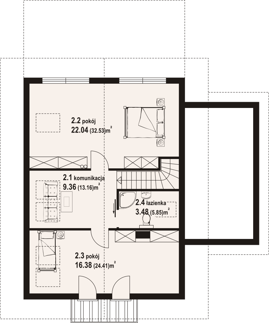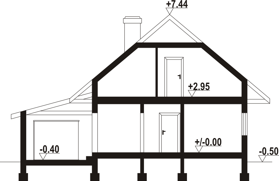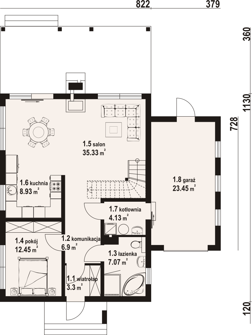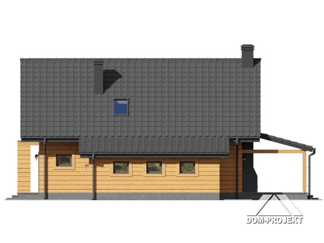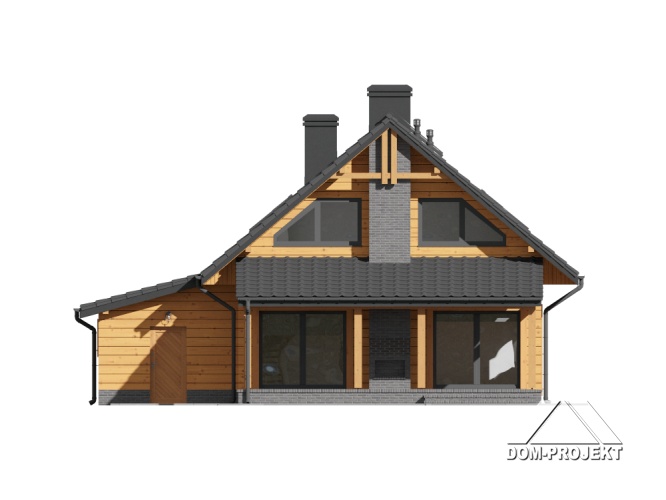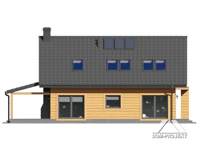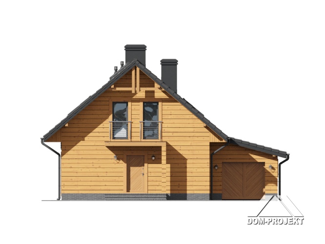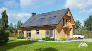 Dom w konstrukcji szkieletu drewnianego. Duży salon z aneksem kuchennym, kominkiem, schodami na poddasze i wyjściem na zadaszony taras. Na tarasie kominek. Pokój, łazienka, pralnia, wiatrołap i garaż. Na poddaszu dwa pokoje, łazienka, komunikacja i balkon. Zwarta bryła budynku i dach dwuspadowy sprzyjają szybkiej i taniej budowie i niskim kosztom eksploatacji.