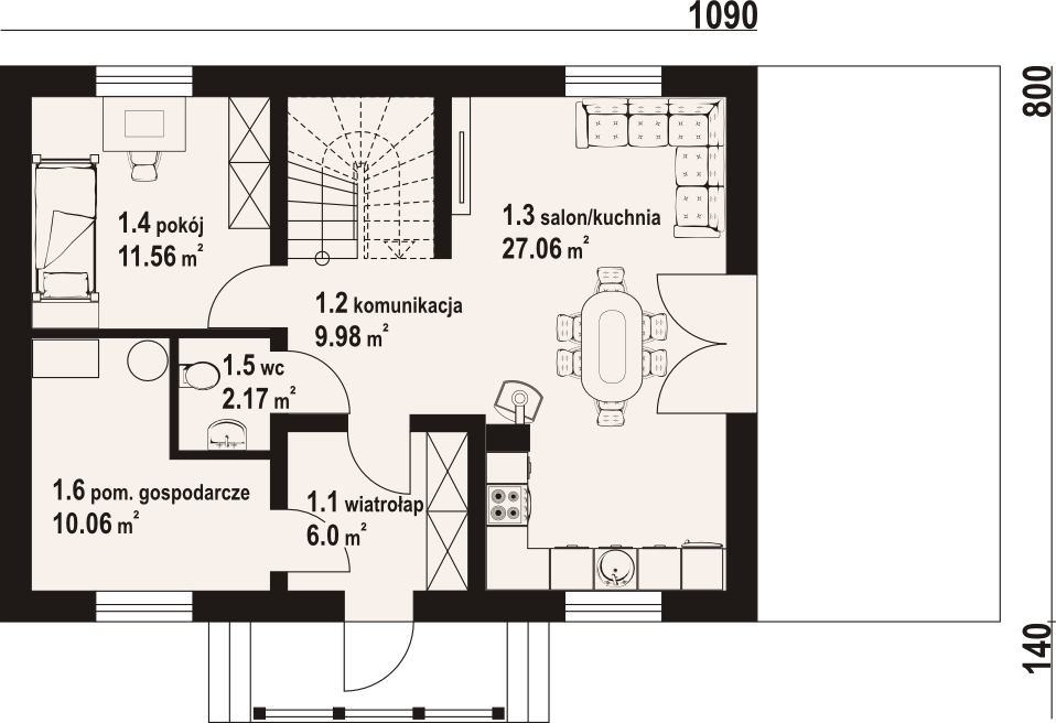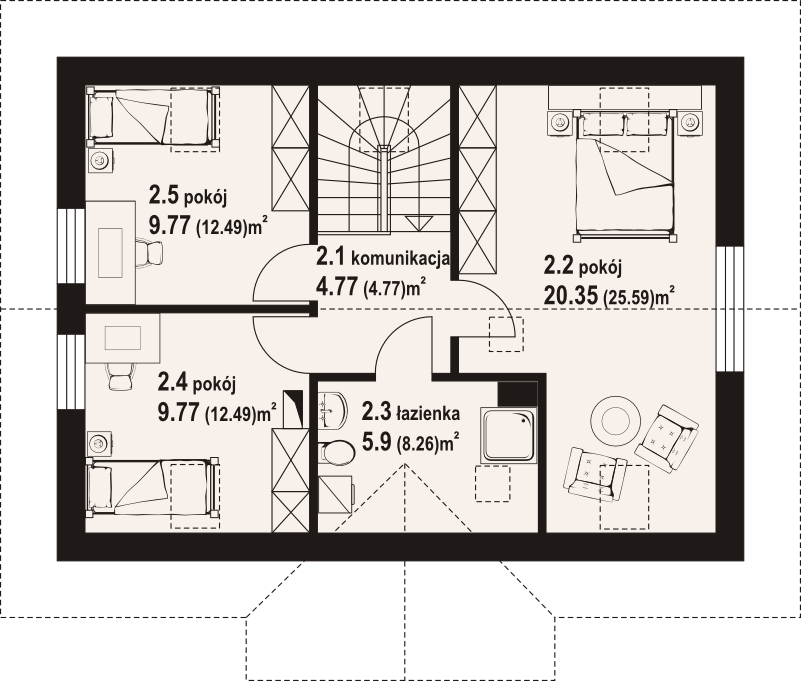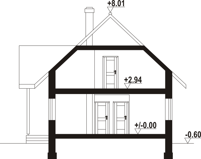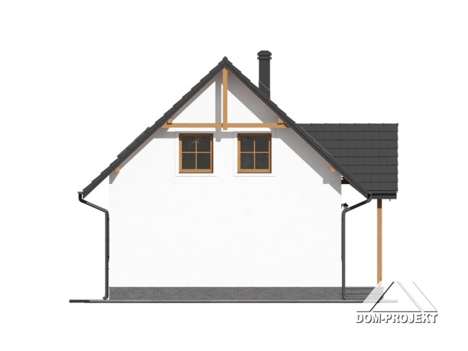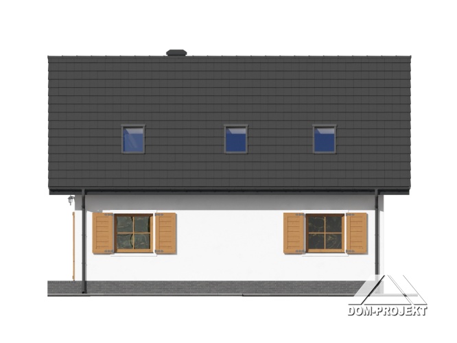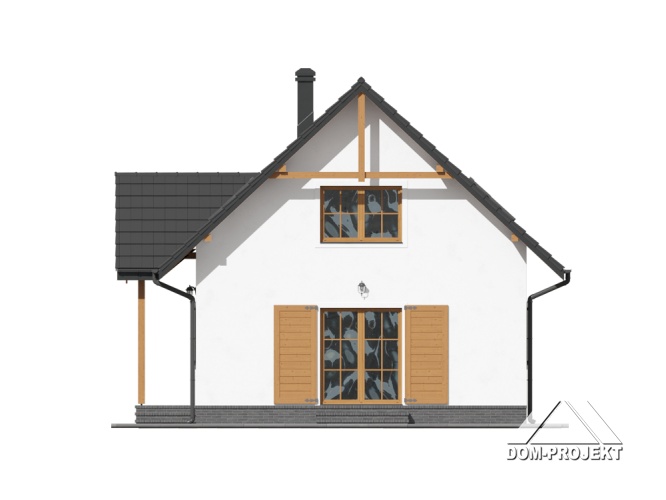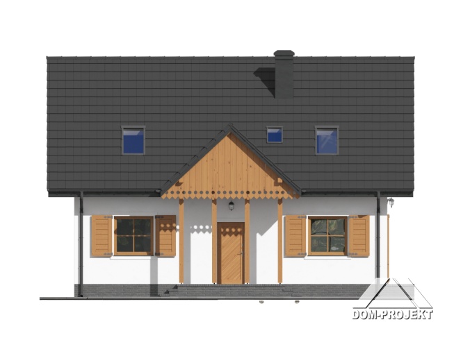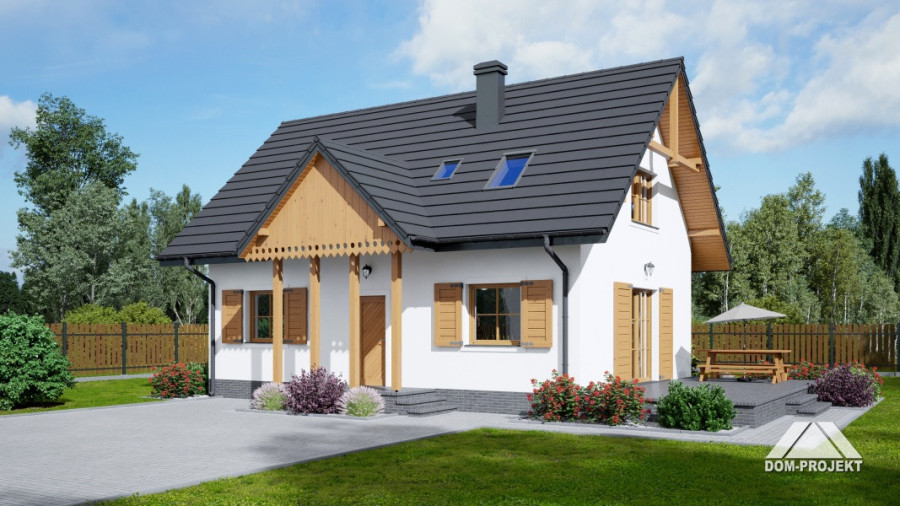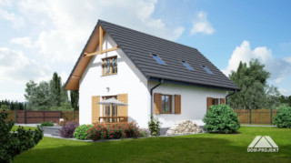 Dom z poddaszem użytkowym. Duży salon z aneksem kuchennym, wyjściem na taras i kominkiem, pokój, wc, komunikacja i pomieszczenie gospodarcze. Na poddaszu trzy pokoje, łazienka i komunikacja. Zwarta bryła budynku i dach dwuspadowy sprzyjają szybkiej i taniej budowie i niskim kosztom eksploatacji.