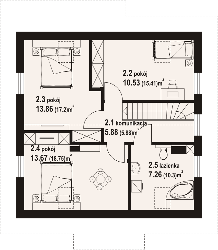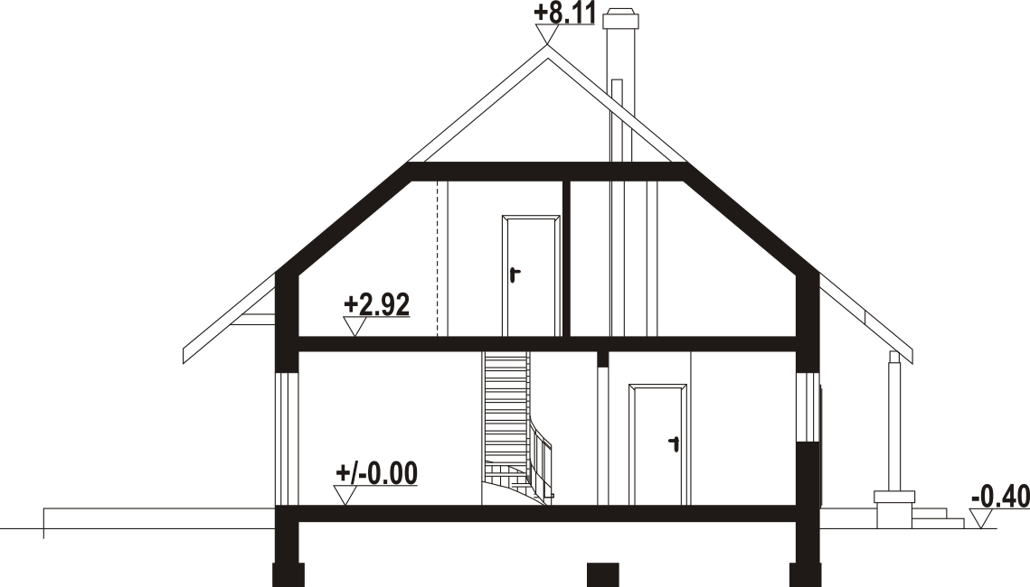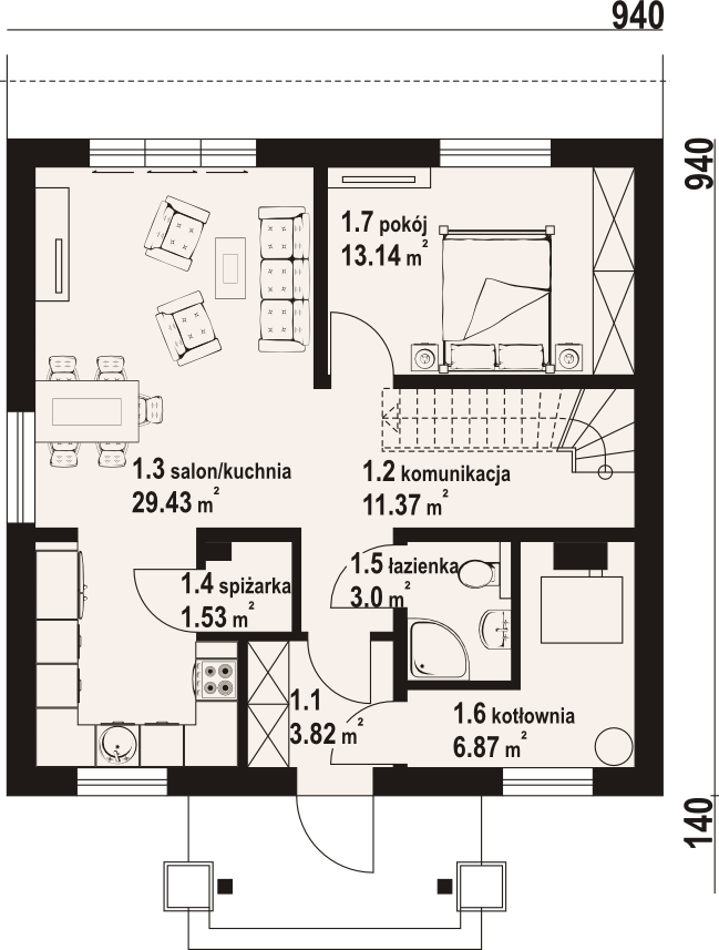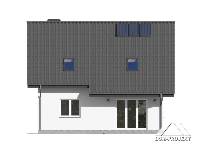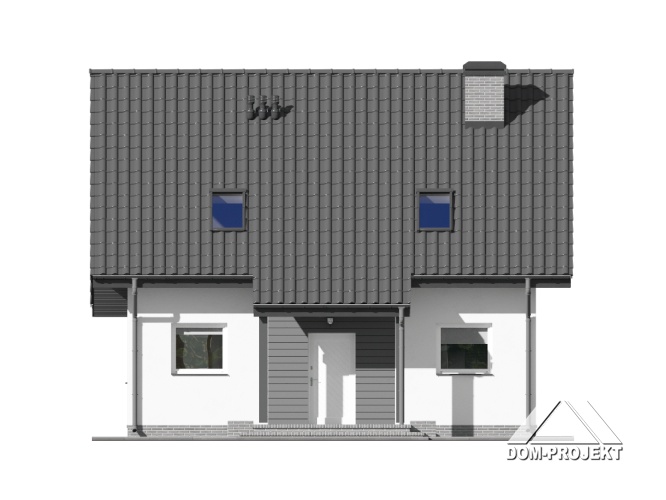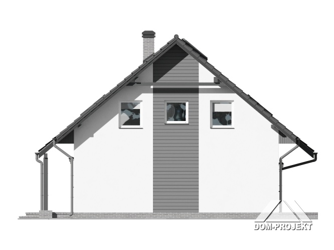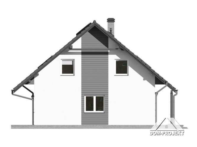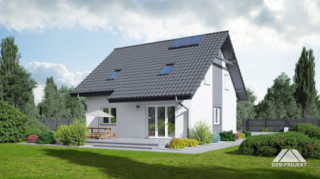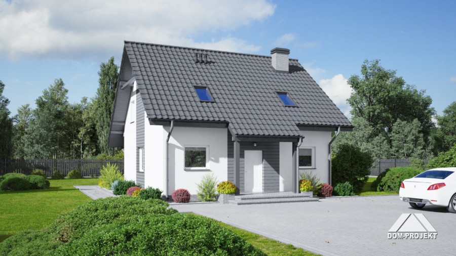 Dom z poddaszem użytkowym. Duży salon z aneksem kuchennym i wyjściem na taras. Pokój, łazienka, komunikacja, wiatrołap, spiżarka i kotłownia. Na poddaszu trzy pokoje, łazienka i komunikacja. Zwarta bryła budynku i dach dwuspadowy sprzyjają szybkiej i taniej budowie i niskim kosztom eksploatacji.