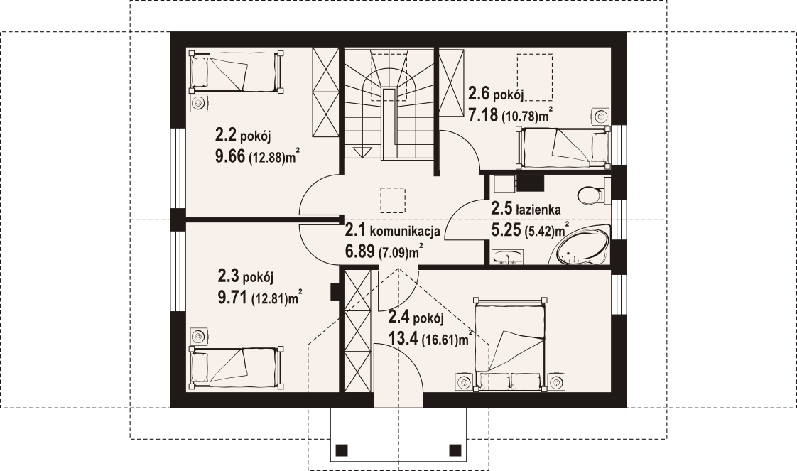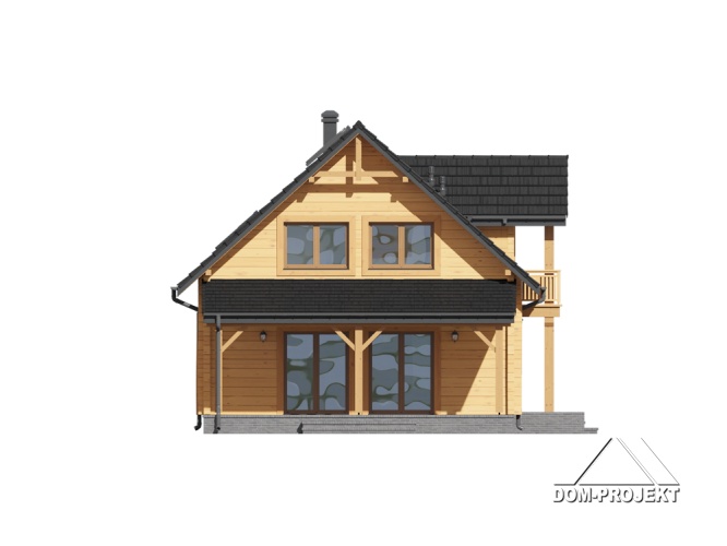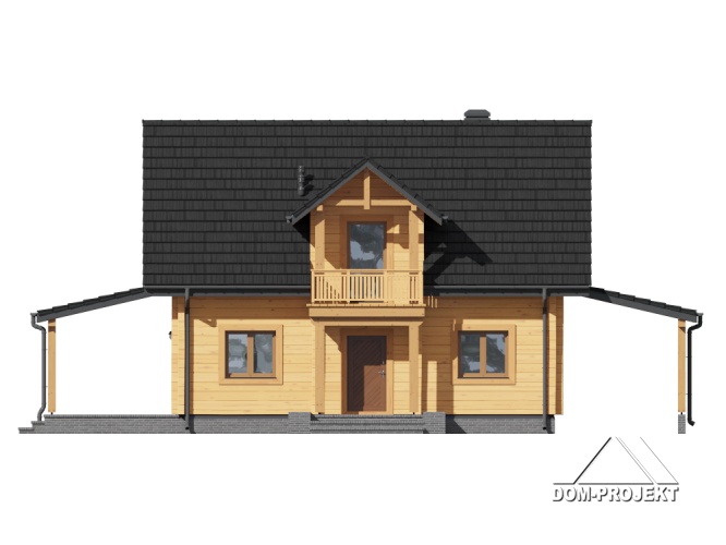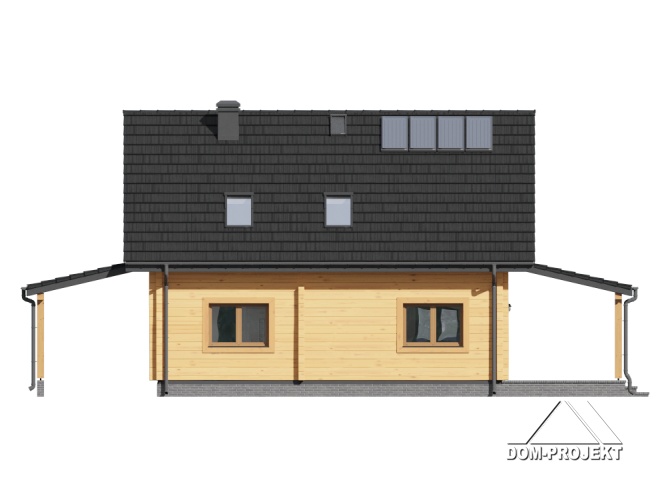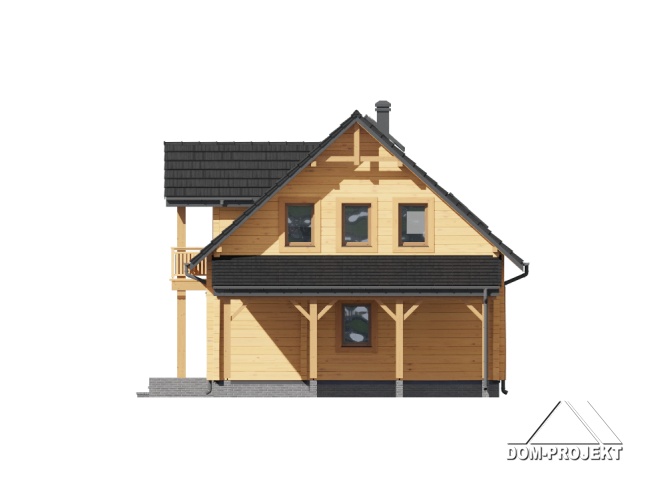 Dom z bali drewnianych. Duży salon z aneksem kuchennym, wyjściami na zadaszony taras i schodami na poddasze. Dwa pokoje, łazienka, wiatrołap. Wiata na samochód. Na poddaszu cztery pokoje, łazienka, komunikacja i balkon. Zwarta bryła budynku i dach dwuspadowy sprzyja szybkiej i taniej budowie i niskim kosztom eksploatacji.