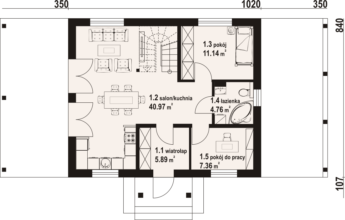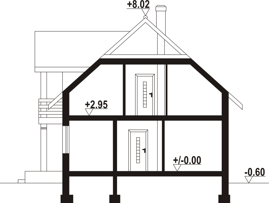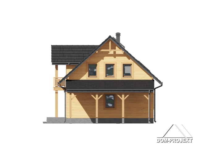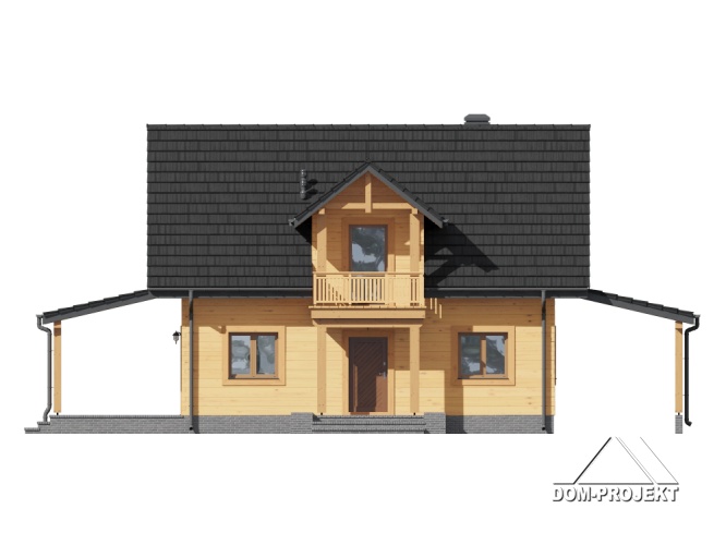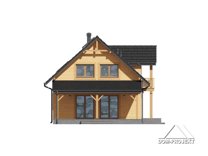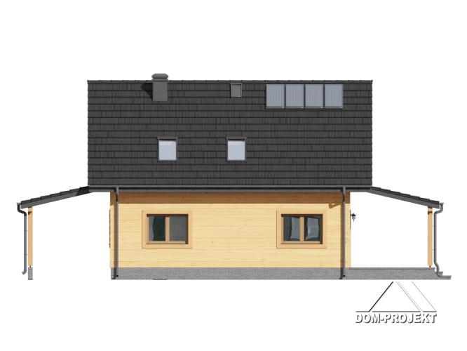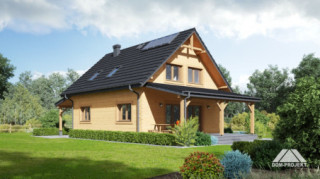Dom w konstrukcji szkieletu drewnianego. Duży salon z aneksem kuchennym, wyjściami na zadaszony taras i schodami na poddasze. Dwa pokoje, łazienka, wiatrołap. Wiata na samochód. Na poddaszu cztery pokoje, łazienka, komunikacja i balkon. Zwarta bryła budynku i dach dwuspadowy sprzyja szybkiej i taniej budowie i niskim kosztom eksploatacji.