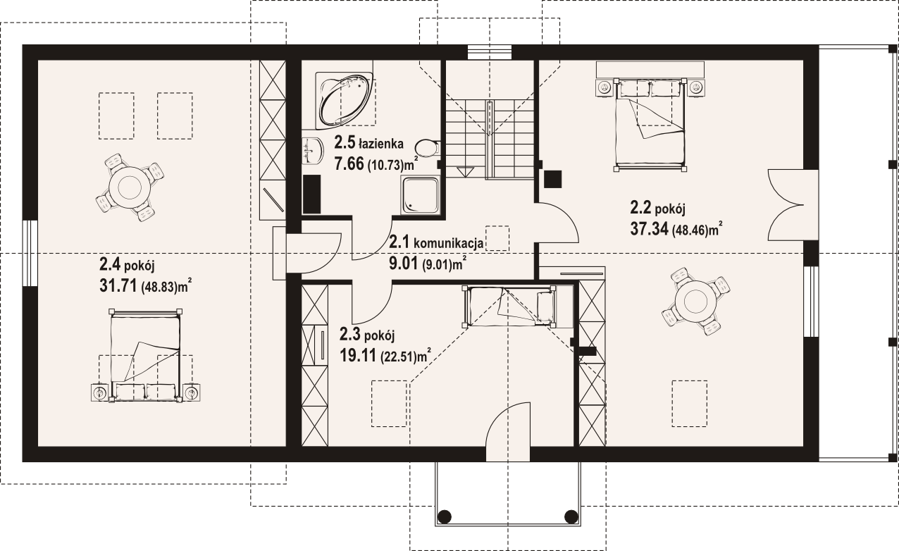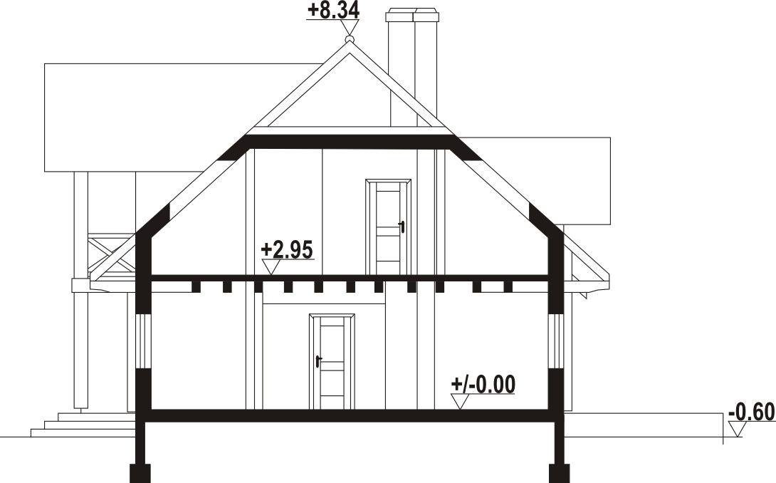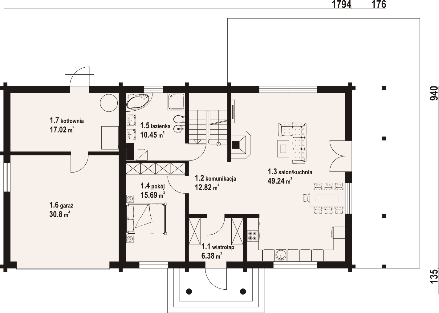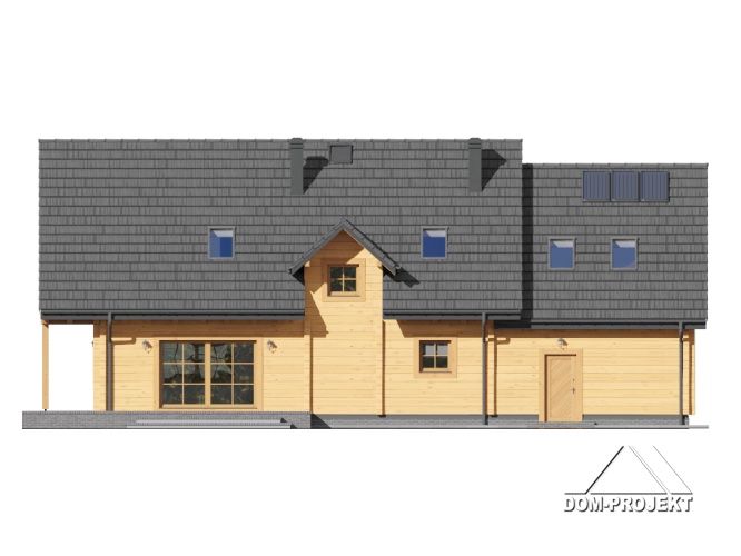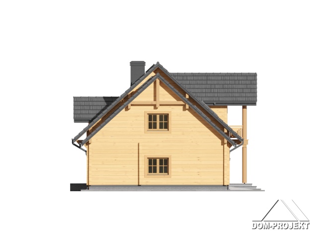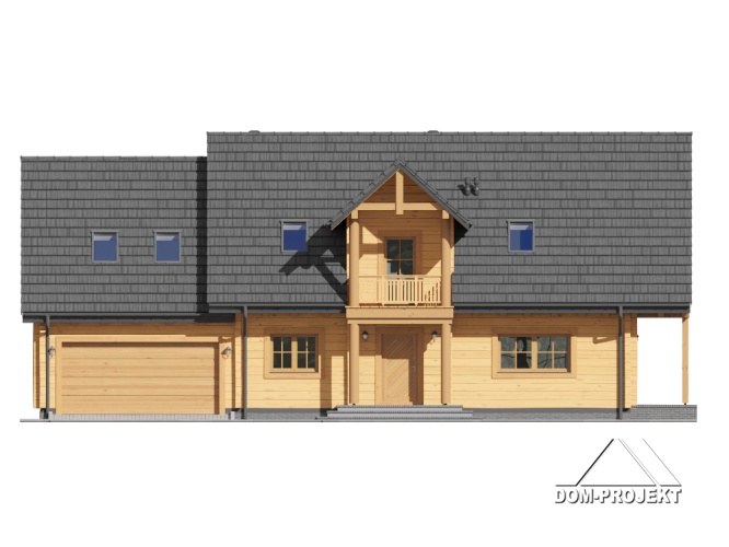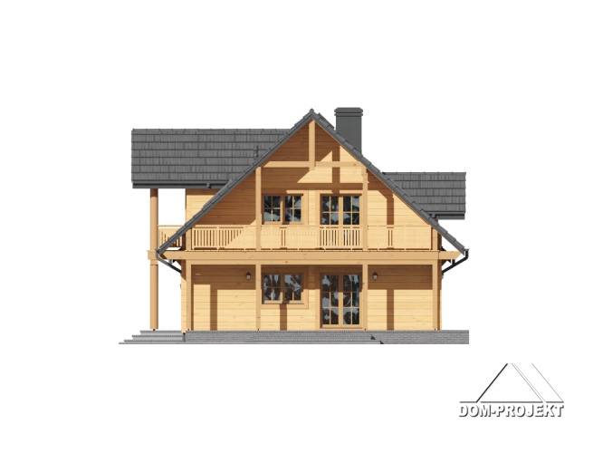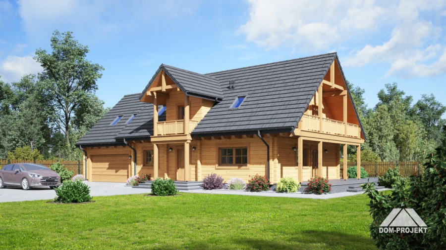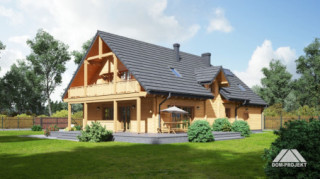 Dom z bali drewnianych. Duży salon z aneksem kuchennym, kominkiem , wyjściem na zadaszony taras i schodami na poddasze. Pokój, łazienka, komunikacja, wiatrołap, kotłownia i garaż na dwa samochody. Na poddaszu trzy pokoje, łazienka, komunikacja i dwa balkony. Zwarta bryła budynku sprzyja szybkiej i taniej budowie i niskim kosztom eksploatacji.