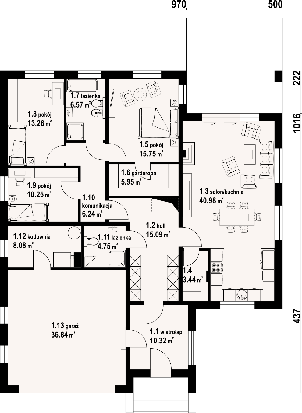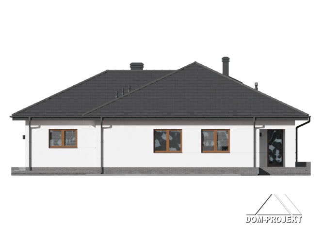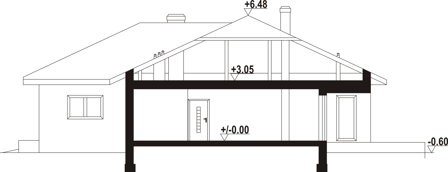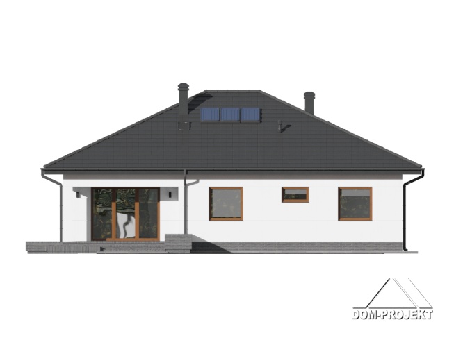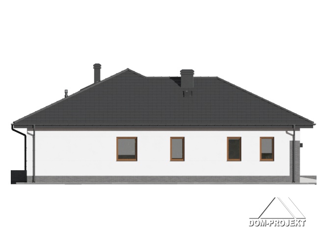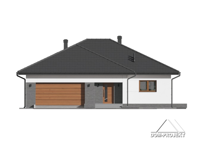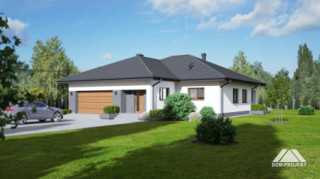 Dom parterowy. Duży salon z aneksem kuchennym i wyjściem na taras. Trzy pokoje, dwie łazienki, garderoba, spiżarka, holl, wiatrołap, garaż na dwa samochody i kotłownia. Poddasze nieużytkowe. Wyjście na poddasze schodami rozkładanymi z holu.