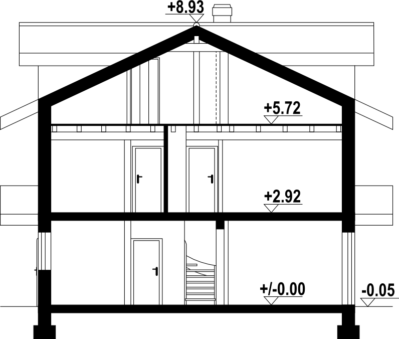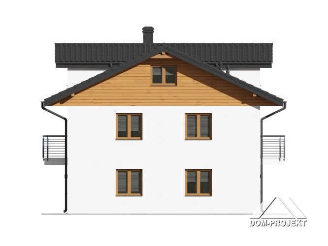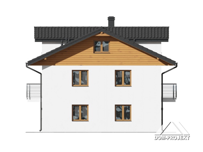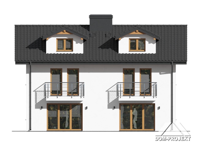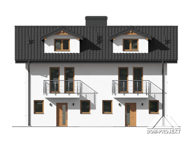 Dom dwulokalowy. Każdy lokal składa się z: dużego salonu z kominkiem i wyjściem na taras, aneksu kuchennego, łazienki, wiatrołapu, pomieszczenia gospodarczego i schodów na piętro. Na piętrze: trzy pokoje, łazienka, komunikacja i dwa balkony, Z piętra wyjście na strych (możliwość dodatkowego zagospodarowania). Zwarta bryła budynku i dach dwuspadowy sprzyjają szybkiej i taniej budowie i niskim kosztom eksploatacji.