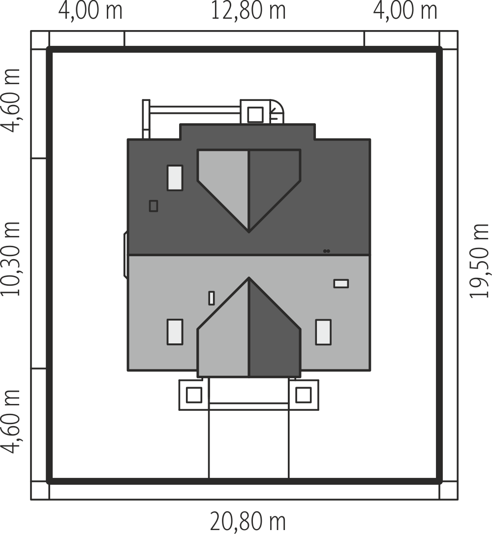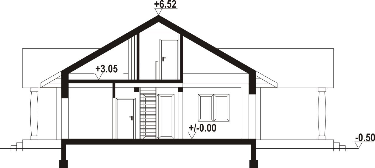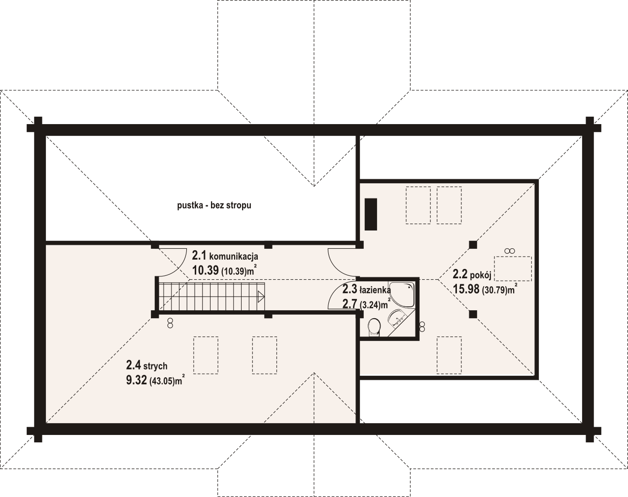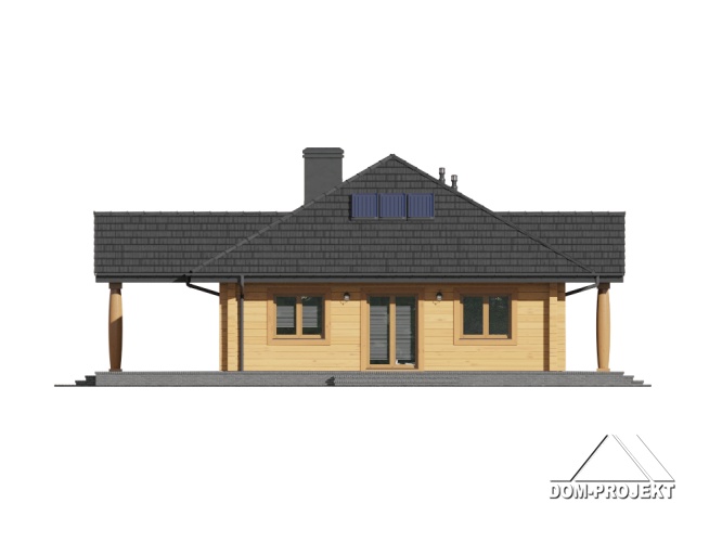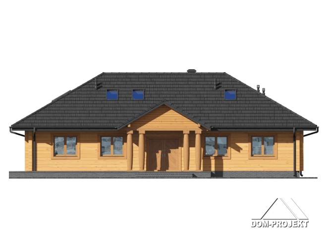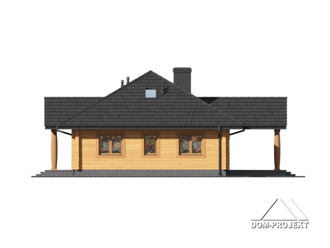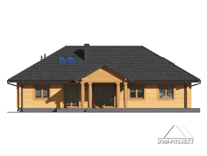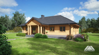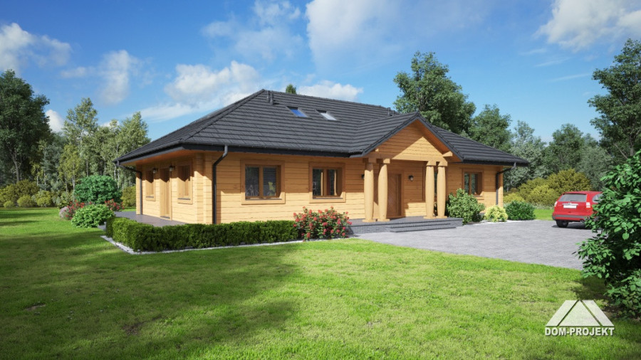 Dom z bali. Duży salon z aneksem kuchennym, kominkiem i wyjściami na taras. Pokój, dwie łazienki, dwie garderoby, pokój-gabinet, wiatrołap i komunikacja. Na poddaszu pokój, łazienka, strych i komunikacja.