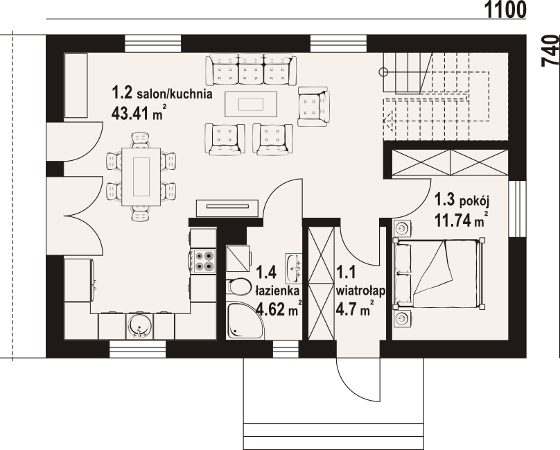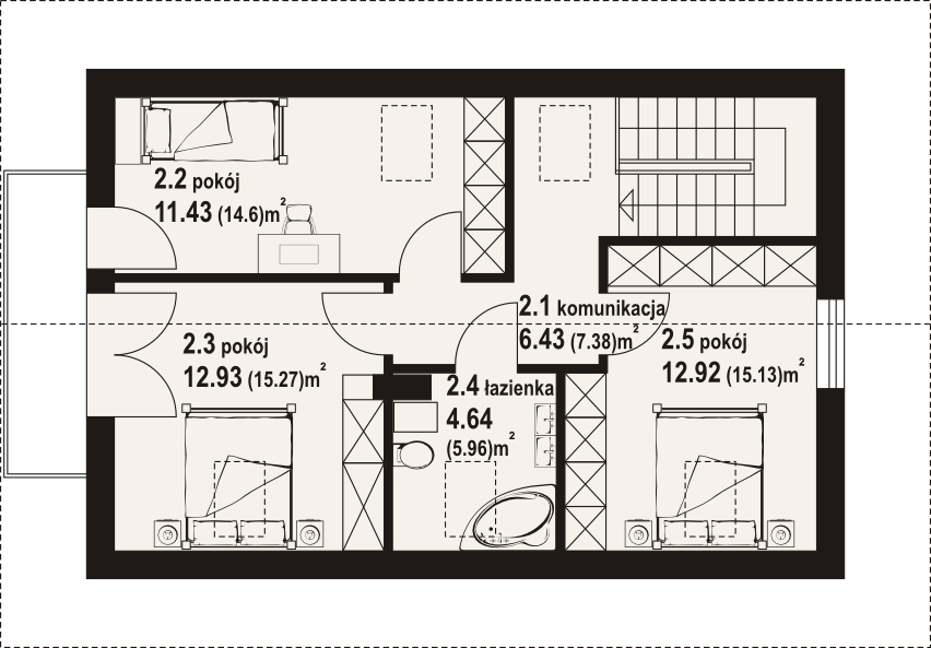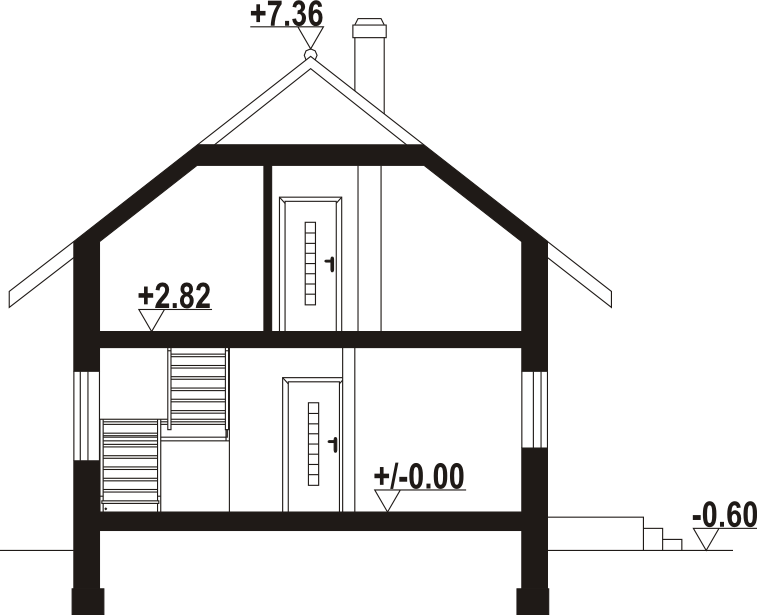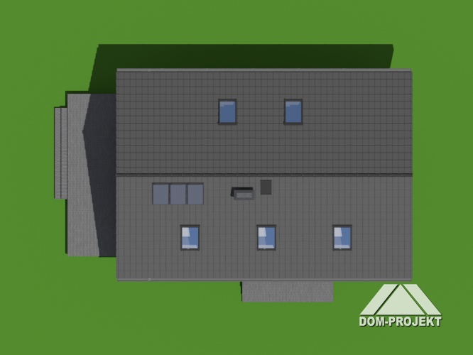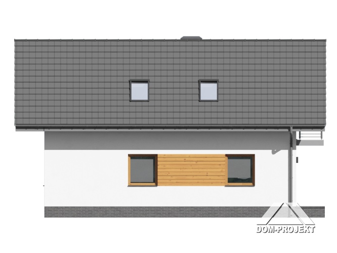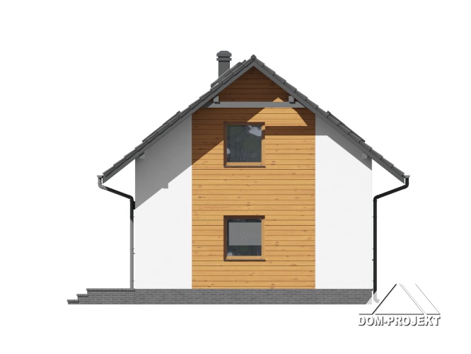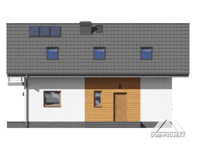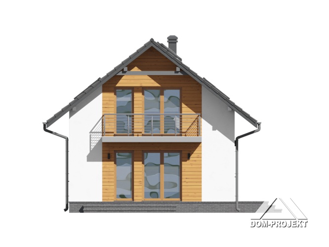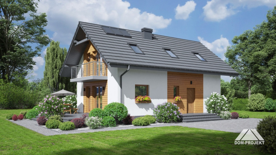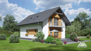Dom z poddaszem. Duży salon z aneksem jadalnym, schodami na poddasze i wyjściami na taras. Pokój, łazienka i wiatrołap. Na poddaszu trzy pokoje, łazienka, komunikacja i balkon. Zwarta bryła budynku i dach dwuspadowy sprzyjają szybkiej i taniej budowie i niskim kosztom eksploatacji.