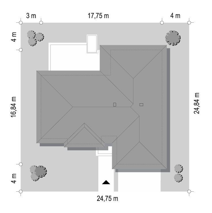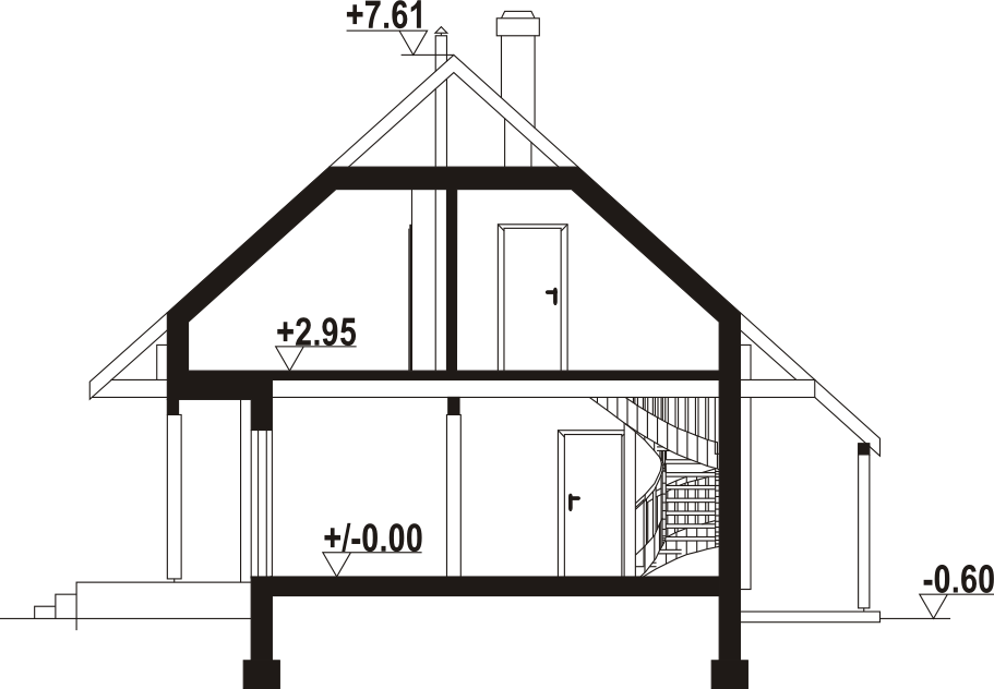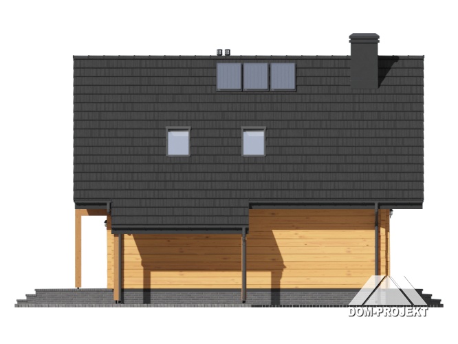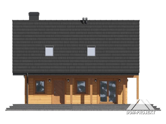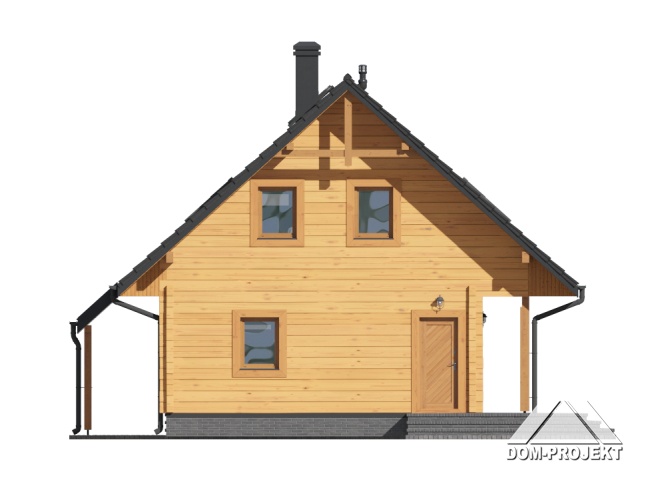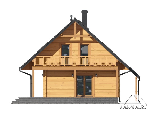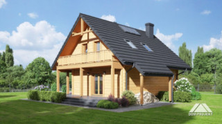 Nieduży dom z bali drewnianych. Duży salon z aneksem kuchennym, wyjściami na zadaszony taras i schodami na poddasze. Łazienka, kotłownia i wiatrołap. Na poddaszu trzy pokoje, komunikacja, łazienka i balkon. Zwarta bryła budynku i dach dwuspadowy sprzyjają szybkiej i tanie budowie i niskim kosztom eksploatacji.