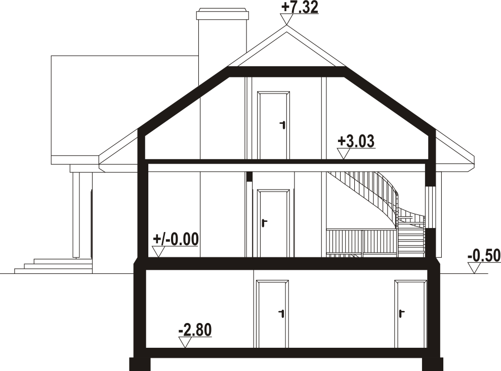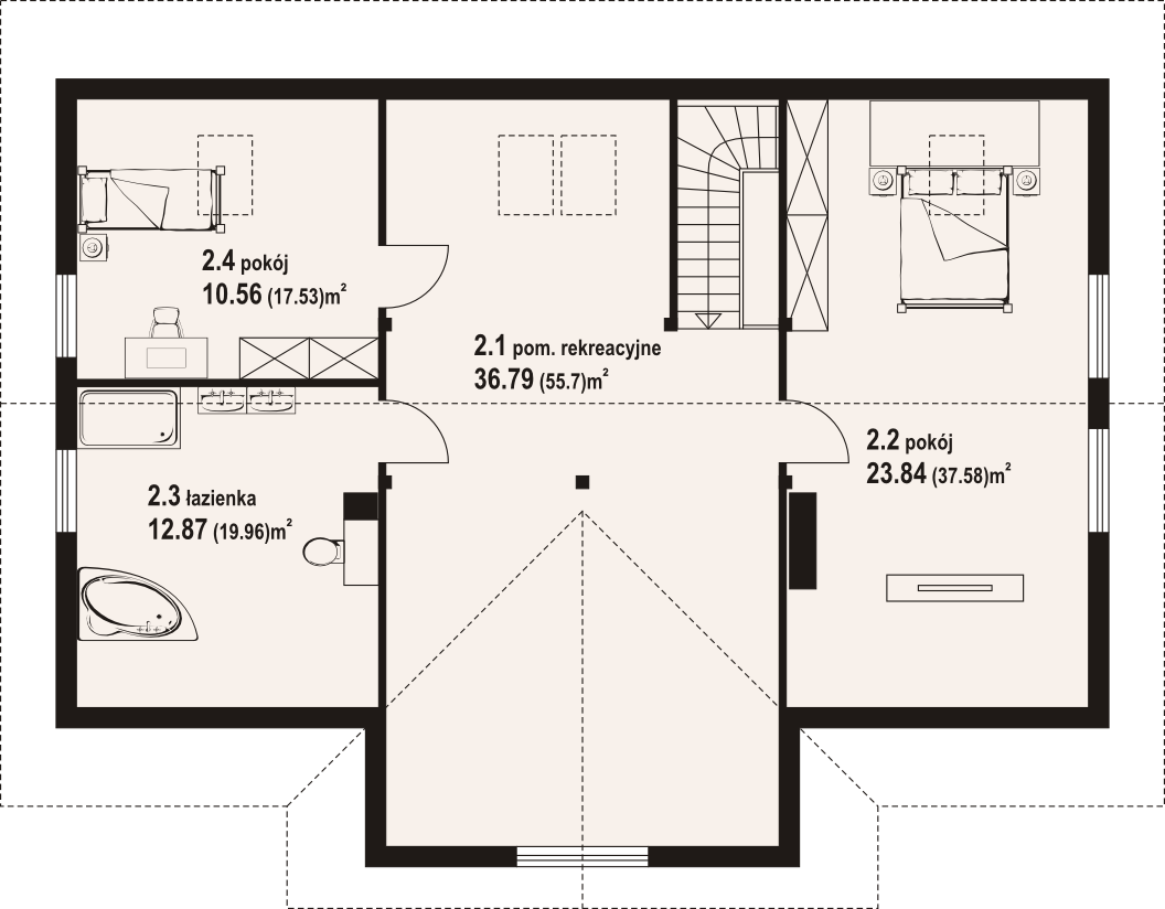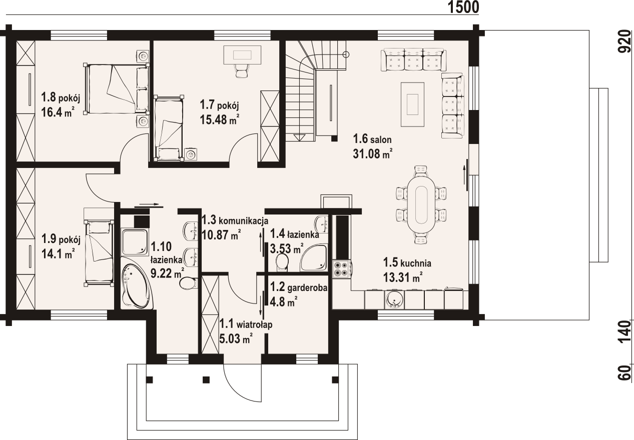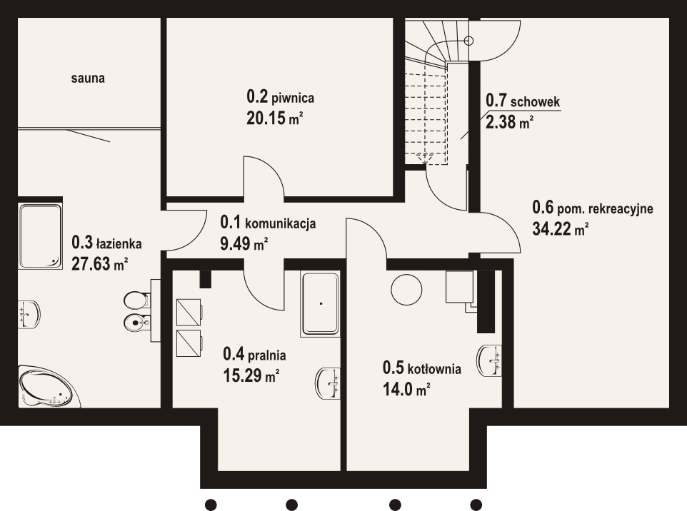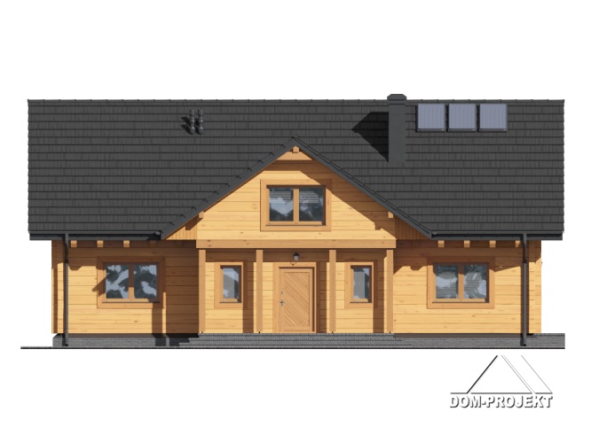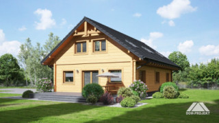 Dom z bali. Podpiwniczony. Duży salon z aneksem kuchennym, kominkiem, schodami na poddasze i wyjściem na taras. Trzy pokoje, dwie łazienki, komunikacja, garderoba i wiatrołap. Na poddaszu dwa pokoje,łazienka i pomieszczenie rekreacyjne. W piwnicach kotłownia, pralnia, łazienka z sauną, piwnica i pomieszczenie rekreacyjne.