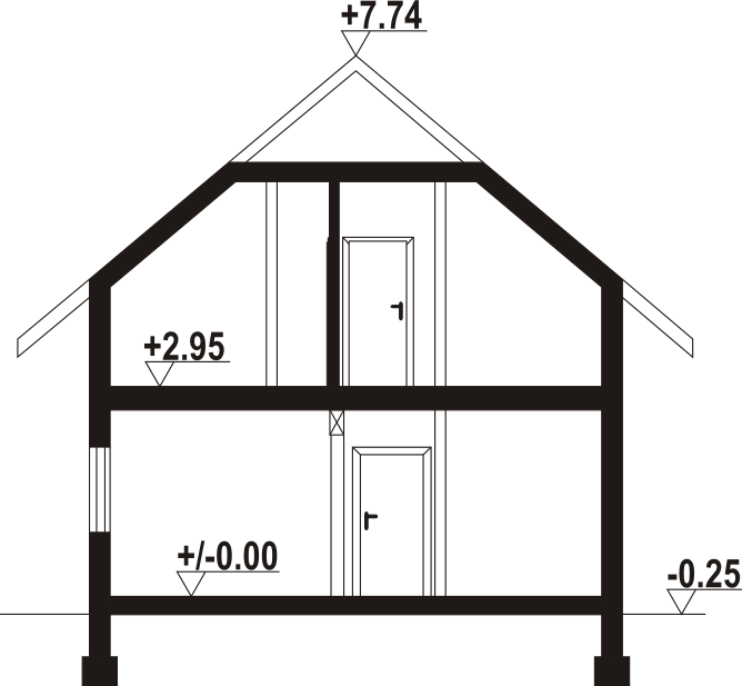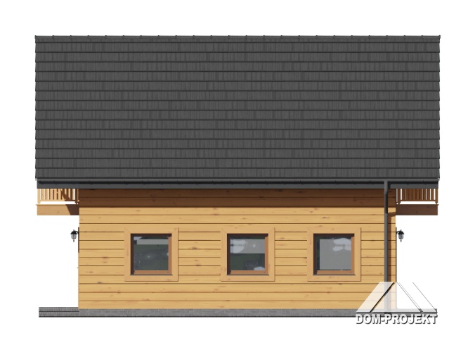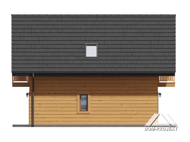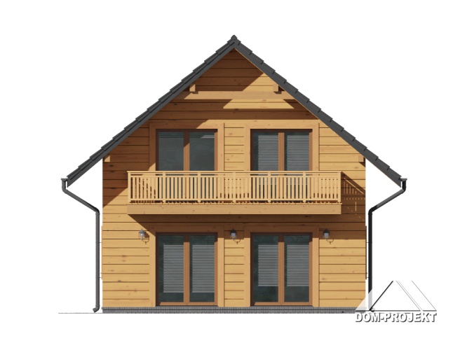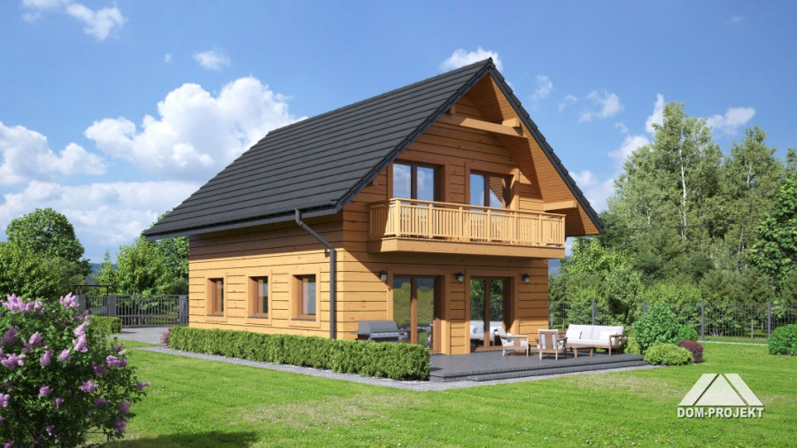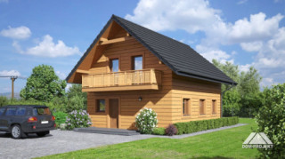 Dom w konstrukcji szkieletu drewnianego. Salon z aneksem kuchennym i wyjściem na taras. Dwa pokoje, łazienka, wc, wiatrołap i pomieszczenie gospodarcze.Na poddaszu trzy pokoje, łazienka, wc, komunikacja i dwa balkony. Zwarta bryła budynku i dach dwuspadowy sprzyjają szybkiej i taniej budowie i niskim kosztom eksploatacji.