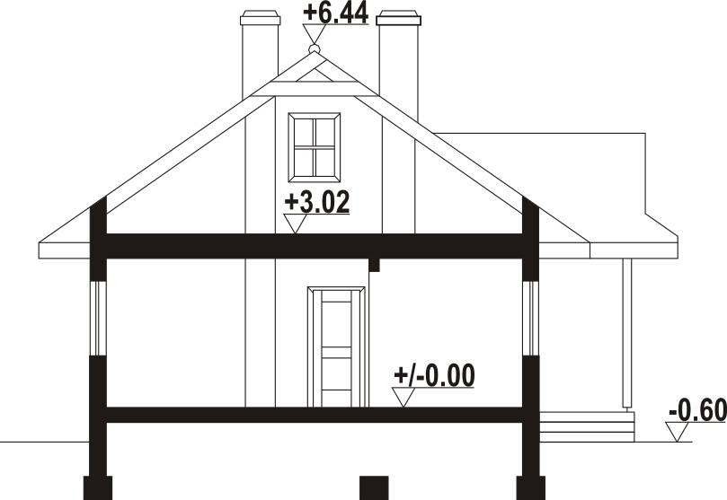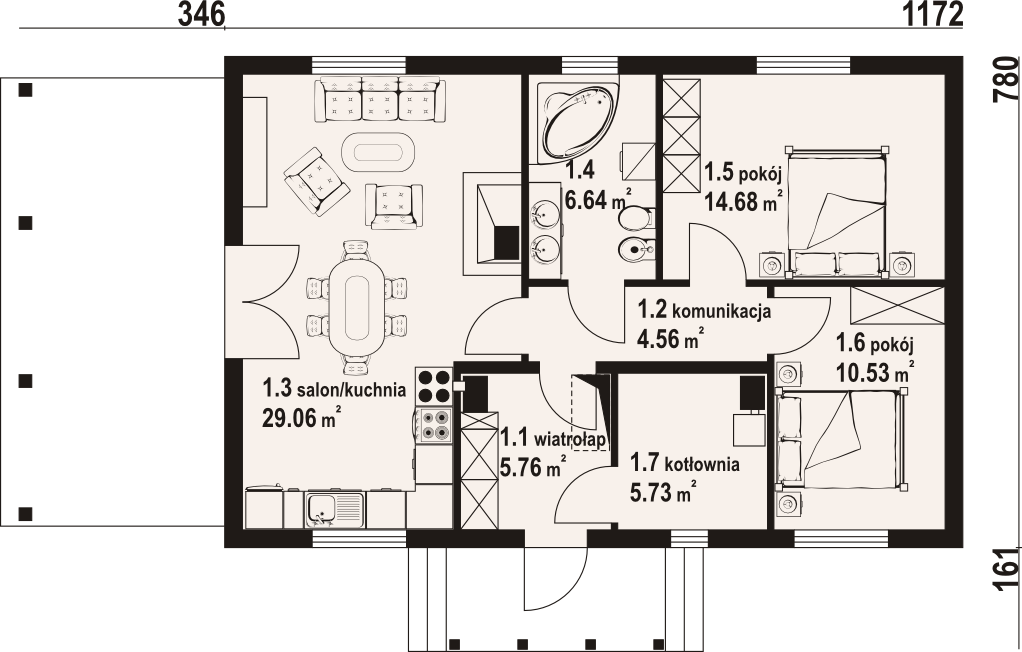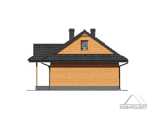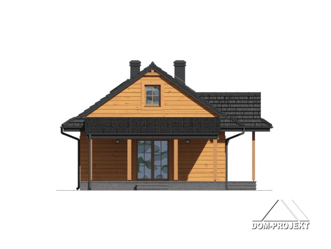 Dom w konstrukcji szkieletu drewnianego. Duży salon z aneksem kuchennym, kominkiem i wyjściem na taras. Dwa pokoje, łazienka, komunikacja, wiatrołap i kotłownia. Poddasze nieużytkowe. Zwarta bryła budynku i dach dwuspadowy sprzyjają szybkiej i taniej budowie i niskim kosztom eksploatacji.
