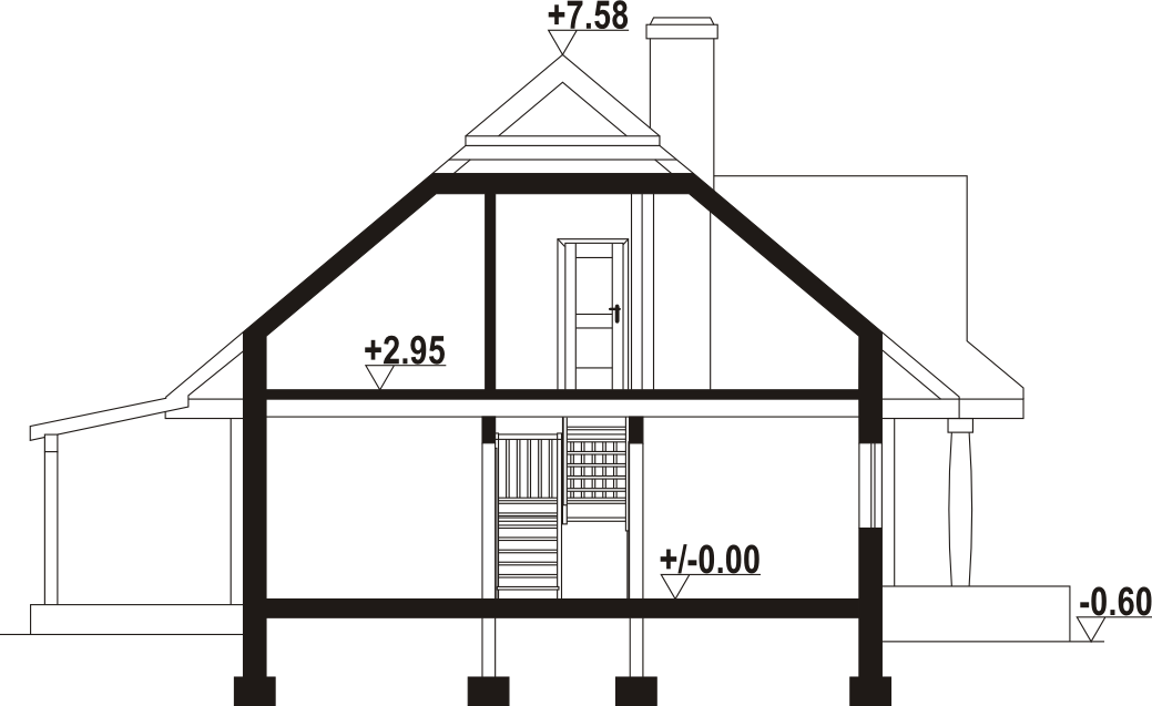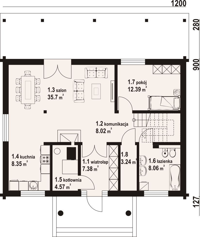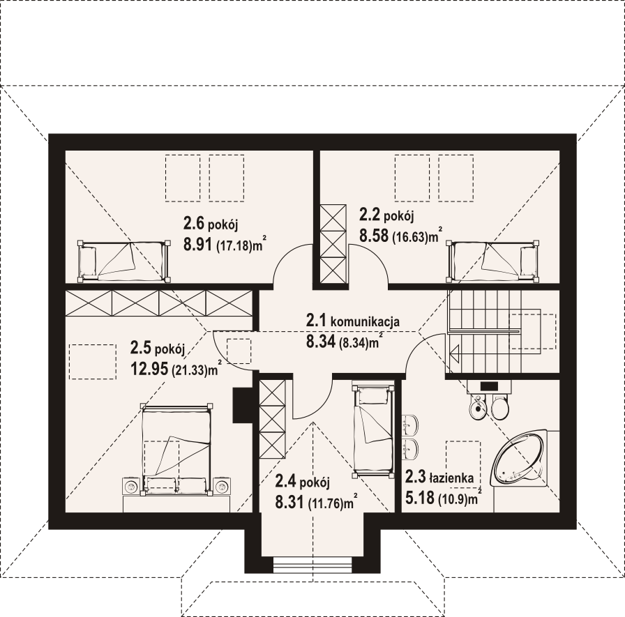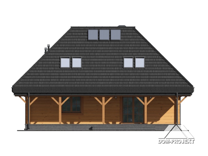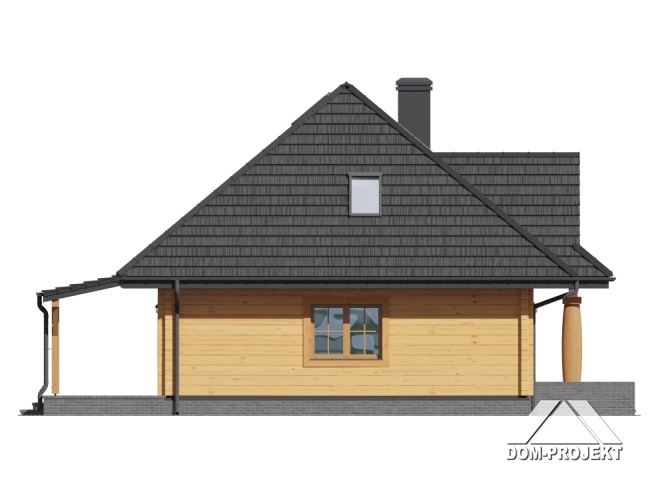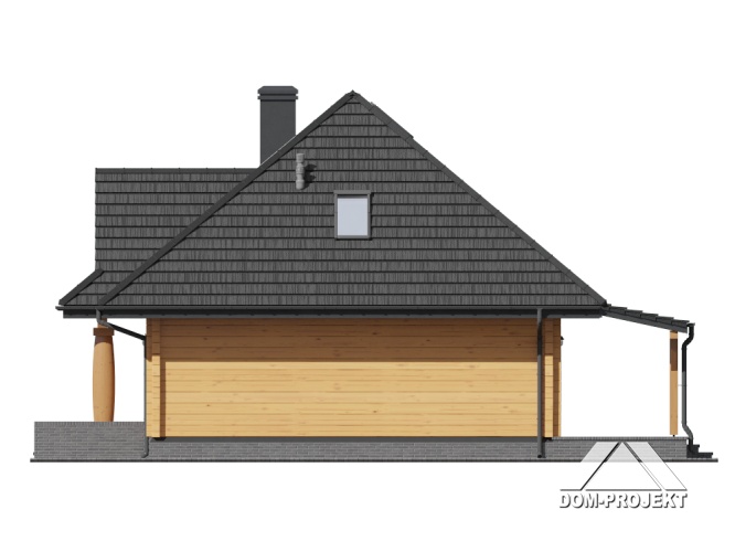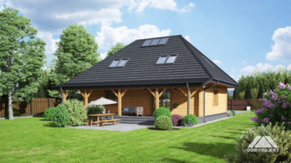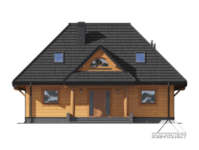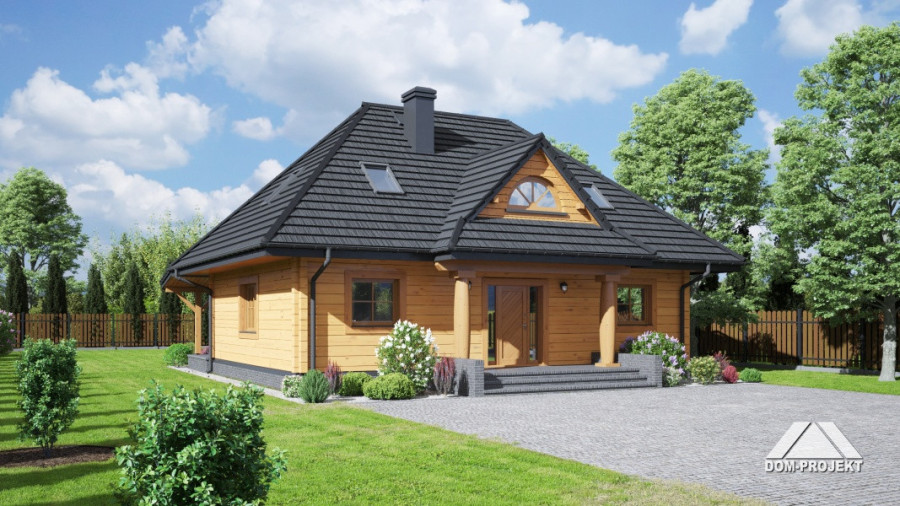 Dom z bali drewnianych. Duży salon z aneksem kuchennym, kominkiem i wyjściem na zadaszony taras. Pokój, łazienka, spiżarka, wiatrołap, kotłownia i schody na poddasze. Na poddaszu cztery pokoje, łazienka i komunikacja.