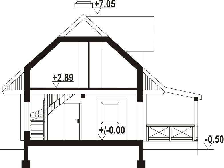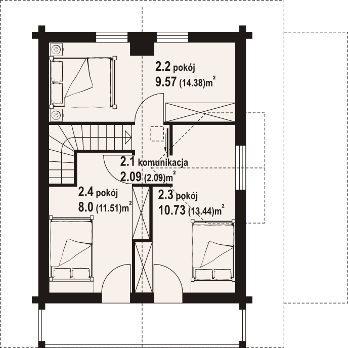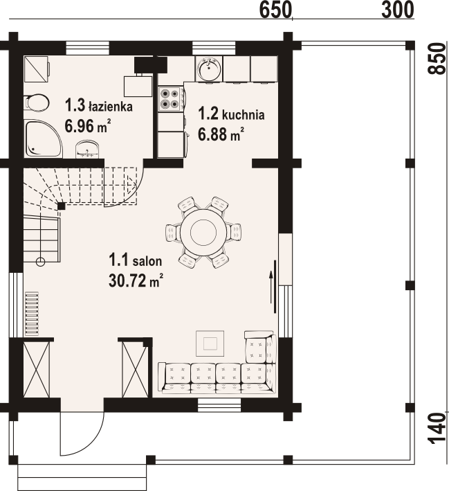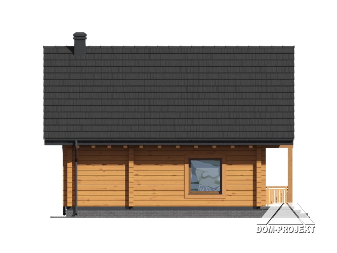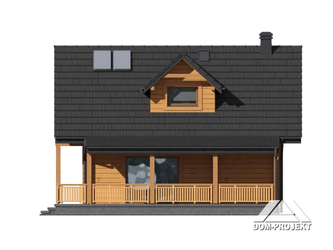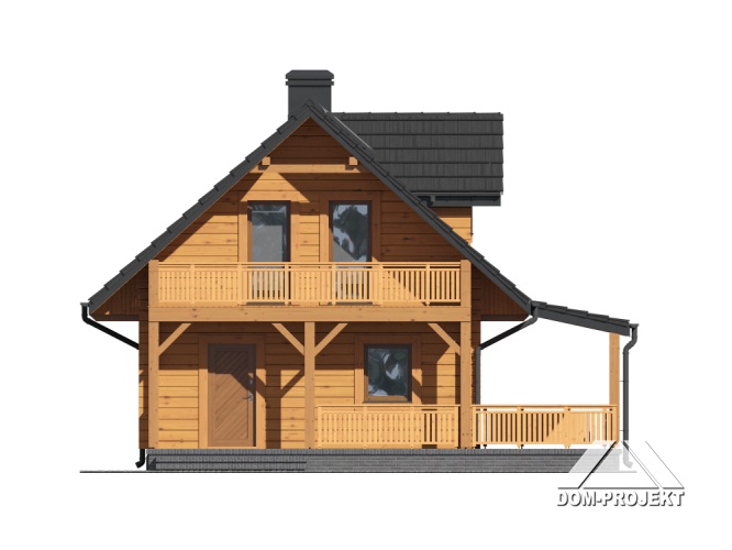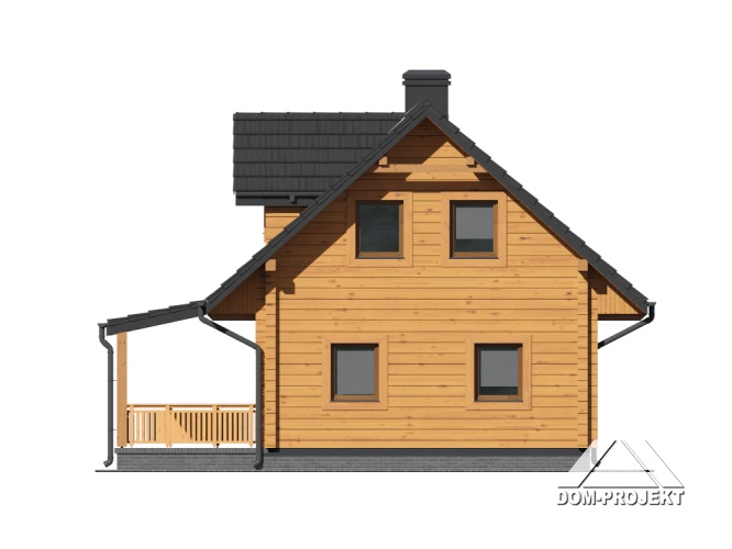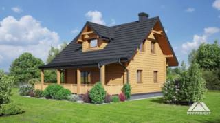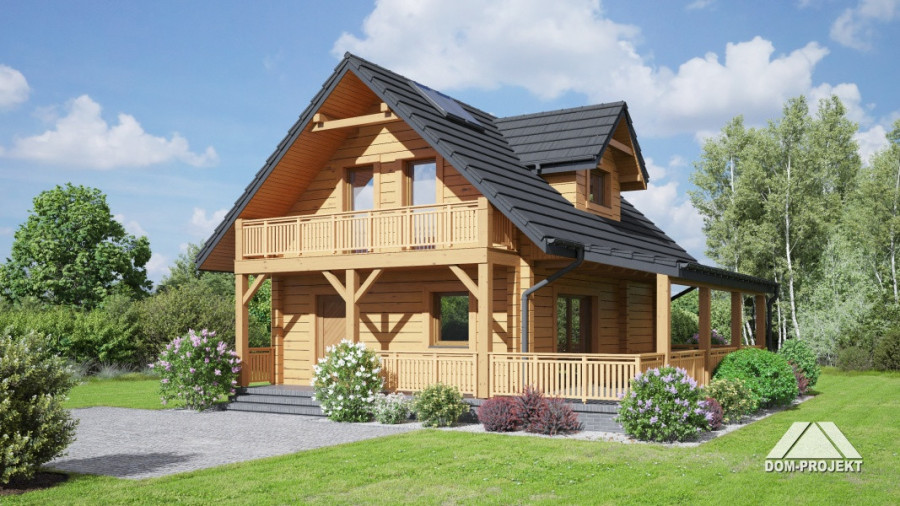 Całoroczny dom z bali. Duży salon z aneksem kuchennym i wyjściem na zadaszony taras. Łazienka i schody na poddasze. Na poddaszu trzy sypialnie, komunikacja i balkon. Zwarta bryła budynku i dach dwuspadowy sprzyjają szybkiej i taniej budowie i niskim kosztom eksploatacji.