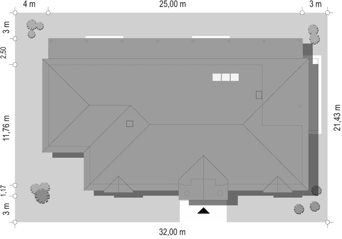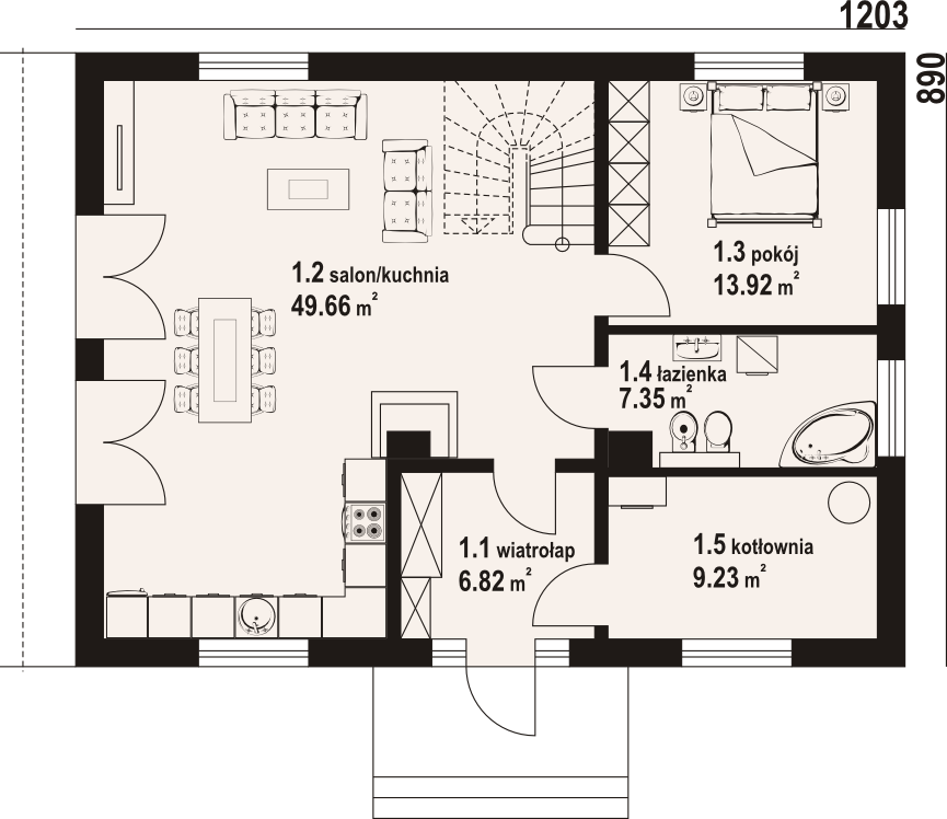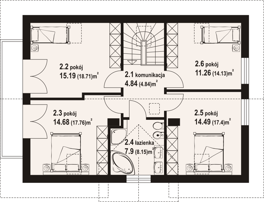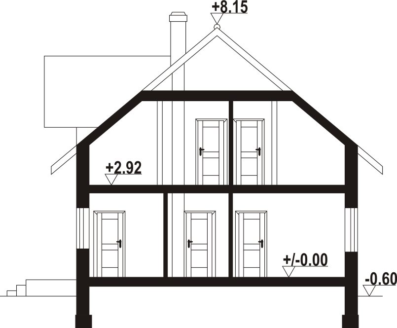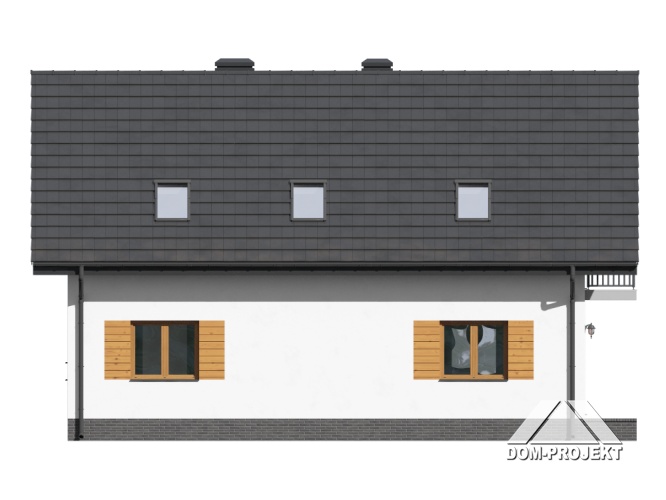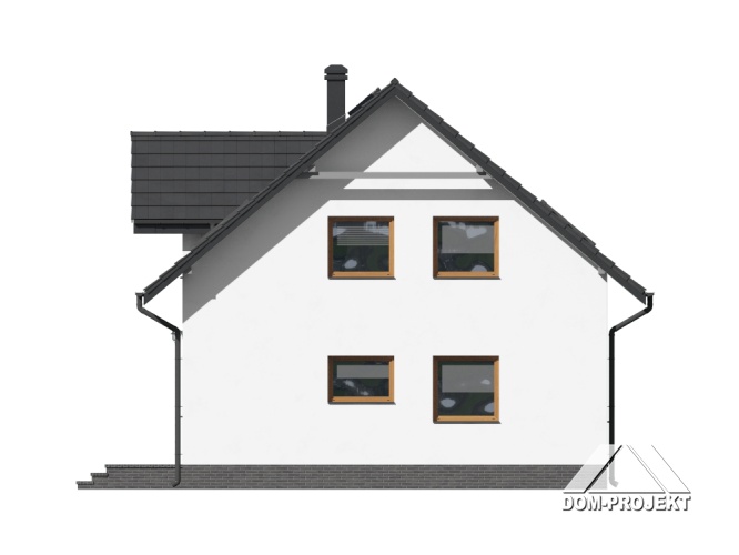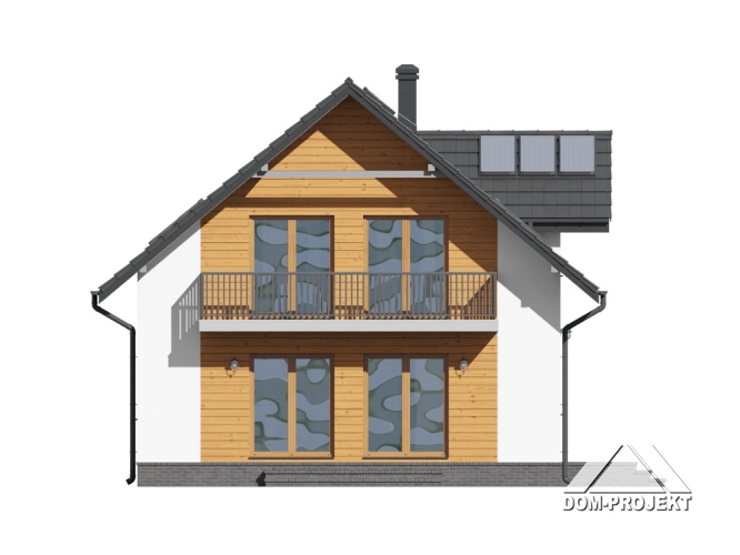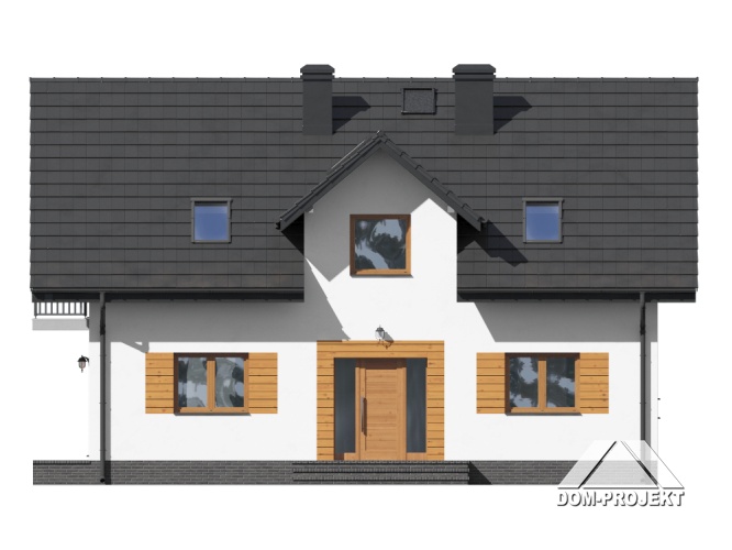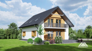 Dom z poddaszem. Duży salon z aneksem kuchennym, kominkiem, schodami na poddasze i wyjściami na taras. Pokój, łazienka, wiatrołap i kotłownia. Na poddaszu cztery pokoje, łazienka, komunikacja i balkon. Zwarta bryła budynku i dach dwuspadowy sprzyjają szybkiej i taniej budowie i niskim kosztom eksploatacji.