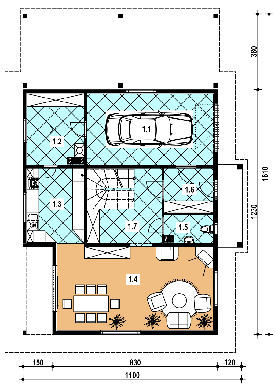 1 garaż 0.00 kotłownia 9.60 kuchnia 10.50 pokój dzienny 31.90 wc 3.30 wiatrołap 5.40 komunikacja 11.90