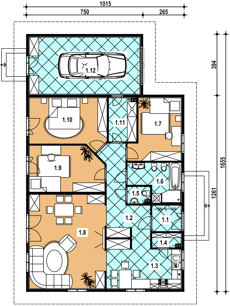 1 wiatrołap 3.10 hall 11.90 kuchnia 12.50 spiżarka 1.70 wc 1.50 łazienka 6.90 sypialnia 11.80 pokój dzienny 29.10 sypialnia 13.60 sypialnia 15.00 pom. gospodarcze 5.10 garaż 0.00