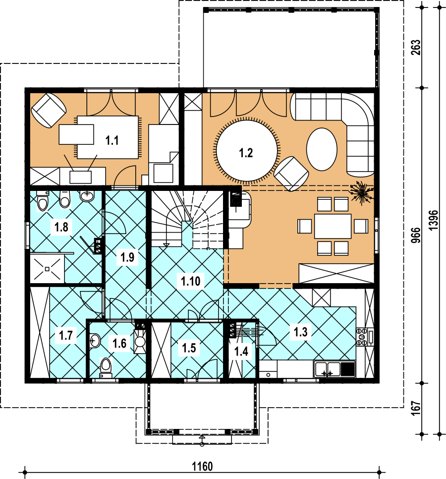 1 sypialnia 13.90 pokój dzienny 32.50 kuchnia 11.30 spiżarka 1.40 wiatrołap 4.10 wc 3.10 garderoba 5.50 łazienka 6.70 komunikacja 5.70 hall 7.70