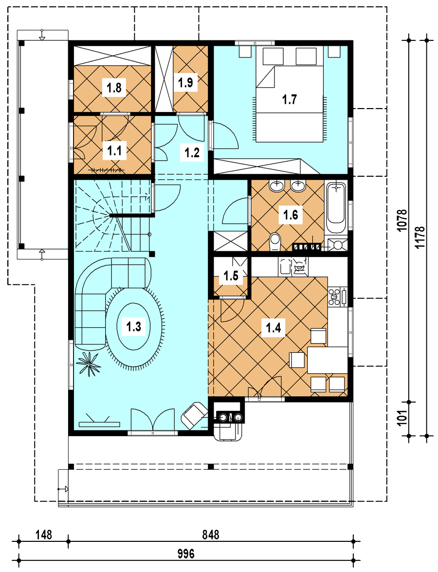 1 wiatrołap 3.80 hall 7.60 pokój dzienny 23.70 kuchnia 14.70 spiżarka 1.20 łazienka 5.70 sypialnia 14.40 pom. gospodarcze 4.10 garderoba 3.00
