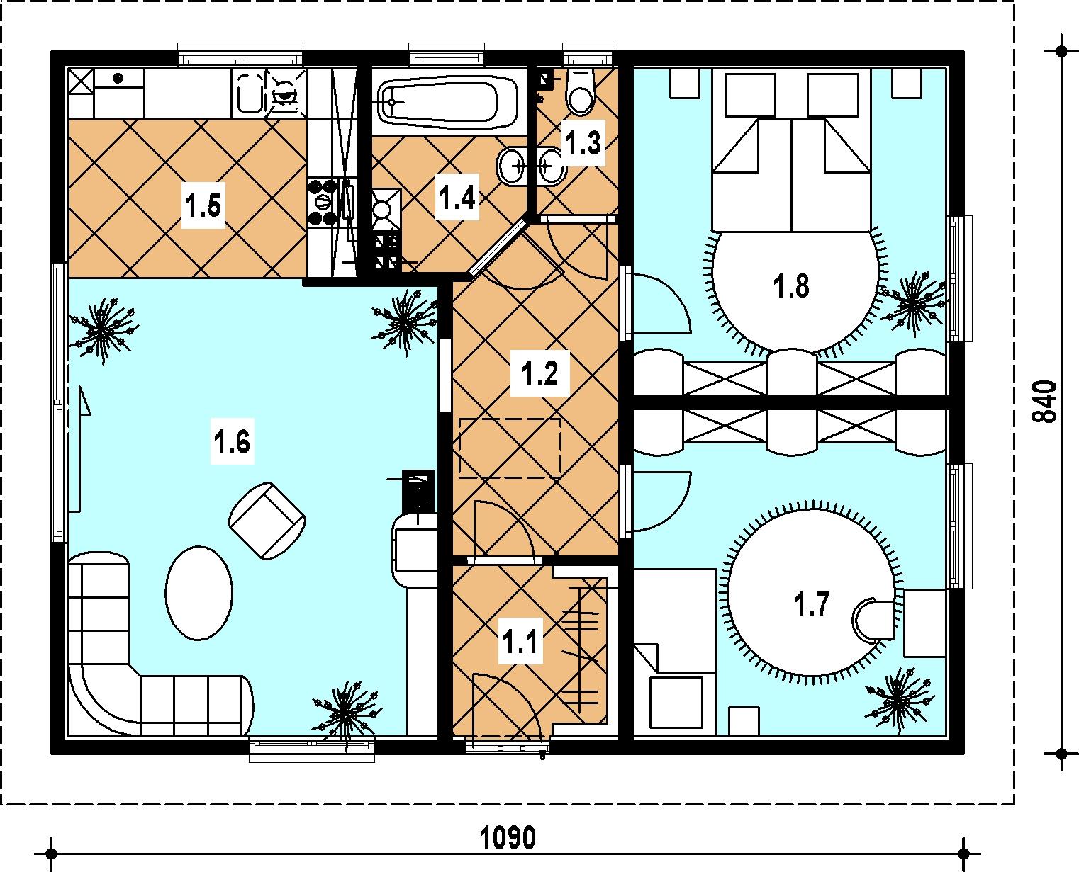 1 wiatrołap 4.00 hall 7.60 wc 1.70 łazienka 3.80 kuchnia 8.20 pokój dzienny 22.90 sypialnia 14.10 sypialnia 14.10