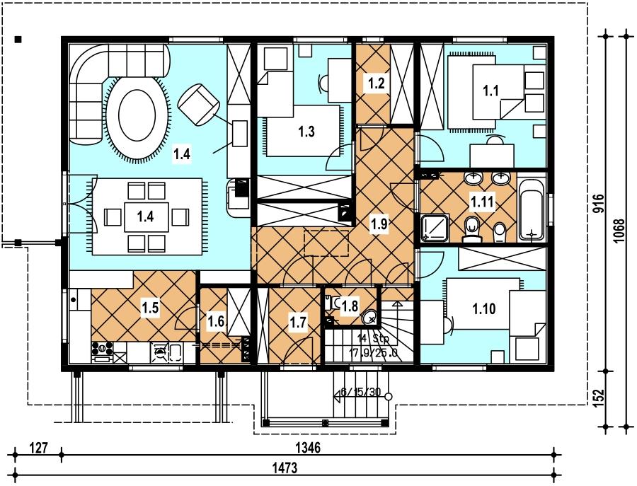 1 sypialnia 11.10 garderoba 3.40 sypialnia 10.50 pokój dzienny 30.70 kuchnia 8.60 spiżarka 2.60 wiatrołap 3.30 wc 1.40 komunikacja 12.30 sypialnia 10.50 łazienka 6.30