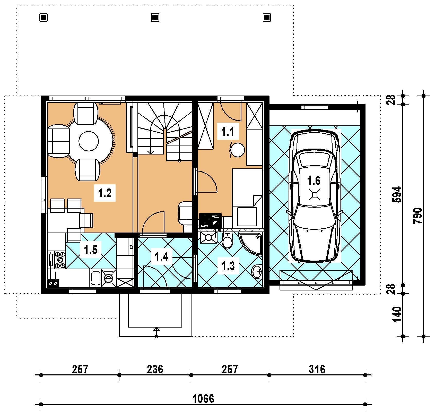 1 sypialnia 8.00 pokój dzienny 17.70 łazienka 3.60 wiatrołap 2.80 kuchnia 4.20 garaż 0.00