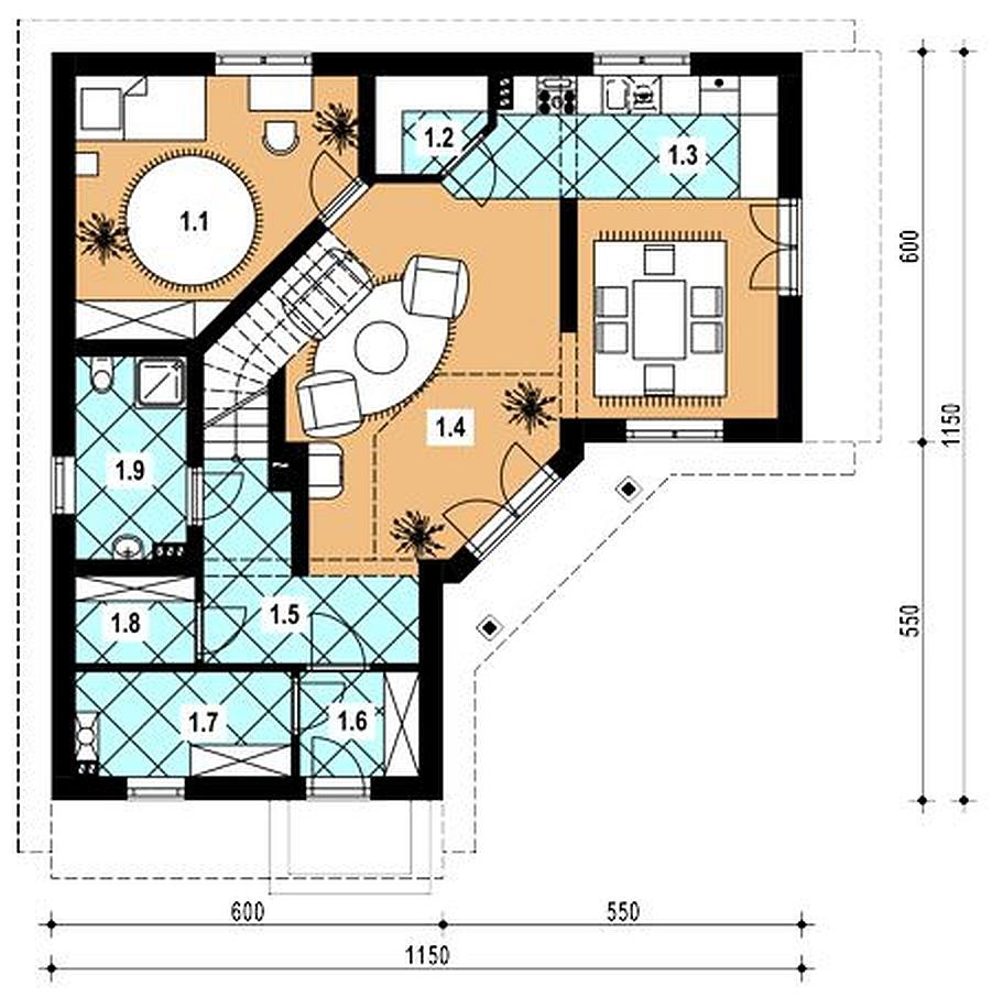 1 sypialnia 14.50 spiżarka 2.40 kuchnia 8.60 pokój dzienny 32.30 hall 6.80 wiatrołap 3.00 pom. gospodarcze 5.30 pom. gospodarcze 2.50 łazienka 5.30