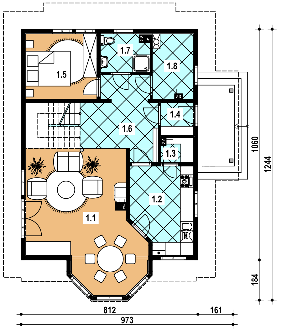 1 pokój dzienny 27.40 kuchnia 10.40 spiżarka 1.60 wiatrołap 2.10 sypialnia 9.40 hall 13.80 łazienka 3.70 pom.gospodarcze 5.30