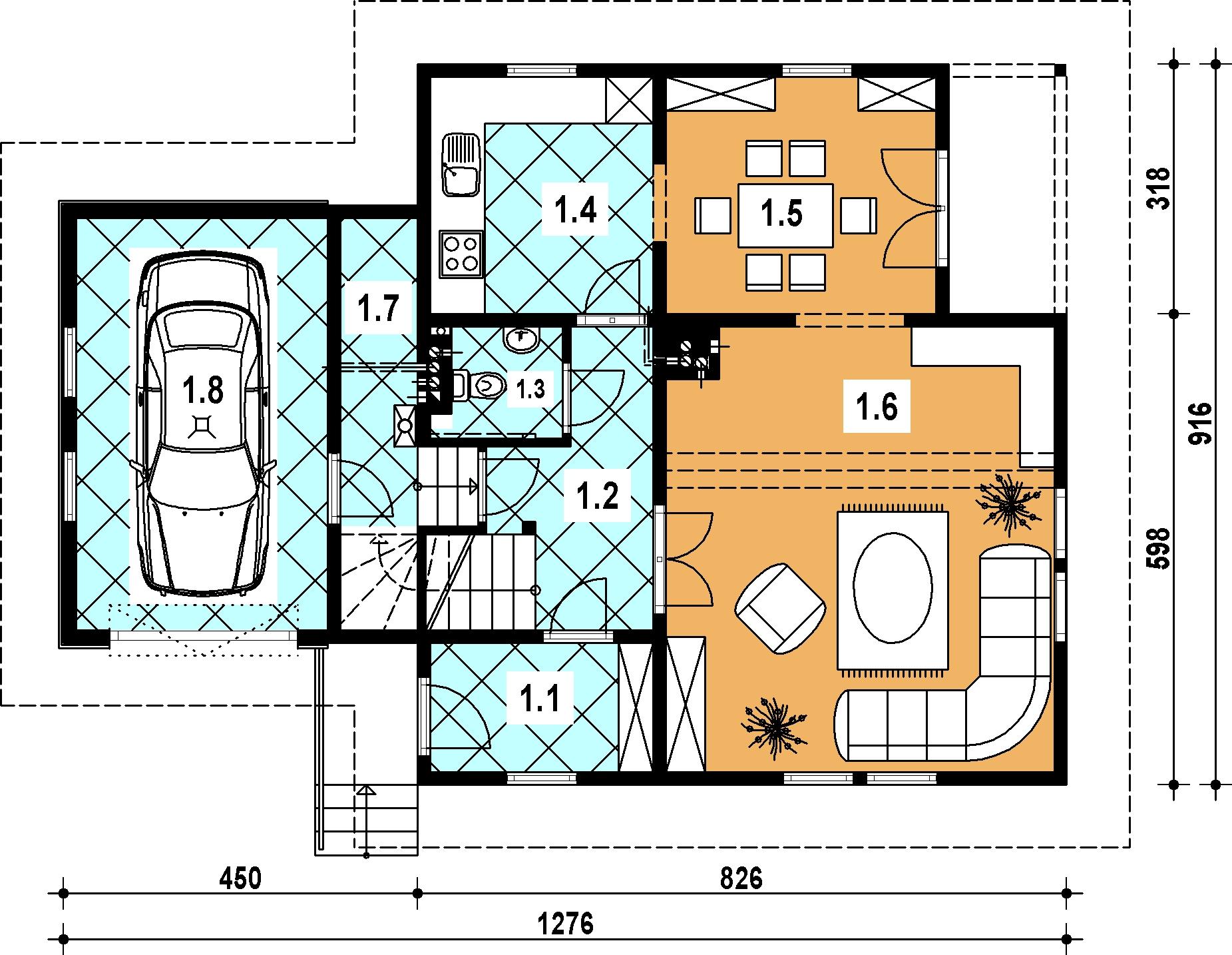 1 wiatrołap 4.10 hall 7.50 wc 2.10 kuchnia 8.00 jadalnia 9.60 pokój dzienny 26.10 pom. gospodarcze 4.90 garaż 0.00
